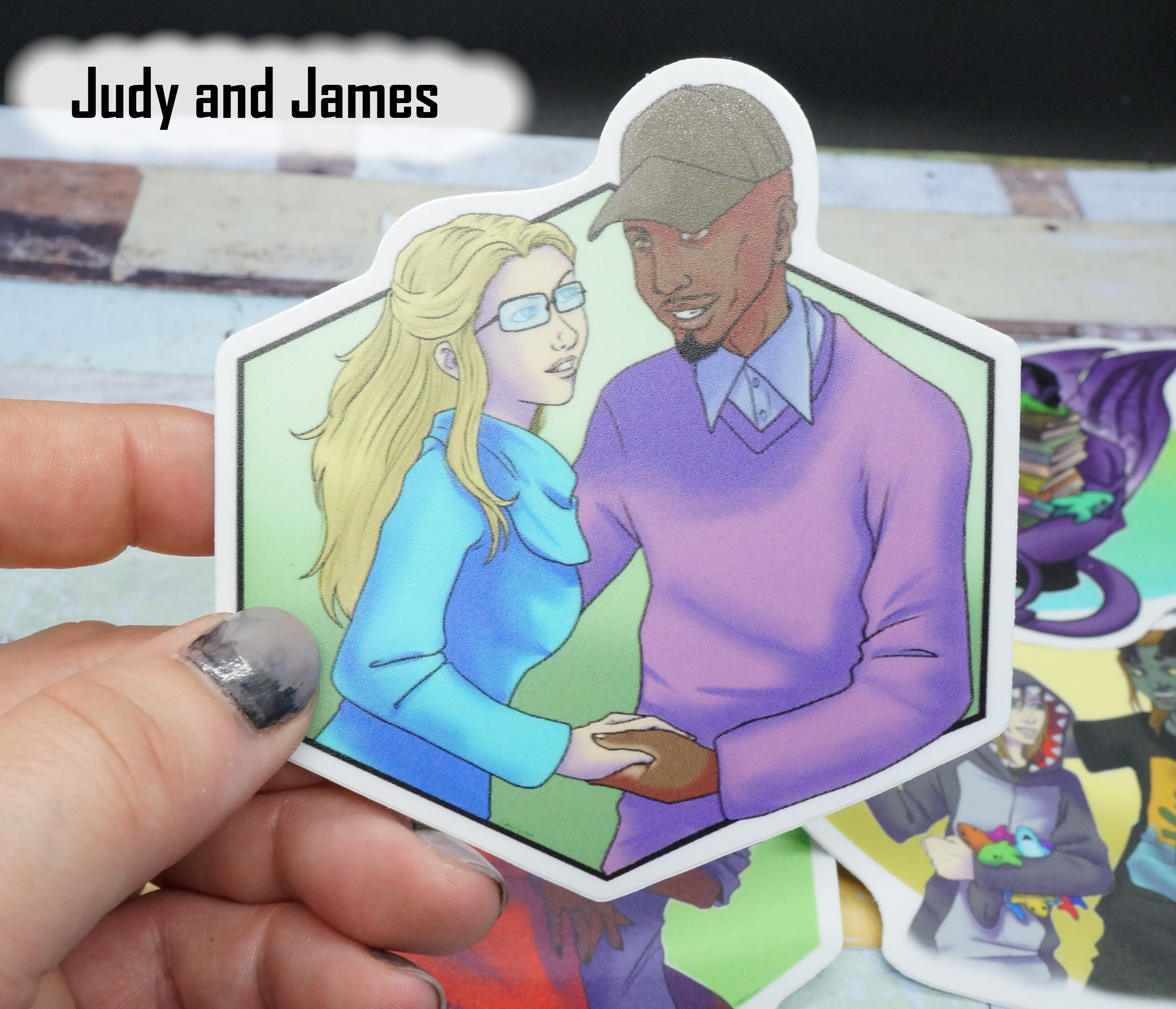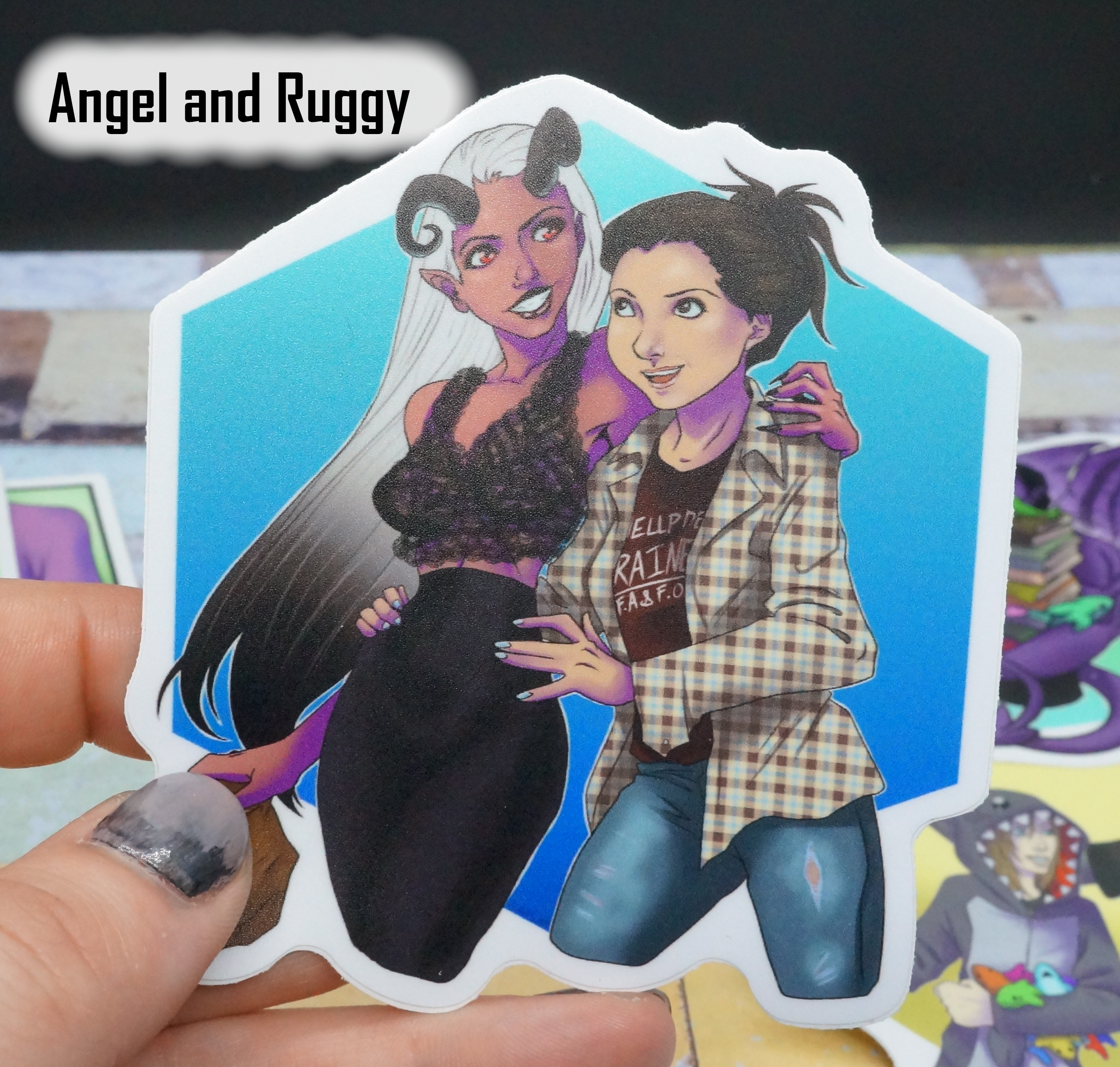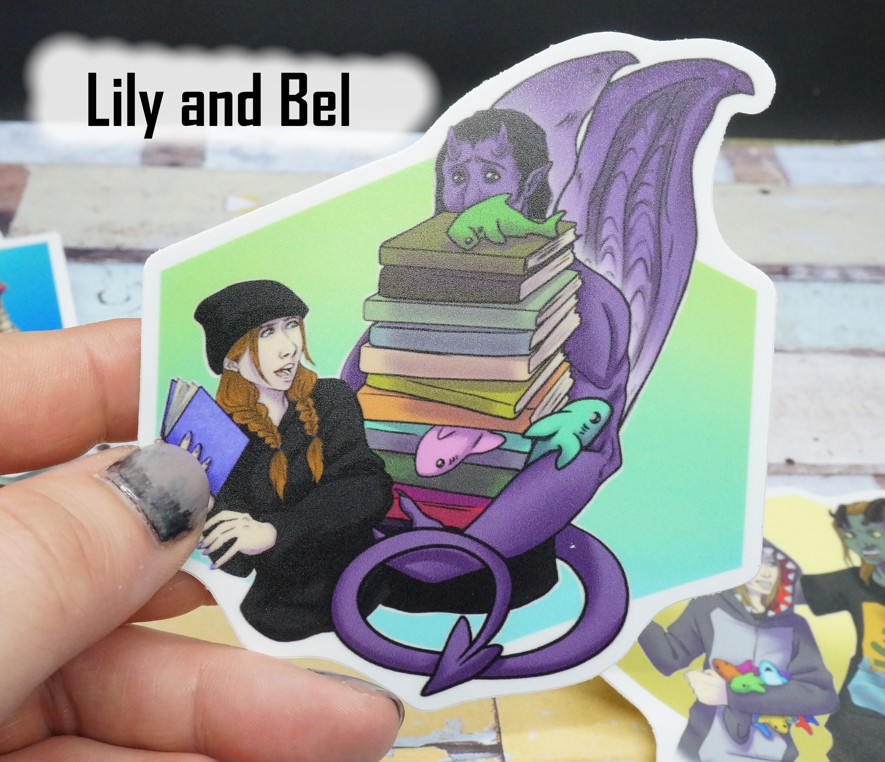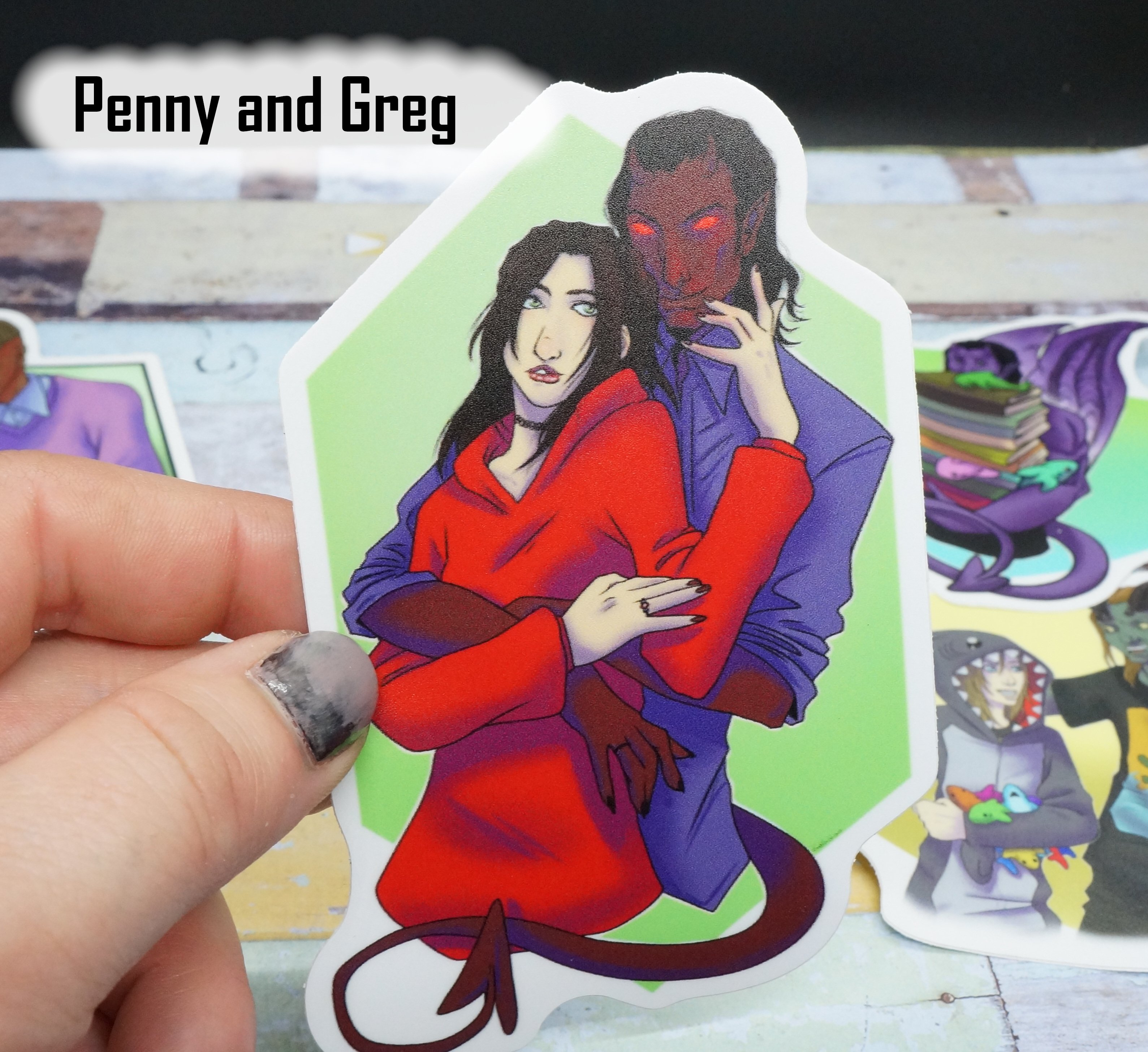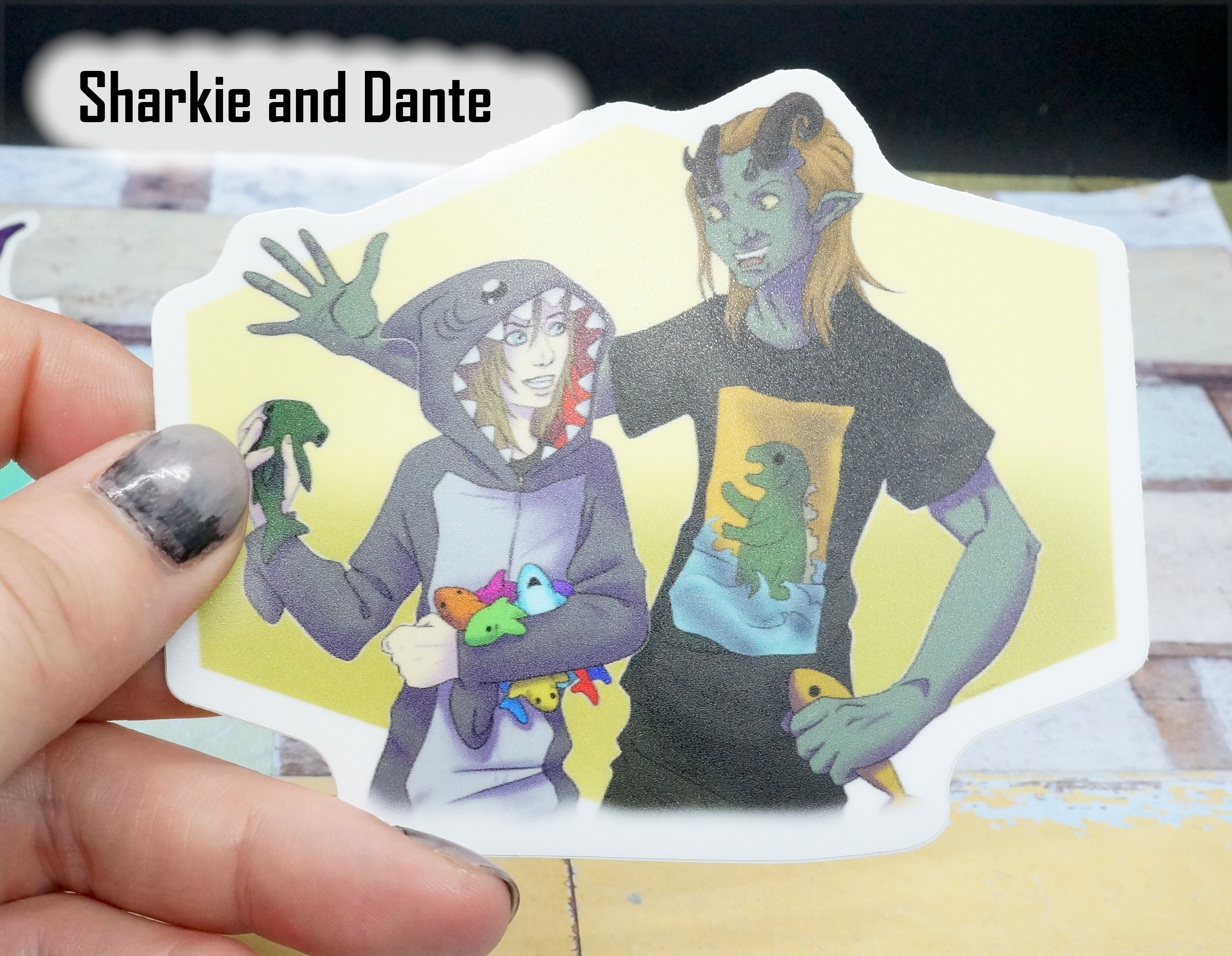 5 different stickers of various Hell's Belles couples and friends. These stickers are about 3.5 to 4 inches, matte finish. You can choose which character stickers you want or from the gift set available. Gift set option comes with: Sharkie Window Cling, Sharkie large sticker, Lily and crew post card art print, all 5 souples/pals stickers and 3 inch matte sticker of Cupcake, Franklin and Chainsaw, as well as sticker sheets of Chainsaw.