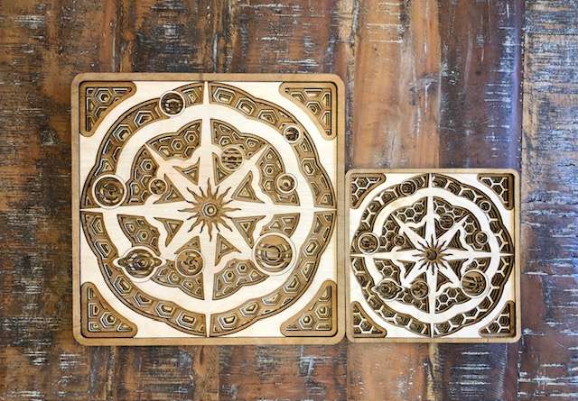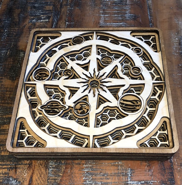 This is a laser cut, layered wood piece that stands upright on flat surfaces. it stance about 6.5" tall and is about 6.5" wide.