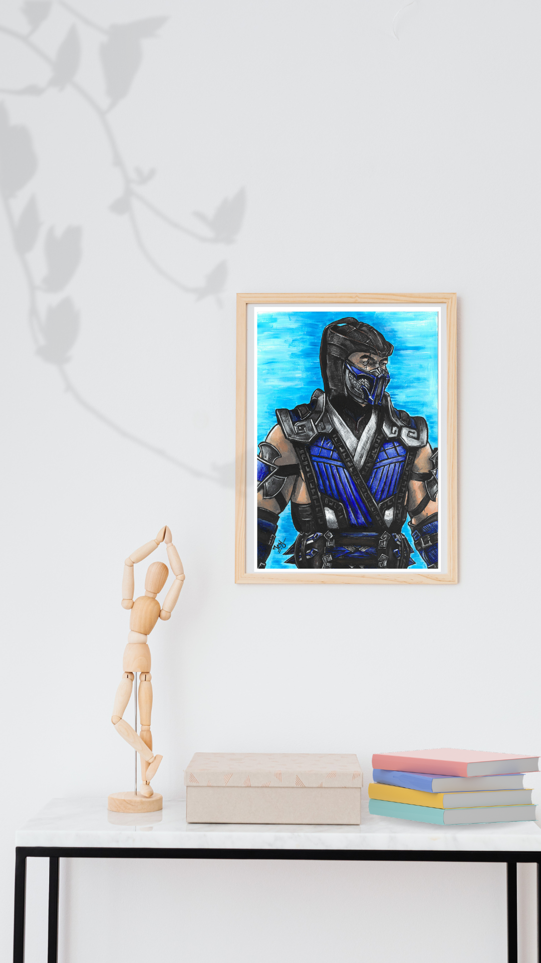 High quality art print of my acrylic painting, Sub Zero from Mortal Kombat. Printed on 300 g/m² acid free textured fine art paper, made of 100% cotton with matt coating. The paper is free of white makers and also complies with ISO 9706, which means that the paper can be stored for at least 100 years. It has a strong watercolor structured surface and is explicitly suitable for fine-art reproduction.