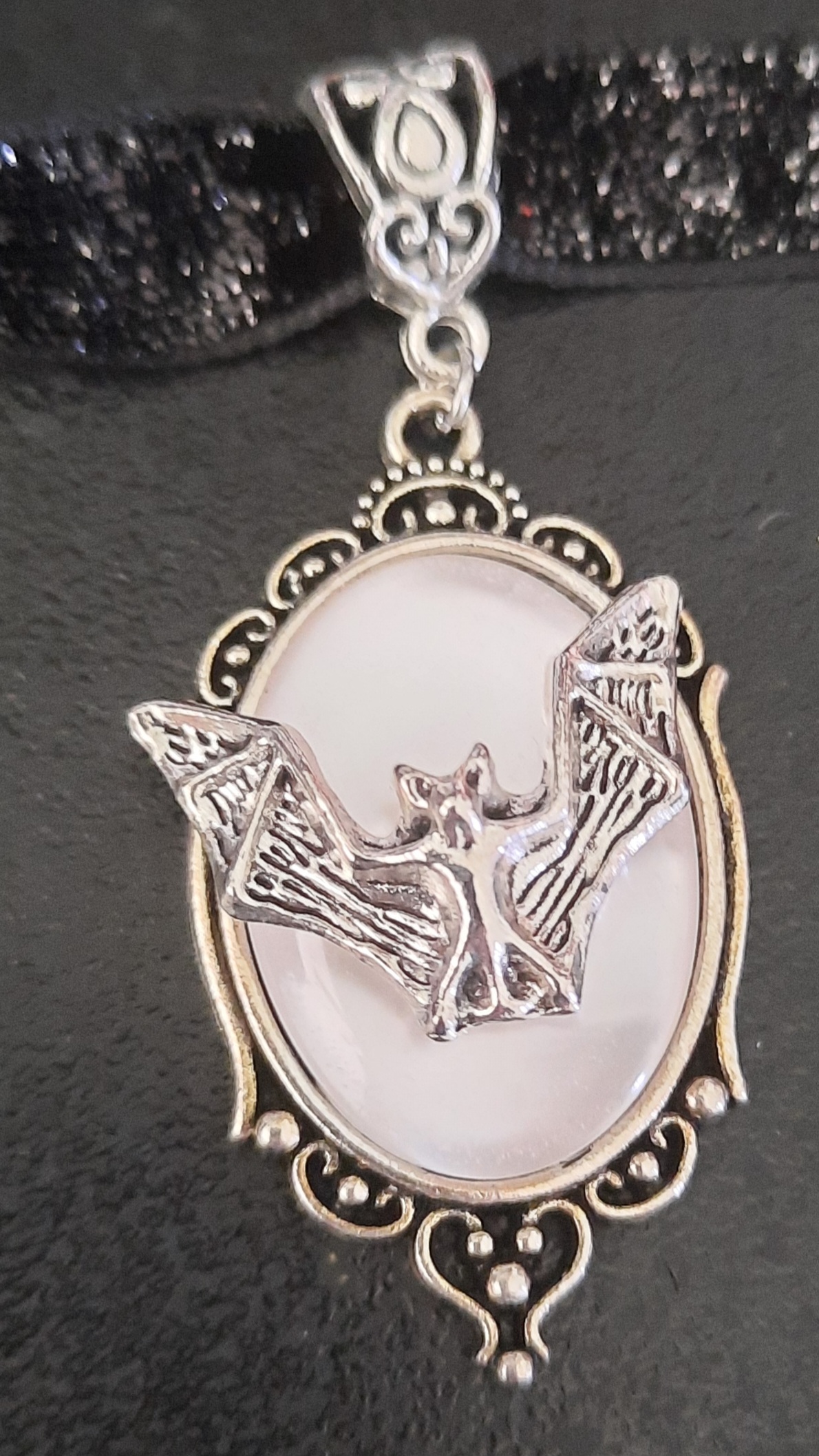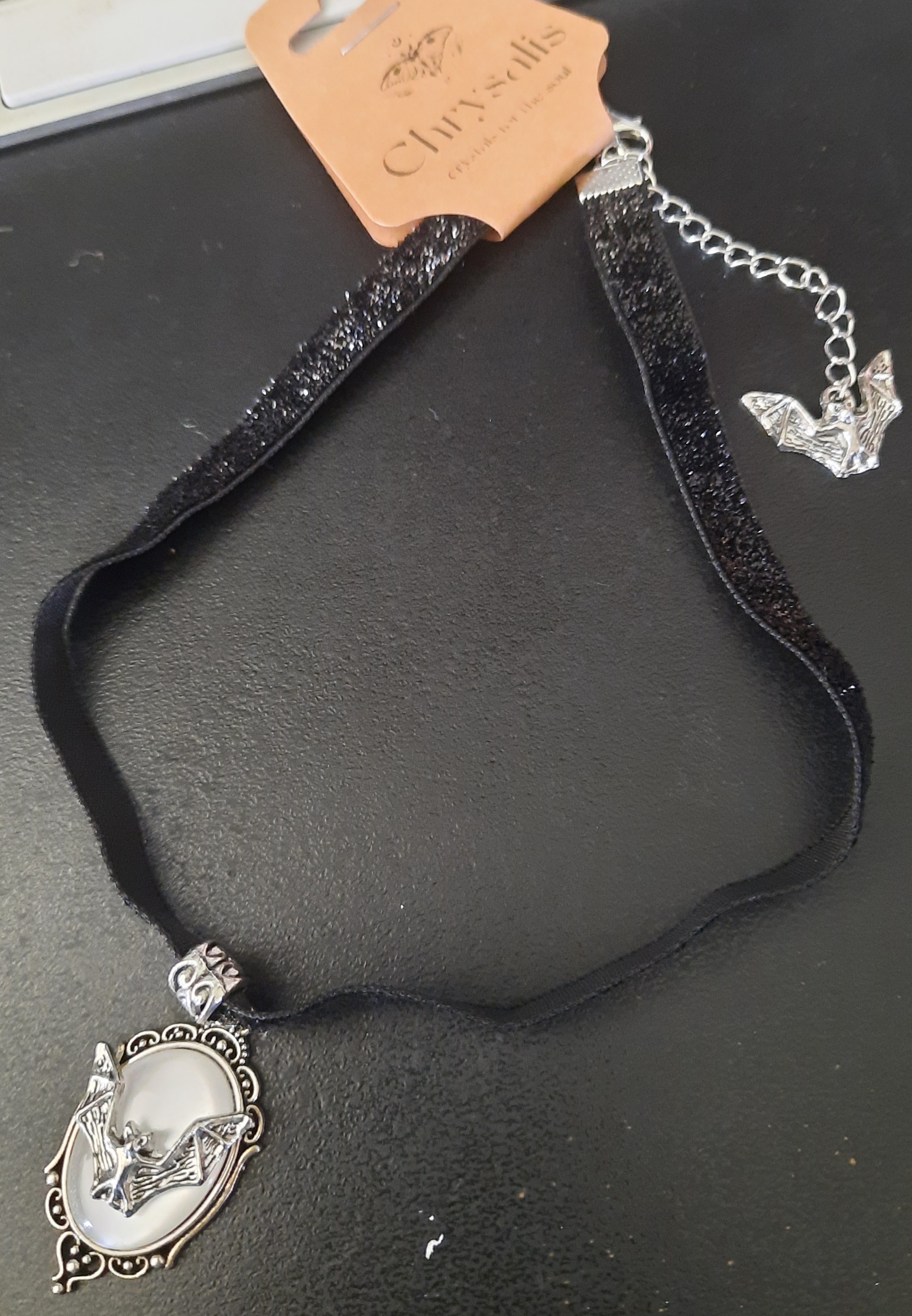 Victorian style metal and glass choker with sparkly velveteen ribbon and a bat charm. 15 inches, extendable to 17.75 inches.