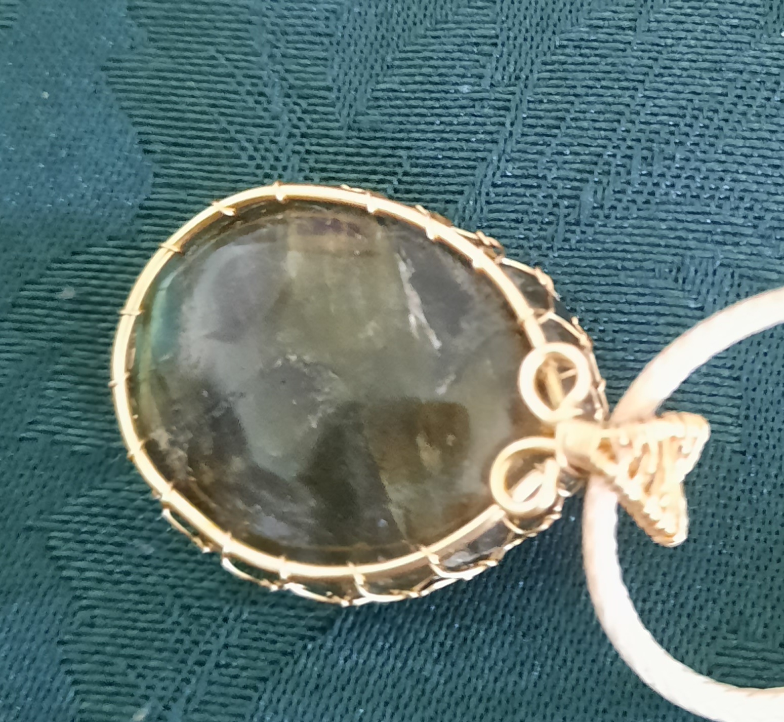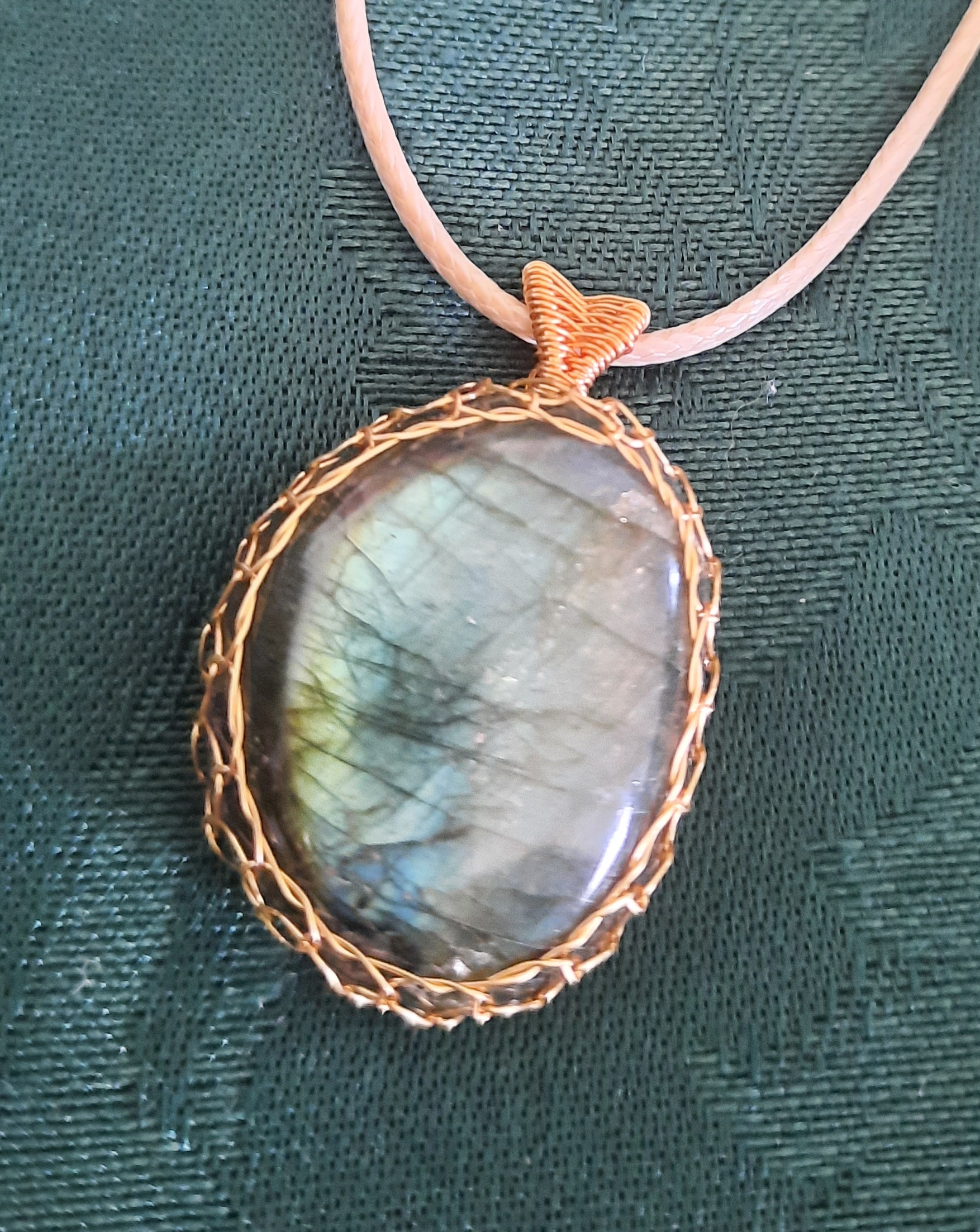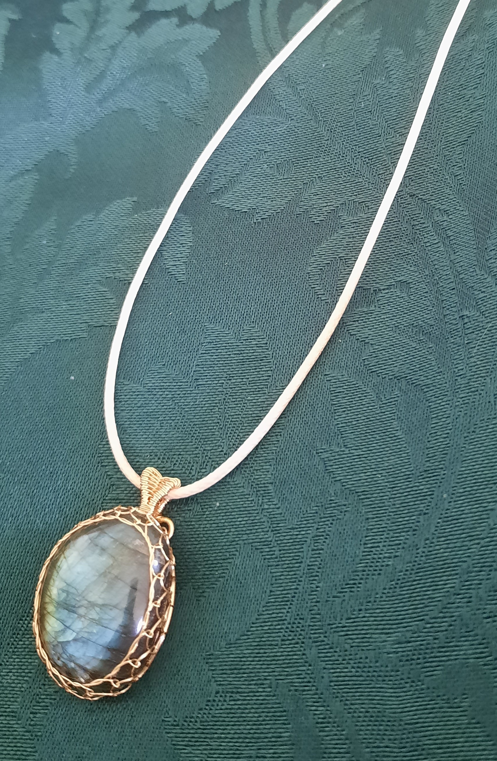 Beautiful Labradorite pendant sturdily wrapped in fine gold wire. Bright blue and green flash of the stone does not come thru in the photos. Comes with 22 inch tan cord.