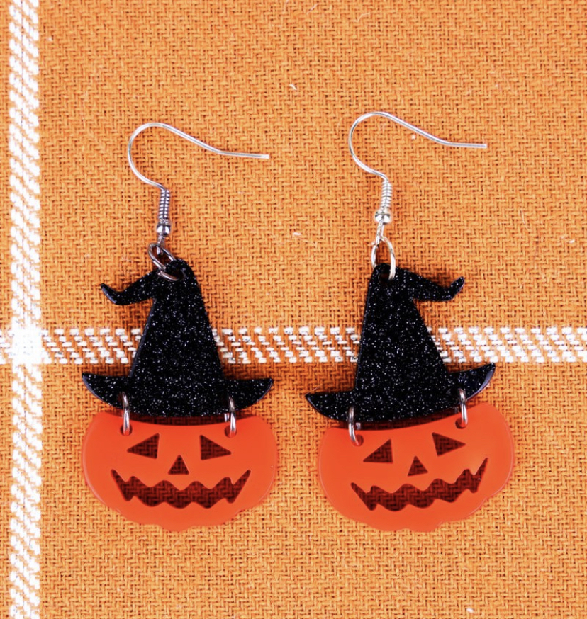 Get Halloween ready with these spooky fun earrings! Plastic Construction Silvertone Hardware Linked Glittery Black Witch's Hat and Cut-Out Orange Jack-O'-Lantern Design 2.25" Fish Hook Style Earrings with 1.75" Drop