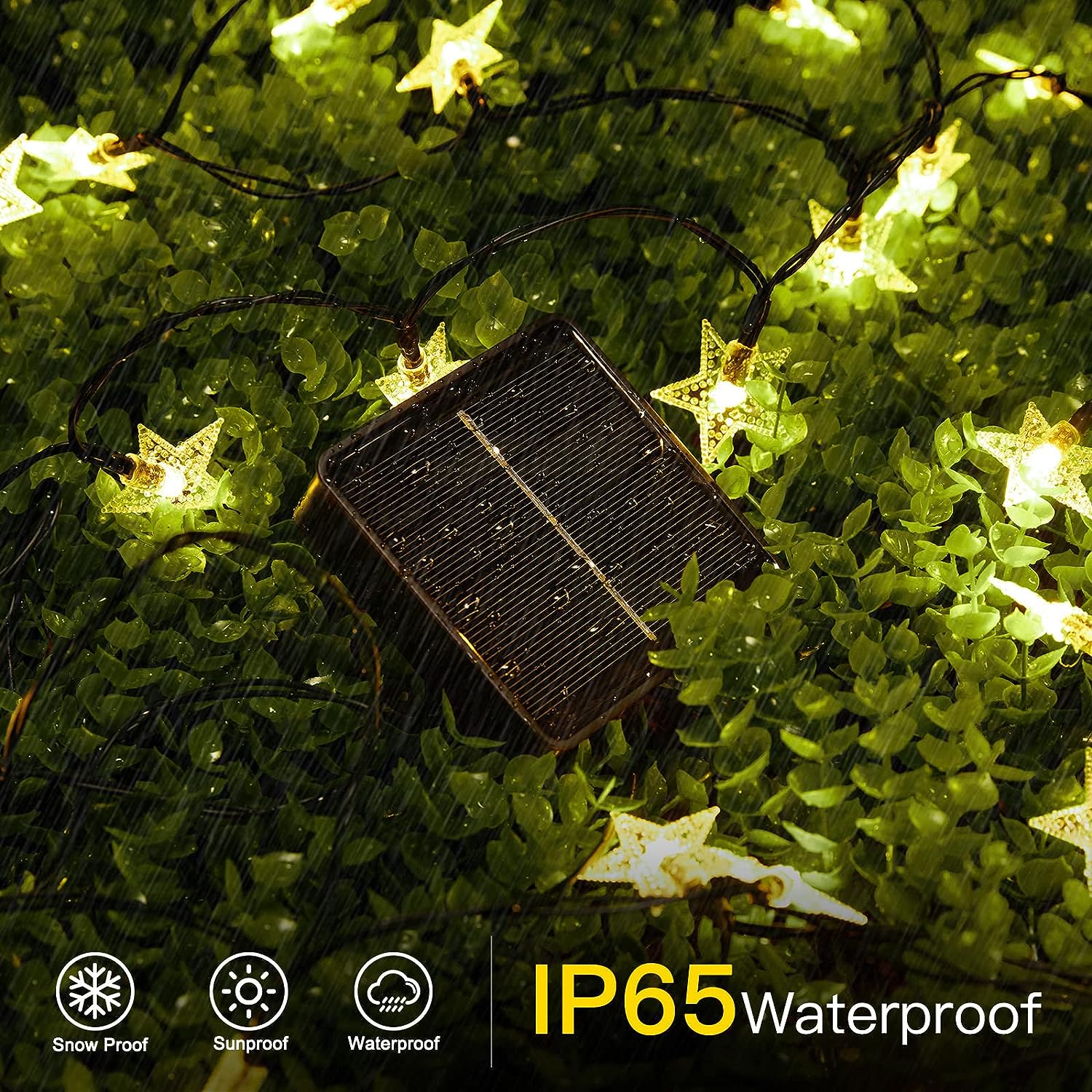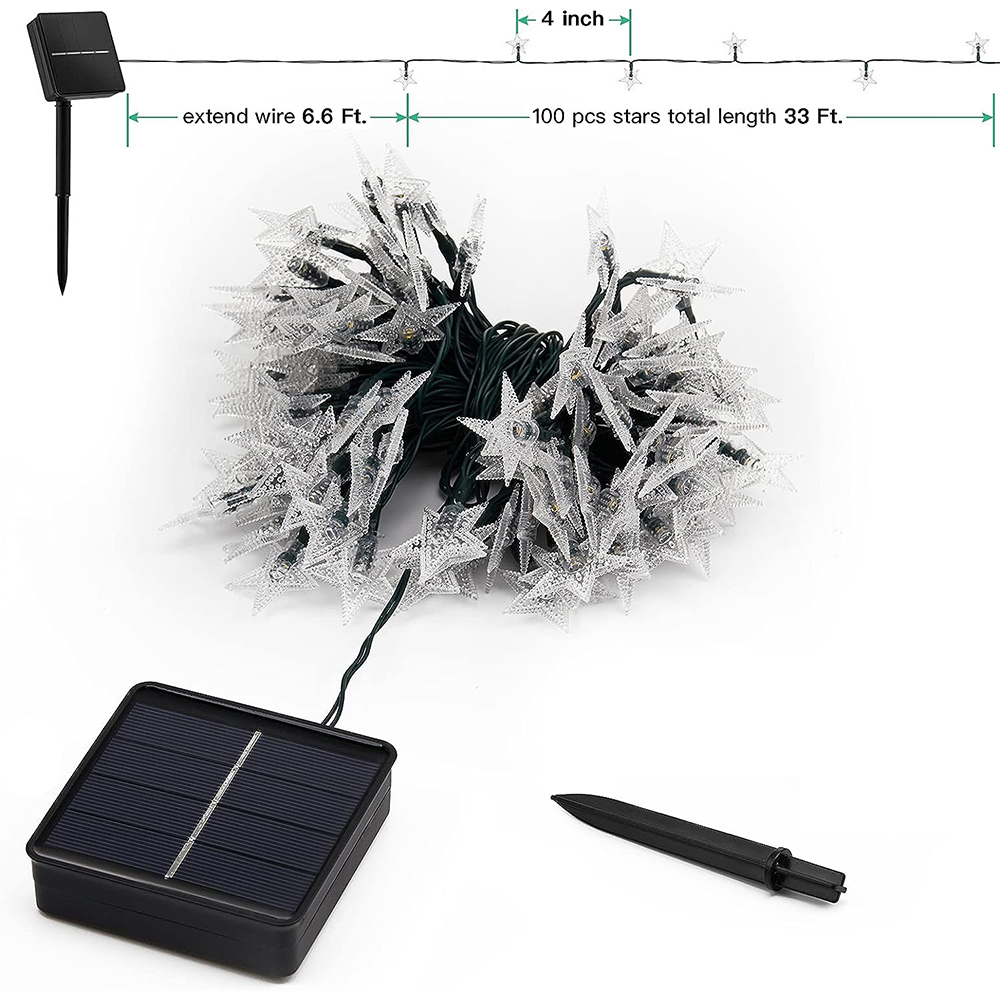 High quality solar string lights outdoor waterproof: These solar star string lights with durable flexible cord and 100 warm white starry twinkle lights like the stars in sky, creating a galaxy sky view and cozy ambience for home, garden, lawn or holiday.