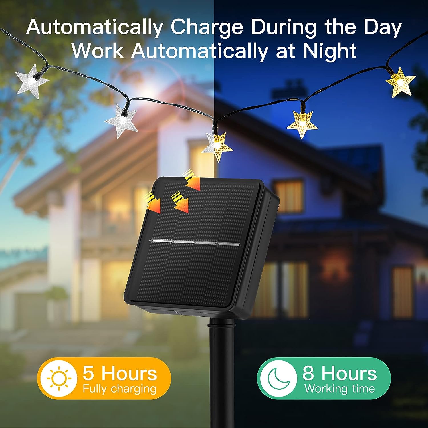 Auto on/off & energy saving lights: Solar crystal ball string lights charged by solar energy, without electric cost and no need to replace the battery. Solar panel with the light sensor controls function, which can make the twinkle lights auto light at night and auto off at daytime.