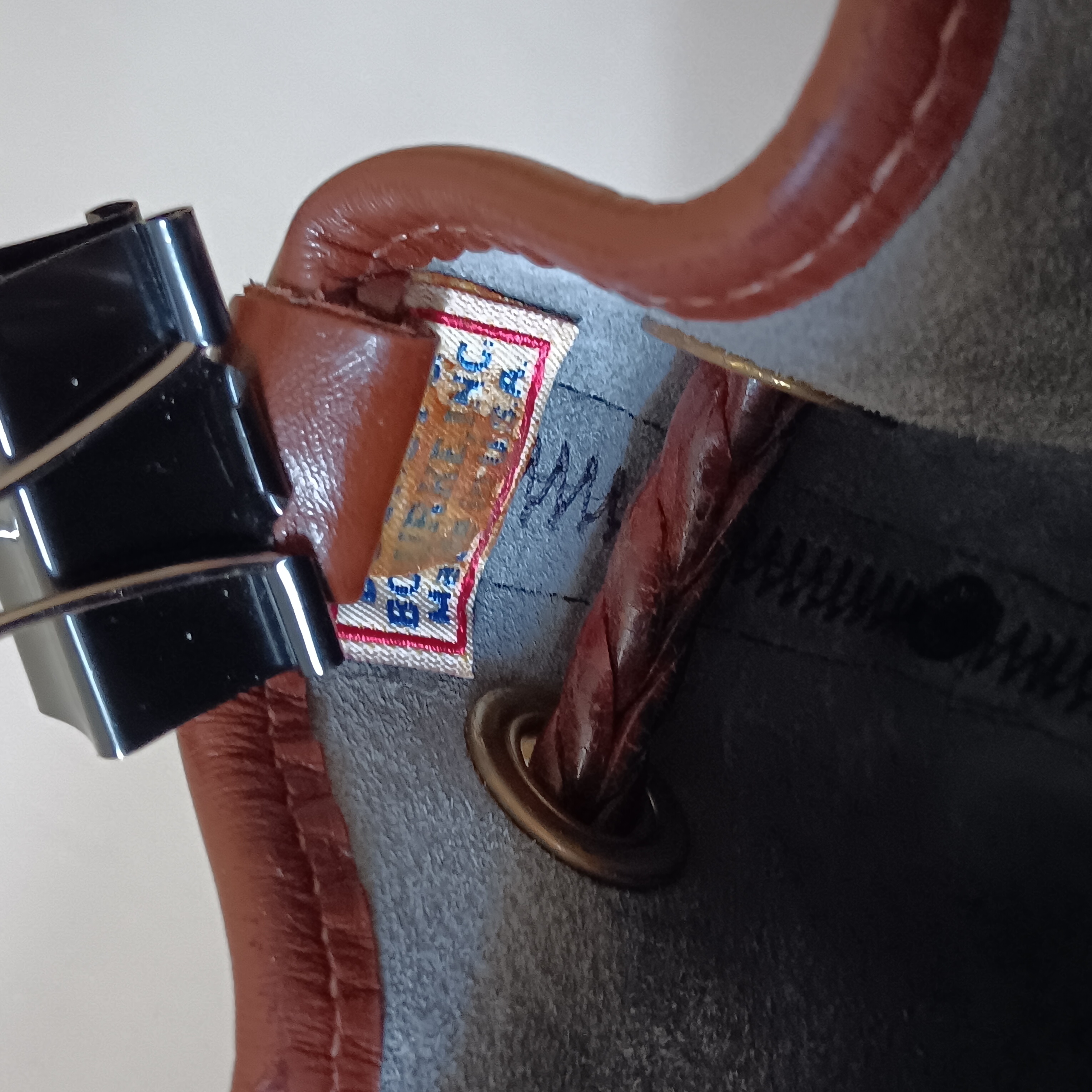 Body of the bag is good. LIght scratches across the front. Faded areas and ink marks inside due to the age of the bag. Still a beautiful piece and a striking color!