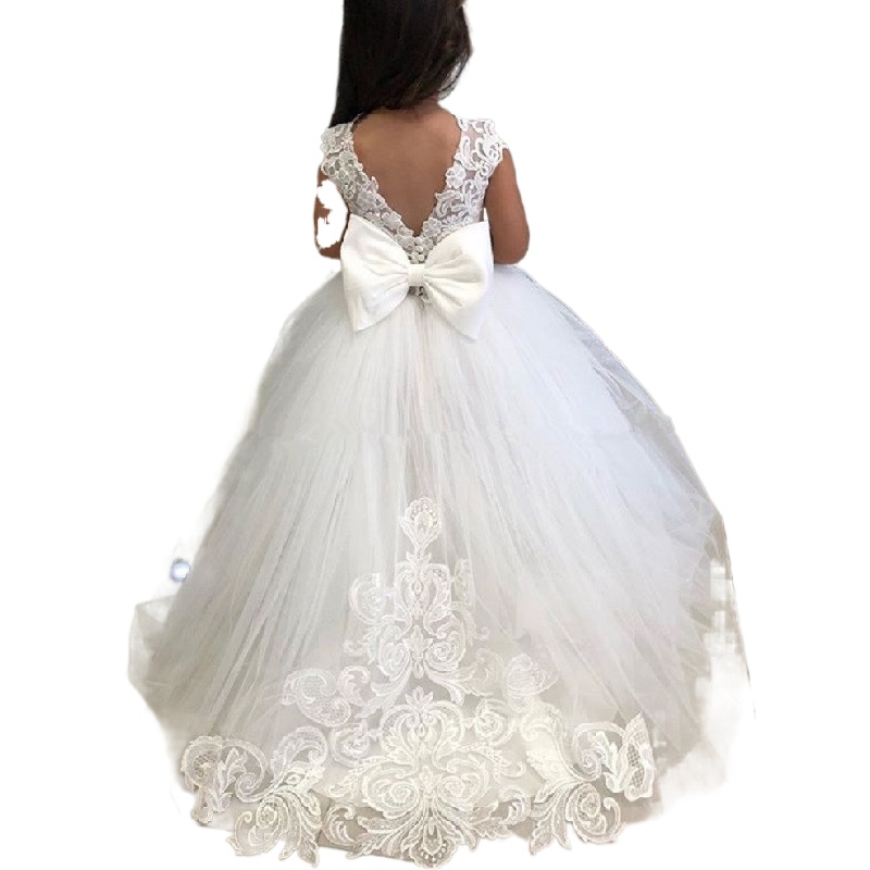 White Ivory Cute Flower Girl Dress for Wedding Formal Big Bow Lace Appliques Long Little Pageant Gowns First Communion Gowns