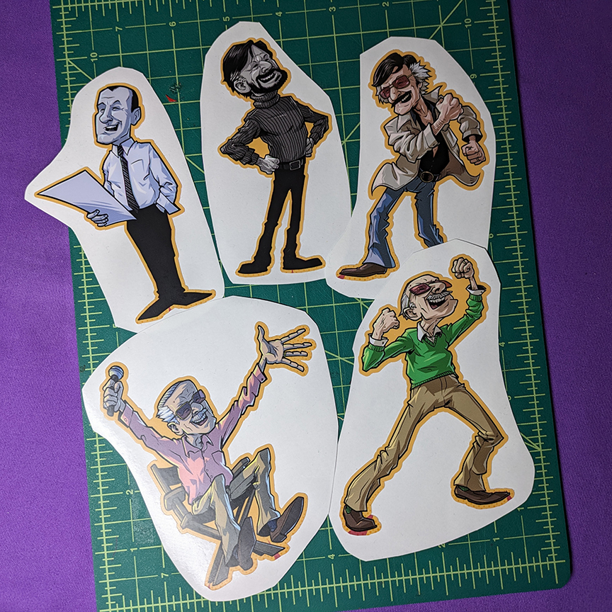 This deluxe limited edition sticker set includes 5 individual laminated vinyl die cut stickers depicting Stan Lee over various stages of his life. All illustrations by Marc Lapierre. Each sticker measures approximately 4.5" tall, is printed pressure sensitive vinyl, and is coated with with a luster finish UV protection laminate. This is a very limited edition and once the stock is gone, they are gone.