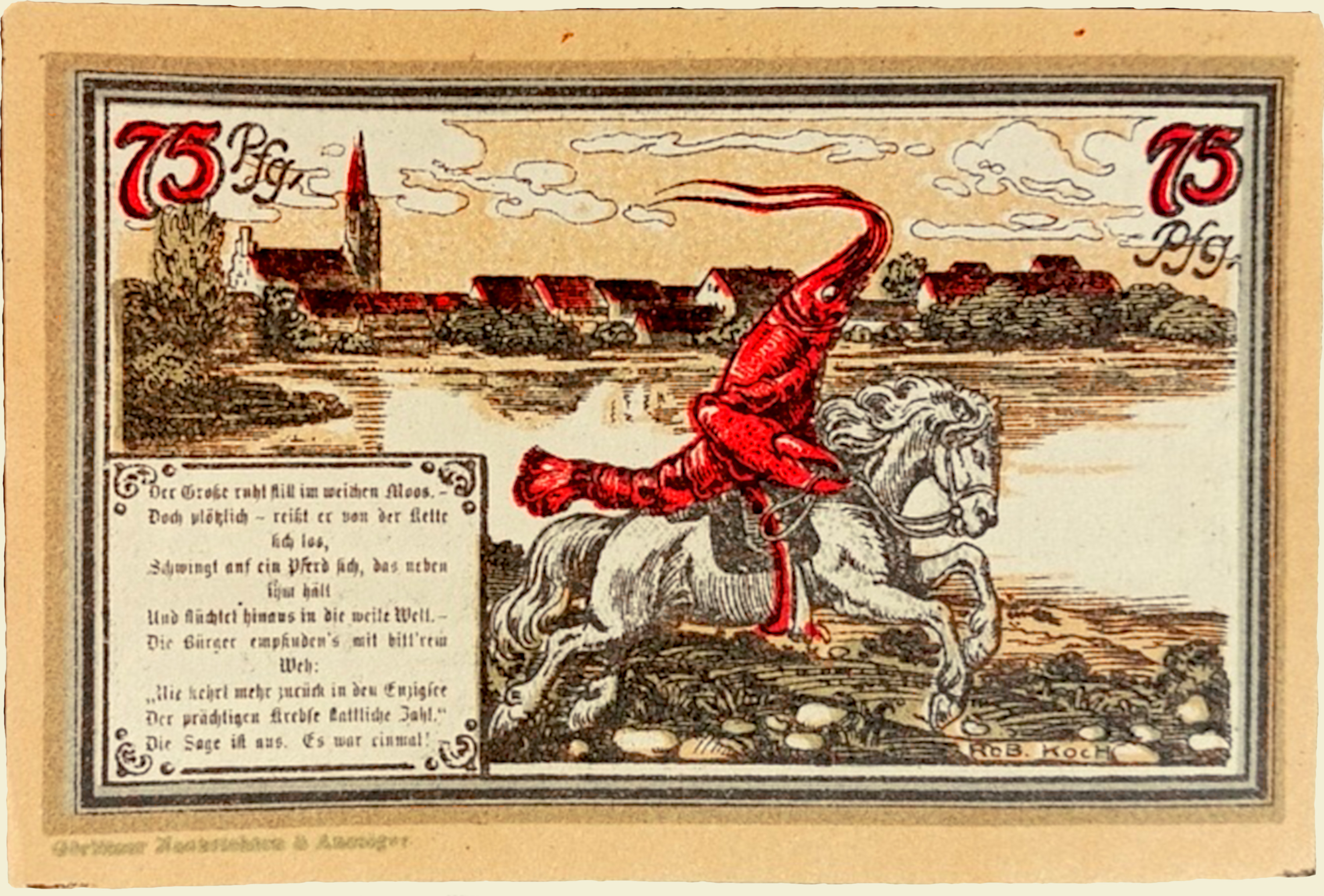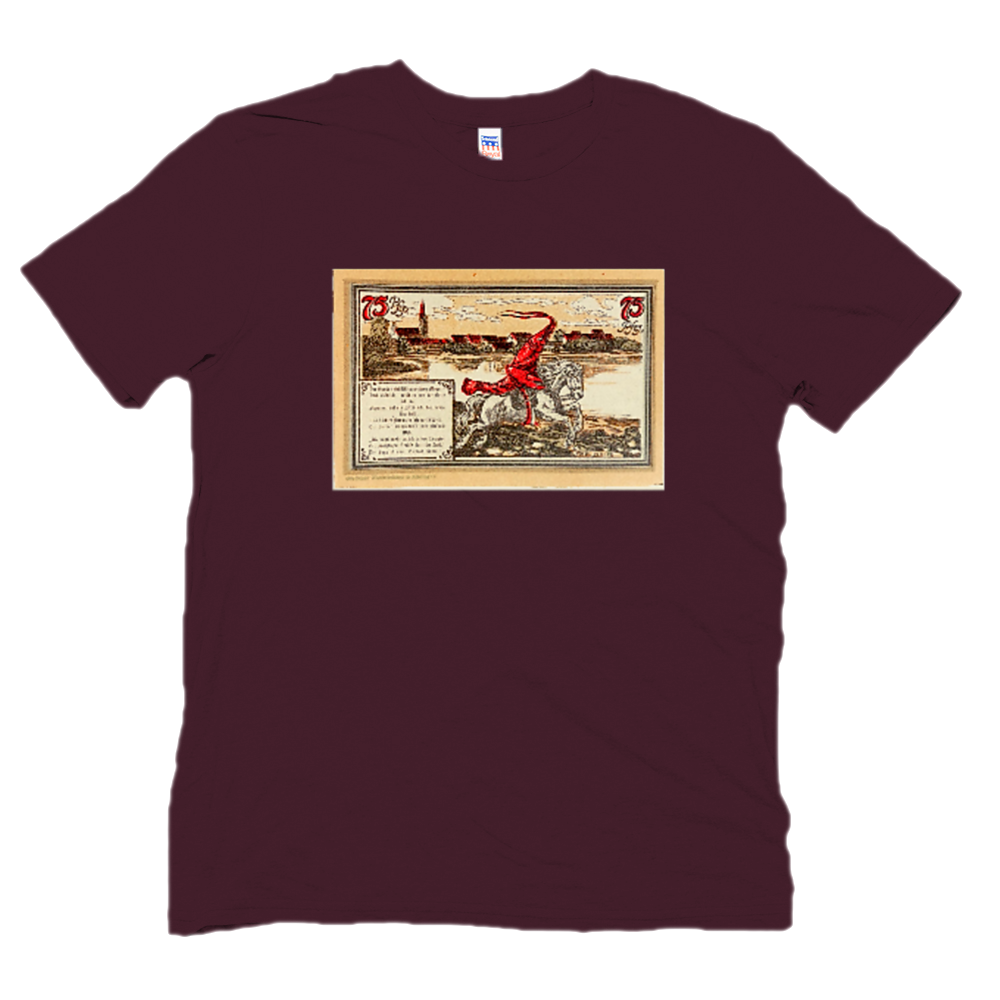 This is a 75 Pfennig note featuring a red lobster riding a spirited White Horse, next to a river, with houses and a church in the background. Image is printed on a soft, all cotton, jersey t-shirt by Royal Apparel, so this is 100% Made in USA product. Burgundy is the default color option.