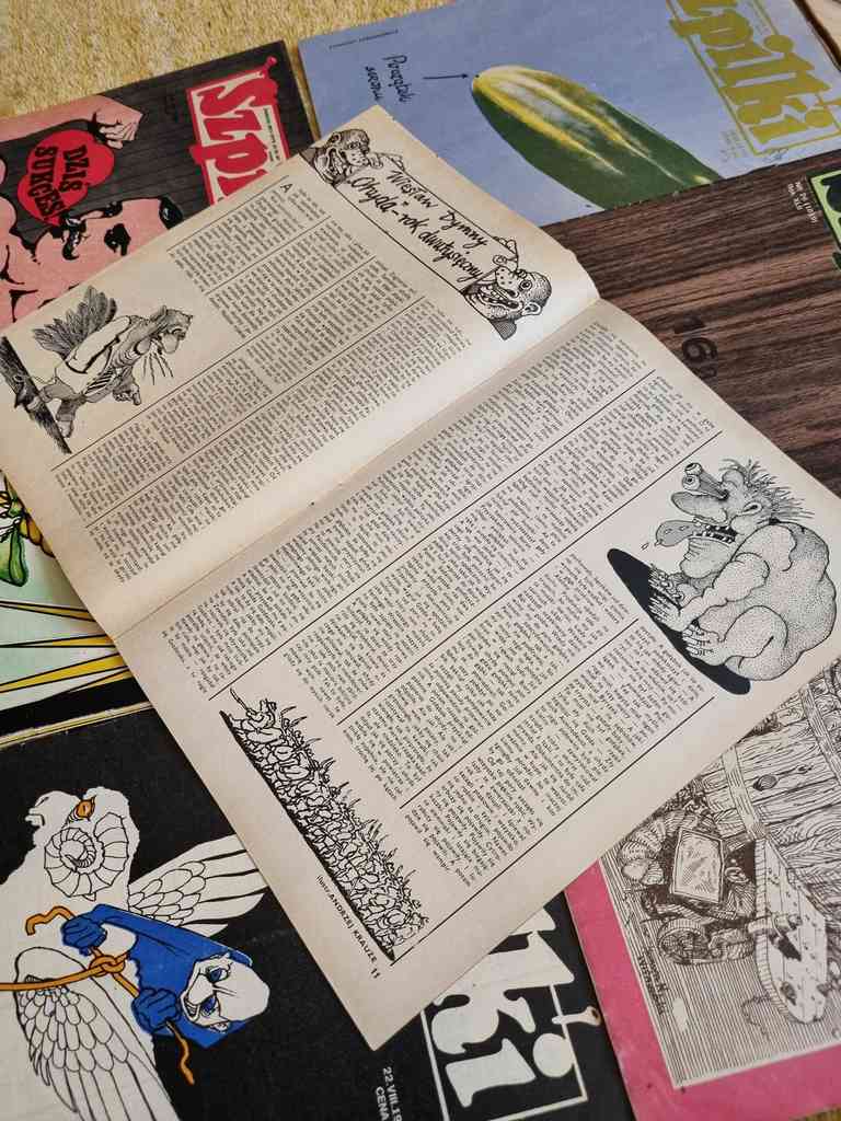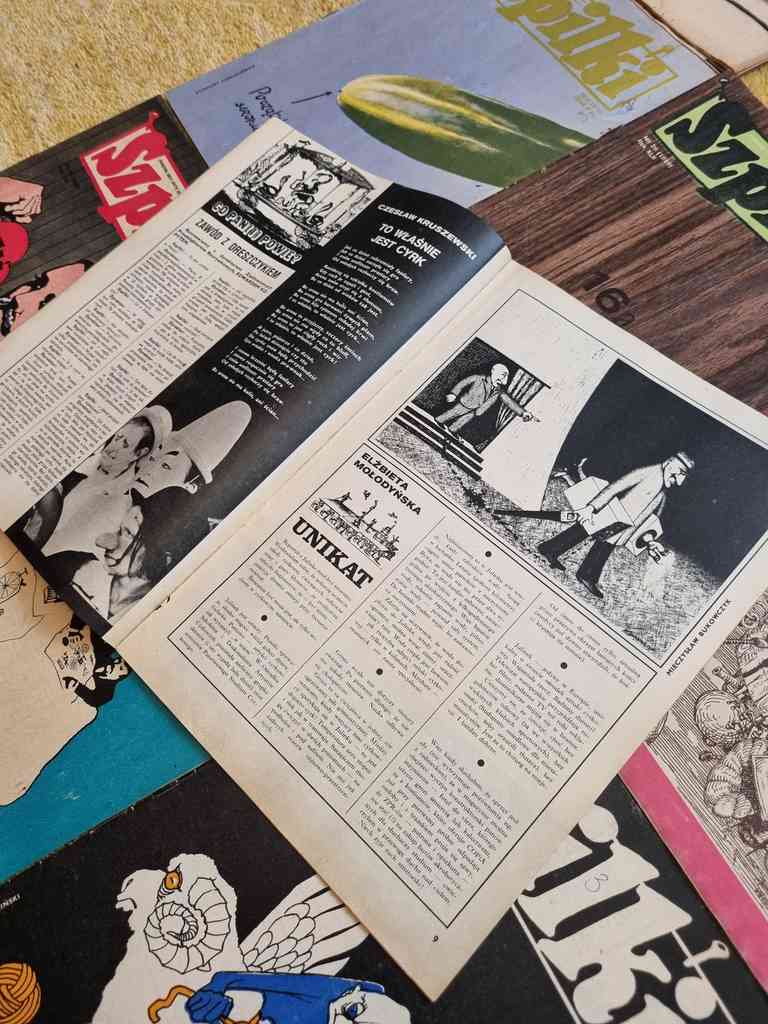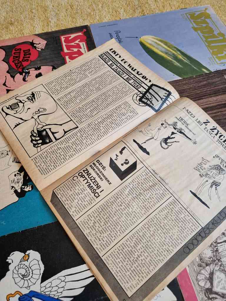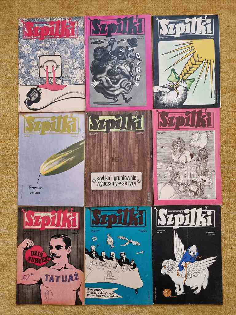 9 issues of Polish satirical magazine "Szpilki" from 1976. Szpilki was a Polish satirical magazine. It was established in 1936 by a group of leftist literary people, including Eryk Lipiński, Zenon Wasilewski and Zbigniew Mitzner. The title literally means "Pins". Suspended during World War II, it was resumed in 1945. In 1953 Szpilki was merged with another satirical magazine, Mucha. Together with many other printed media, it was suspended during the martial law in Poland. Since 1990 the magazine met with troubles, and after several attempts of reanimation it was closed in 1994.