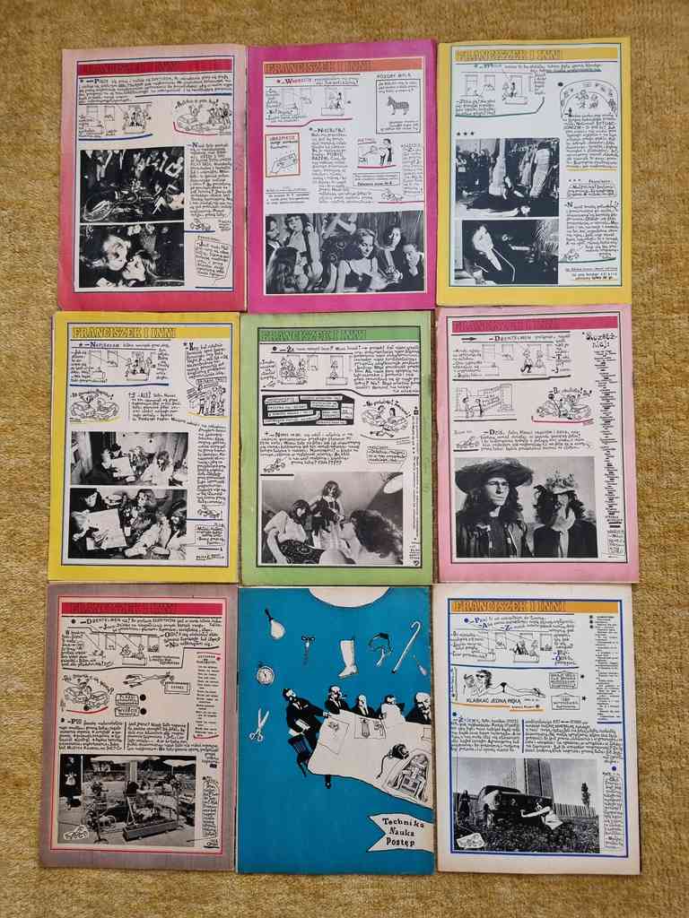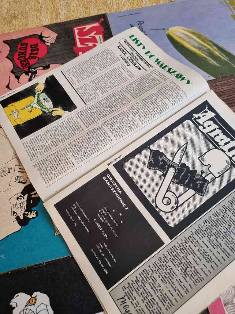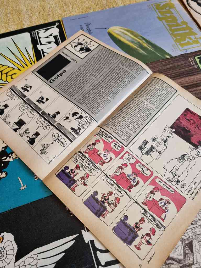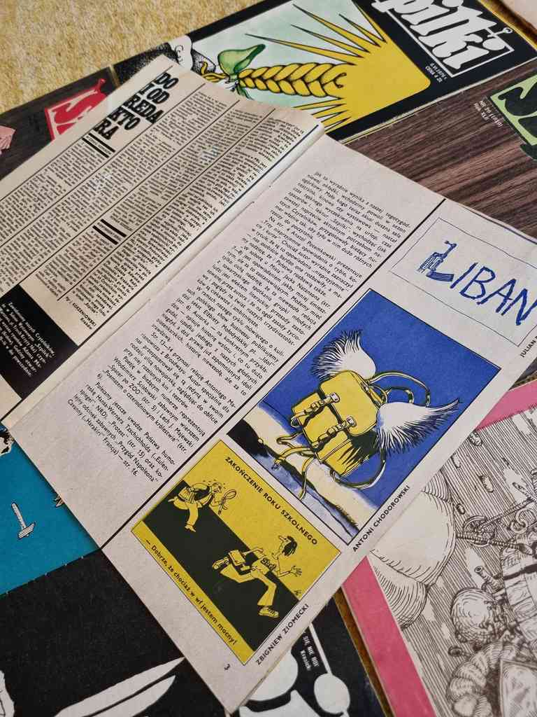9 issues of Polish satirical magazine "Szpilki" from 1976. Szpilki was a Polish satirical magazine. It was established in 1936 by a group of leftist literary people, including Eryk Lipiński, Zenon Wasilewski and Zbigniew Mitzner. The title literally means "Pins". Suspended during World War II, it was resumed in 1945. In 1953 Szpilki was merged with another satirical magazine, Mucha. Together with many other printed media, it was suspended during the martial law in Poland. Since 1990 the magazine met with troubles, and after several attempts of reanimation it was closed in 1994.