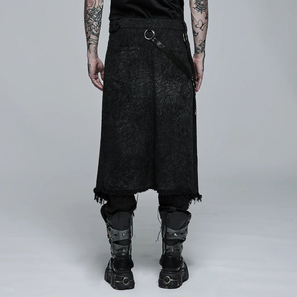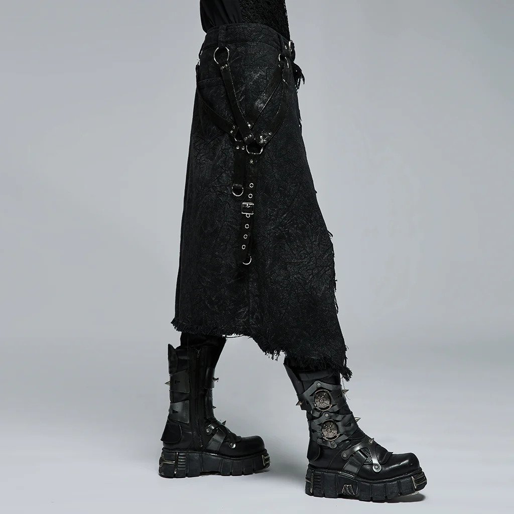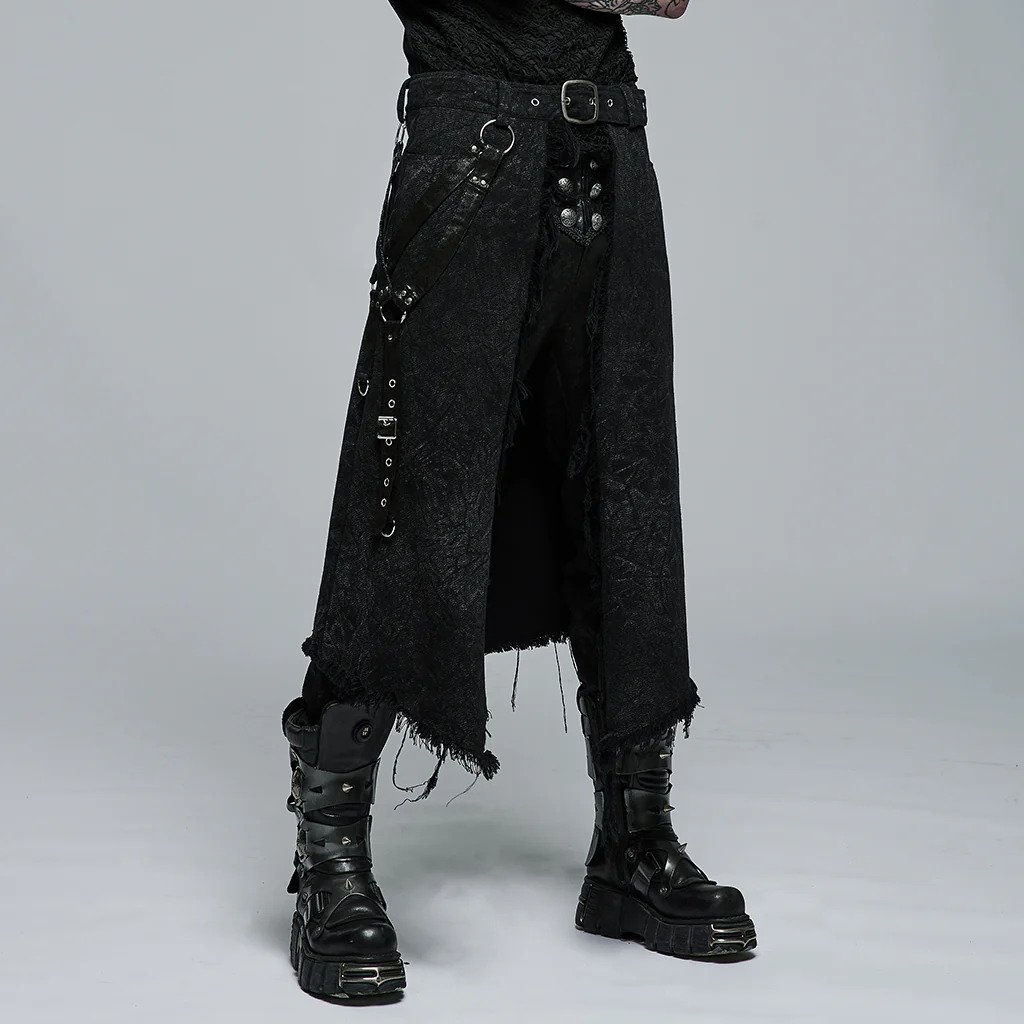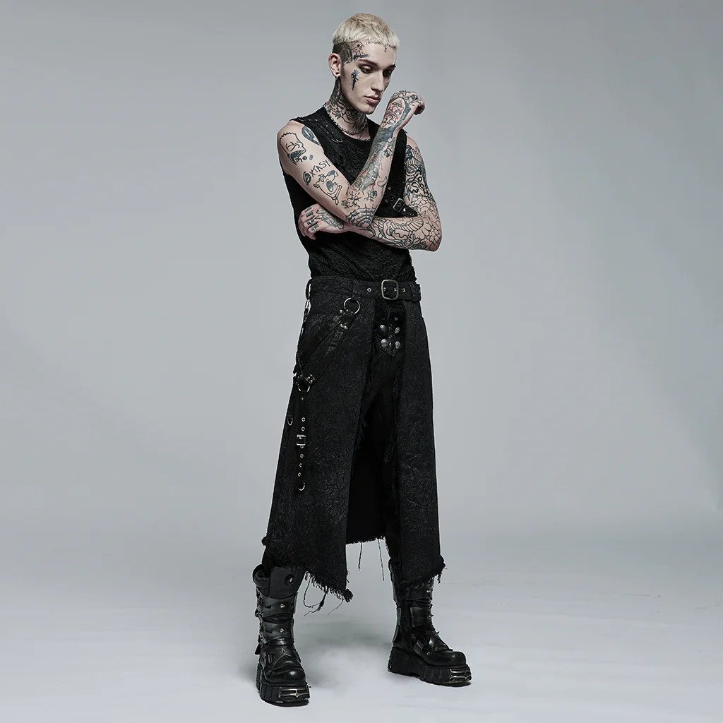 make a statement with this stylish and bold men's black gothic belt overskirt. the asymmetrical design creates an eye-catching look that is perfect for any occasion. the convenient belt allows for easy adjustment and customization to fit any body shape and size. add a unique edge to your wardrobe with this overskirt and stand out from the crowd.