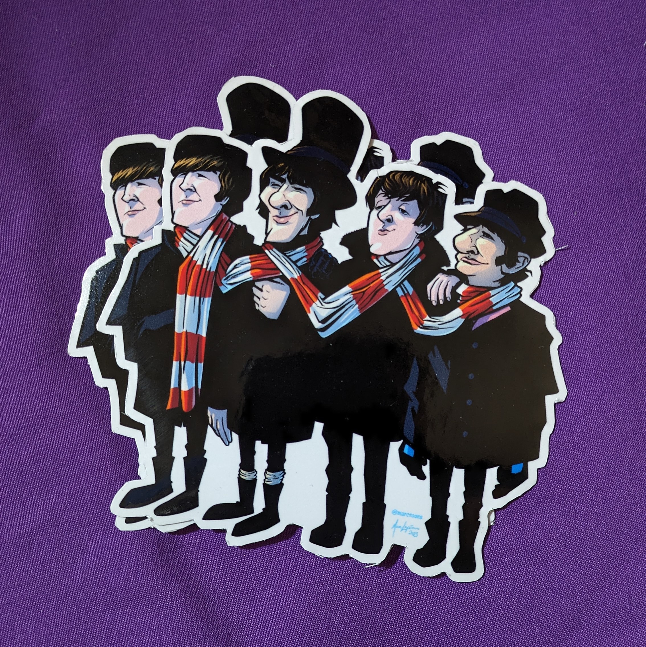 Show your love for the lads from Liverpool with this vinyl sticker featuring cartoon art by Marc Lapierre. Sticker measures approximately 5"x5", is printed on laminated pressure sensitive vinyl. This is a very limited edition and once the stock is gone, they are gone.