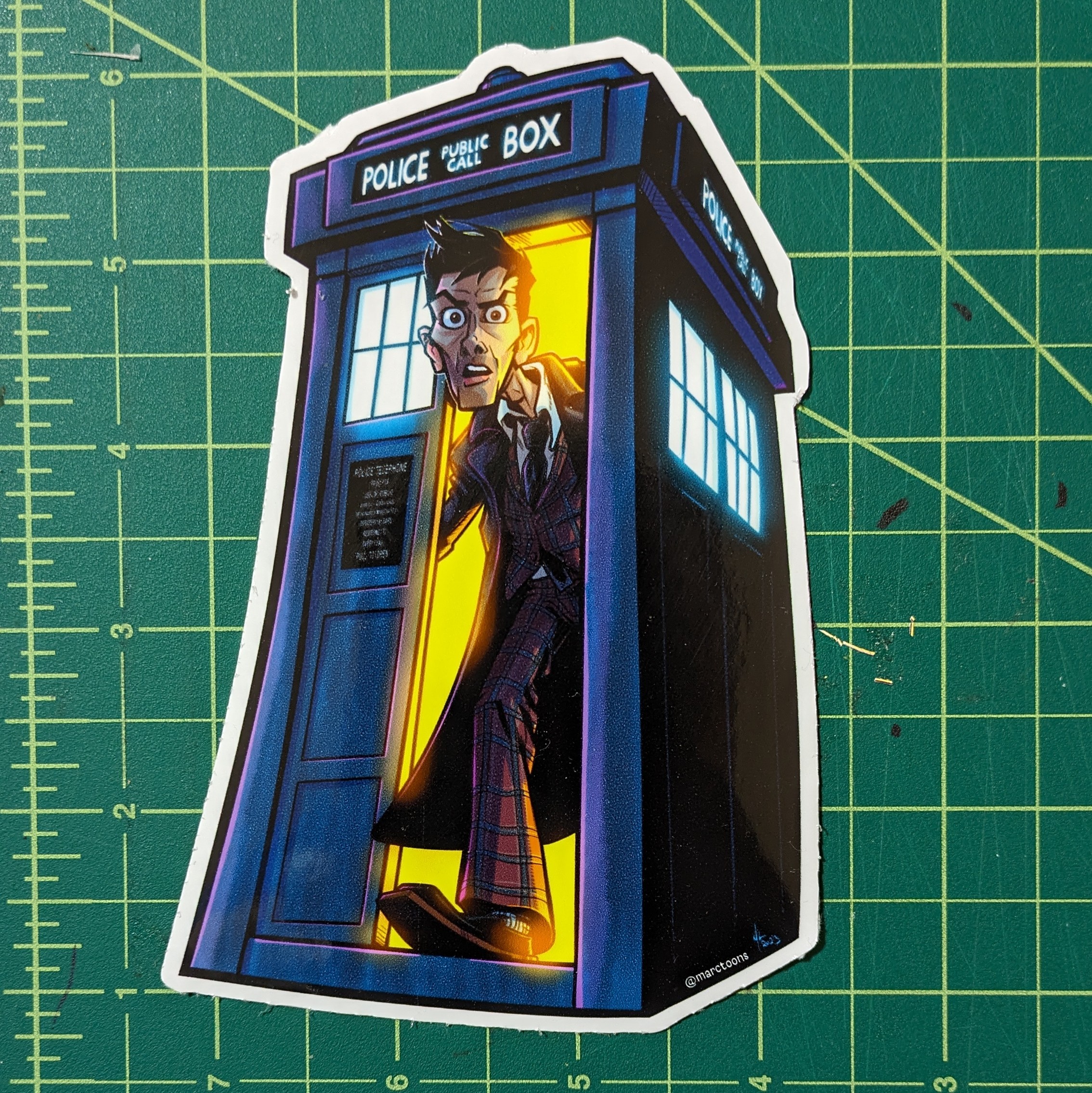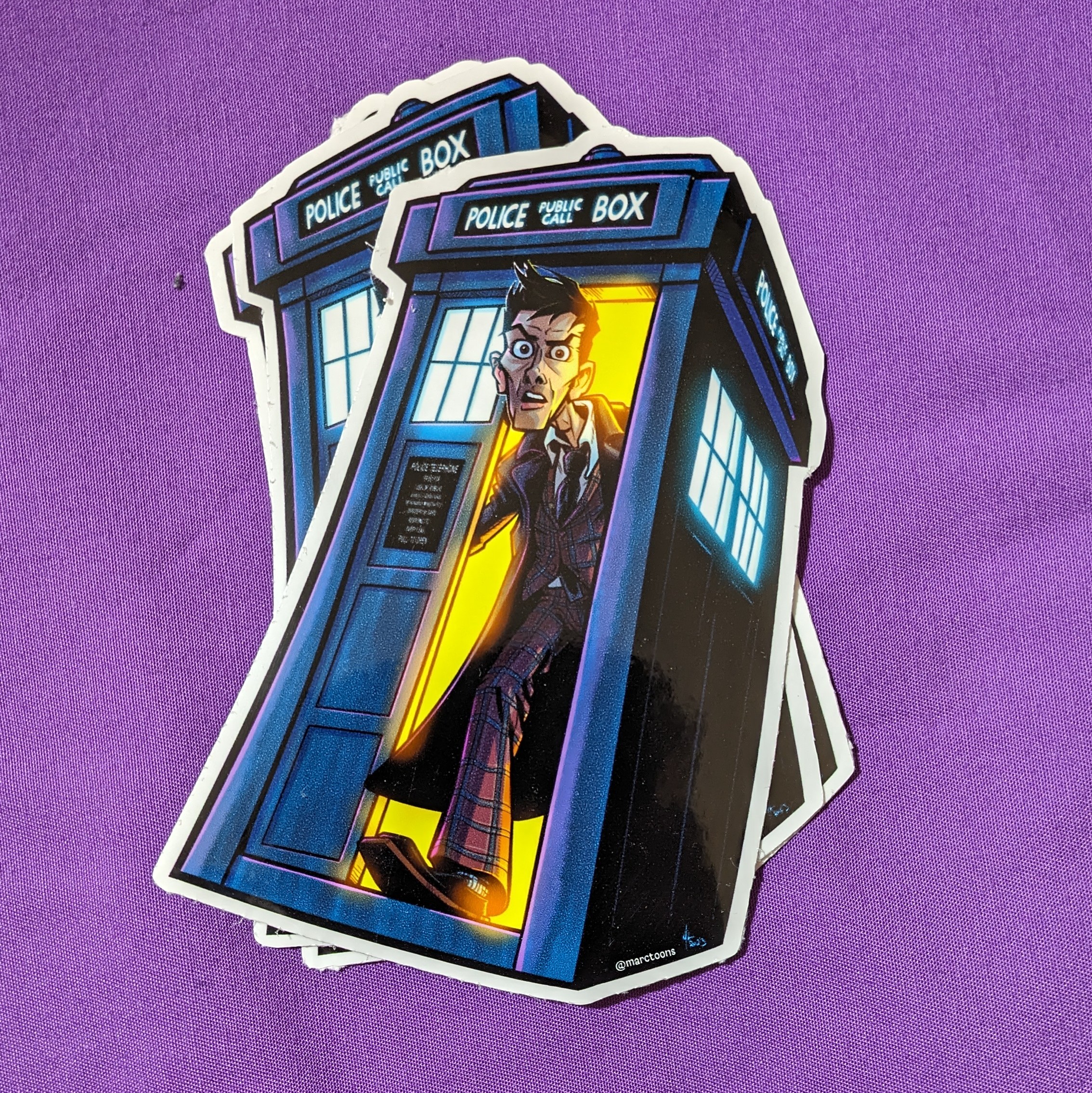 Let the world know you are under the protection of The Doctor this vinyl sticker featuring cartoon art by Marc Lapierre. Sticker measures approximately 3.5" x 5.5", is printed on laminated pressure sensitive vinyl. This is a very limited edition and once the stock is gone, they are gone.