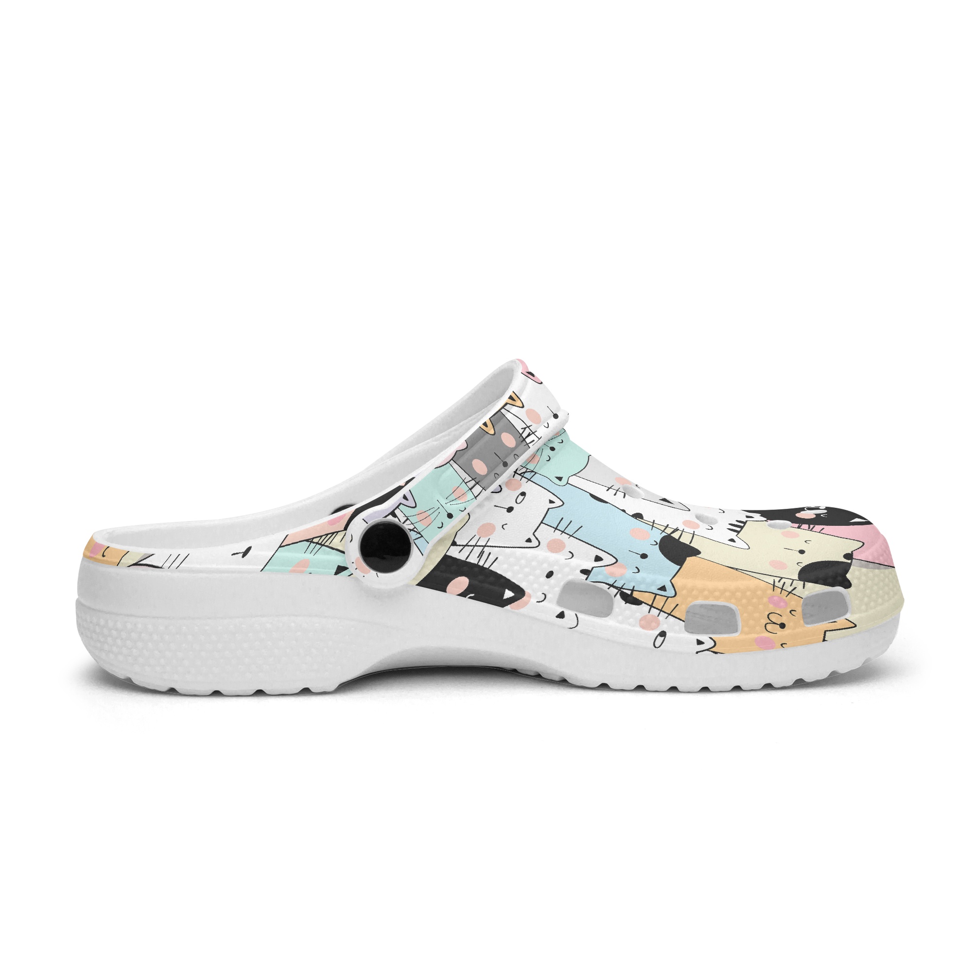 May I introduce? - Our versatile and super comfortable clogs with a colorful cat pattern! A comfortable all-round shoe that you will fall in love with every day. The comfortable cat clogs offer you a comfortable fit and are also visually fun. Perfect for anyone who wants to feel completely comfortable. They are incredibly light and comfortable to wear, water-friendly and buoyant and weigh only a few grams. The ventilation holes ensure breathability and wick away water and dirt. Easy to clean and quick drying. The heel strap can be worn at the front or back for a snug fit.