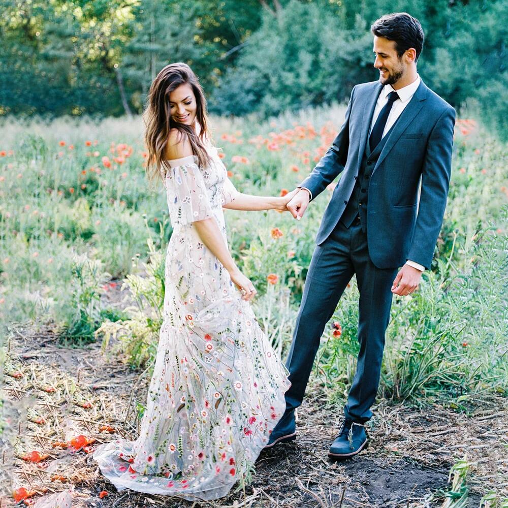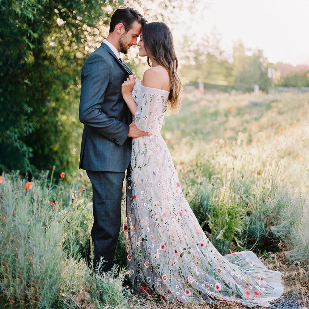 Off Shoulder Floral Embroidery A Line Wedding Gown Custom Made Short Sleeves Colorful Rustic Colorful See Through Bridal Dress