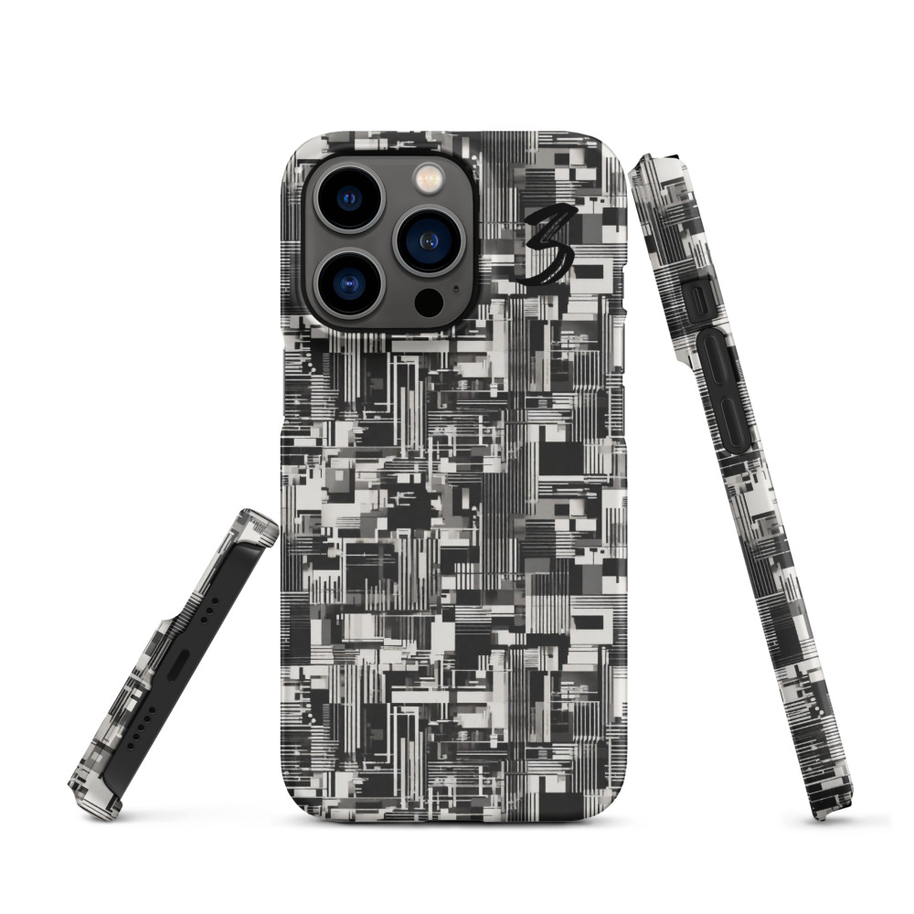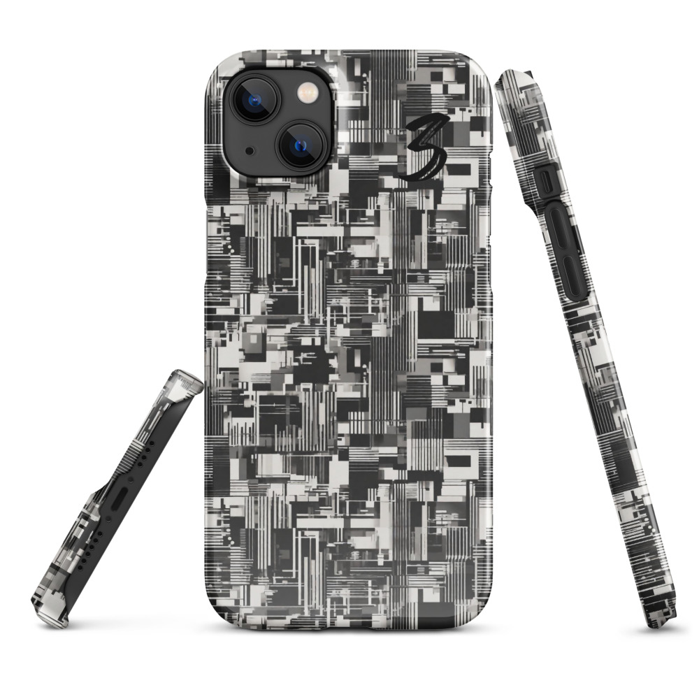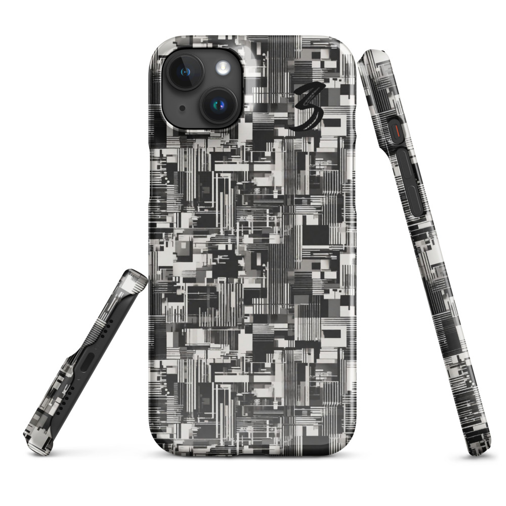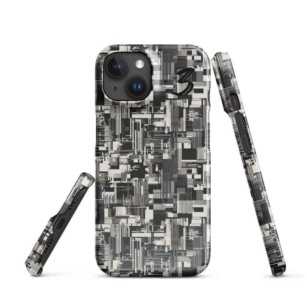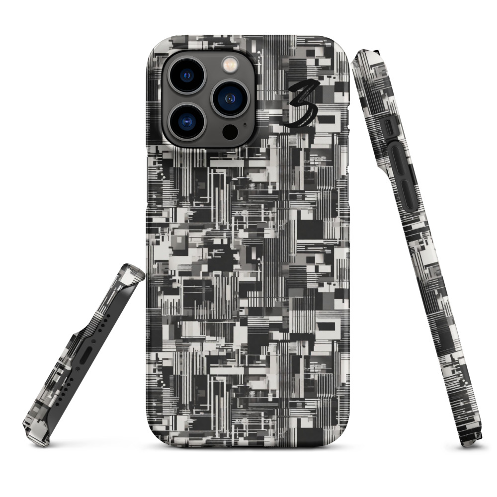 A mesmerizing black and white geometric pattern adorns a sleek case, featuring squares, rectangles, and triangles that interlock seamlessly, creating depth and dimension. The monochrome palette ensures versatility, while the case's structured form complements the pattern, exuding timeless style.