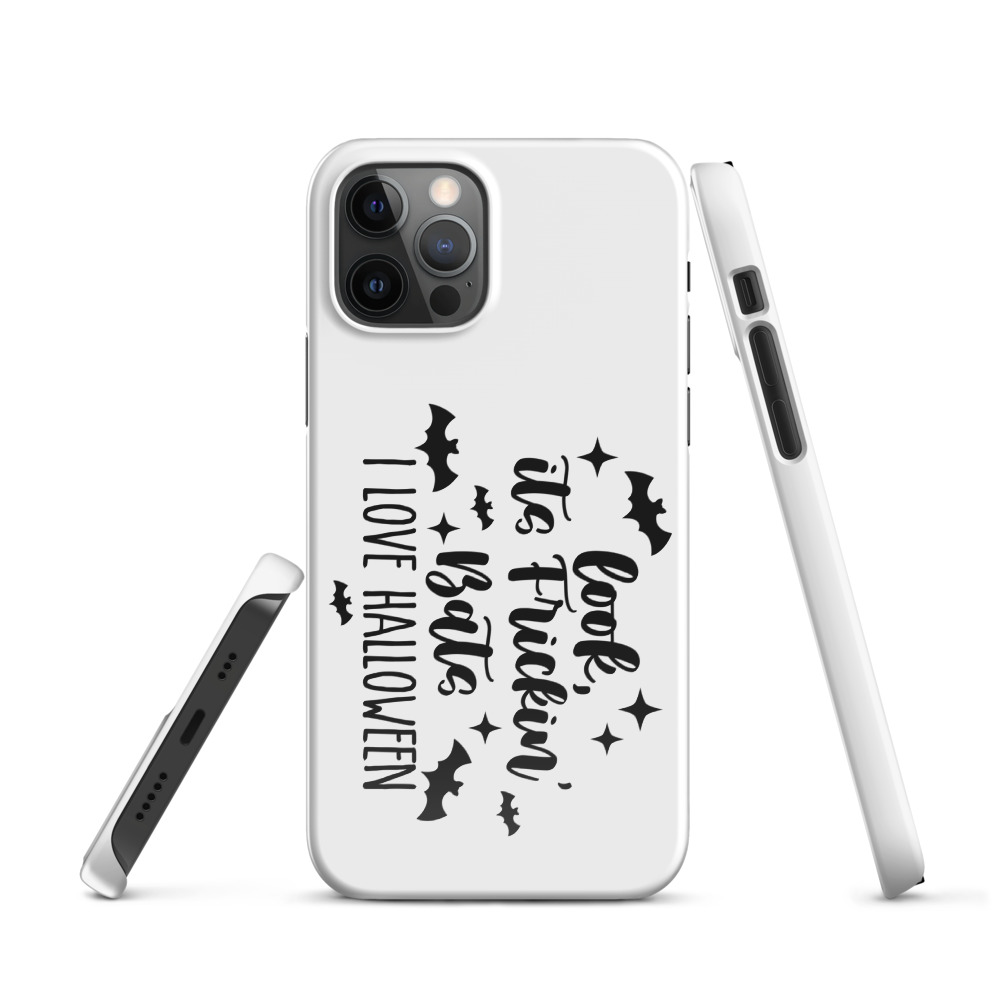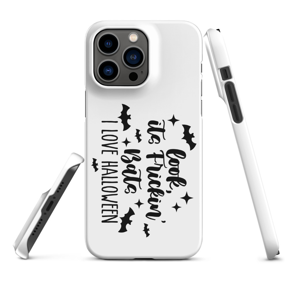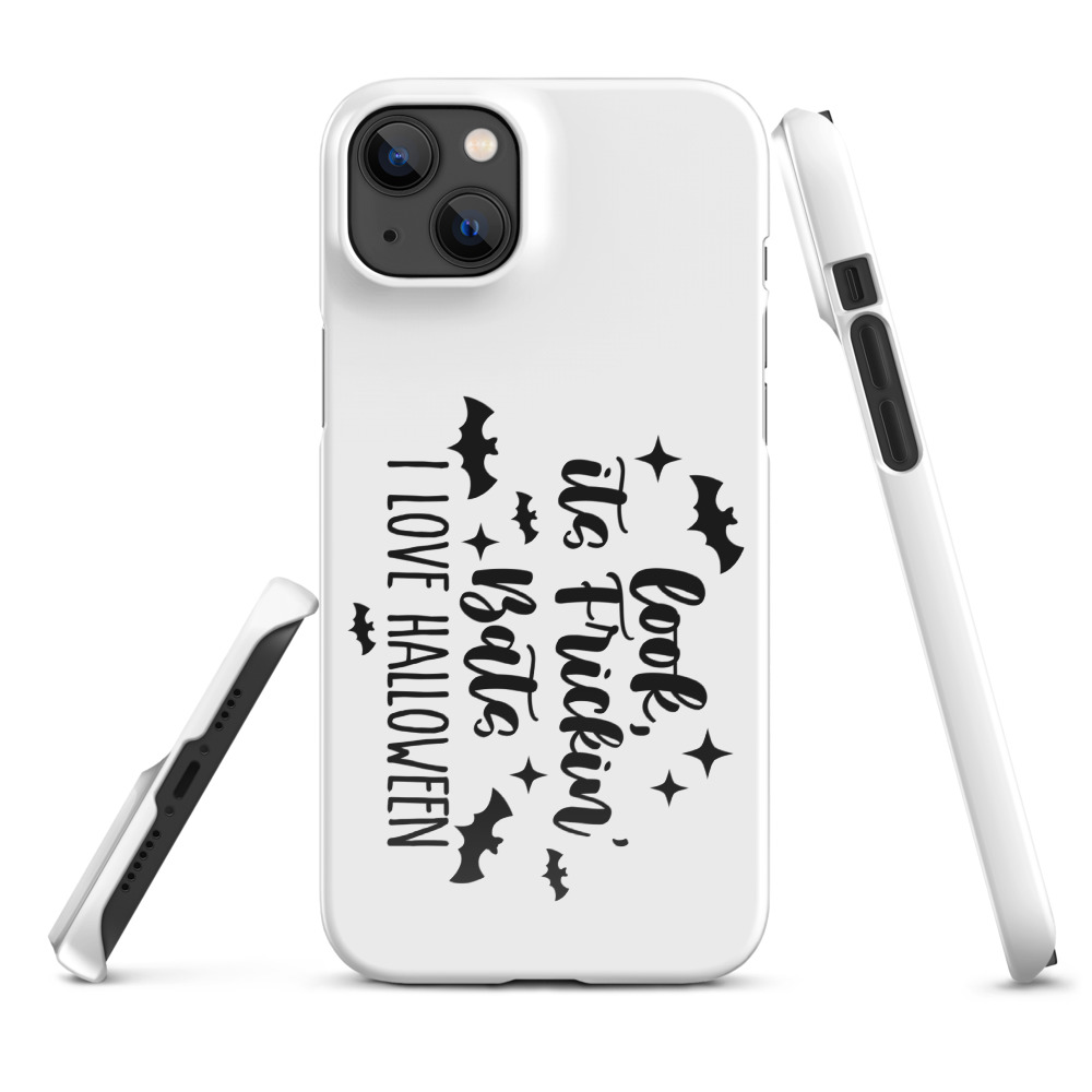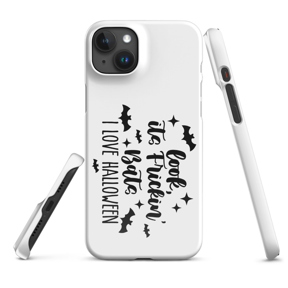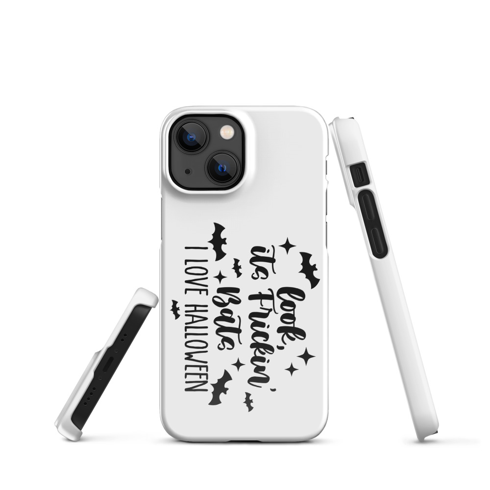 The Snap case for iPhone features the phrase "Its Frickin Bats, I love Halloween" boldly written in a playful, spooky font, dominating the foreground. Within the text, a congregation of silhouettes of bats flying, filling the rest of the image. The bats are depicted as silhoettes, showcasing their outstretched wings and unique, contorted postures as they soar through the night.