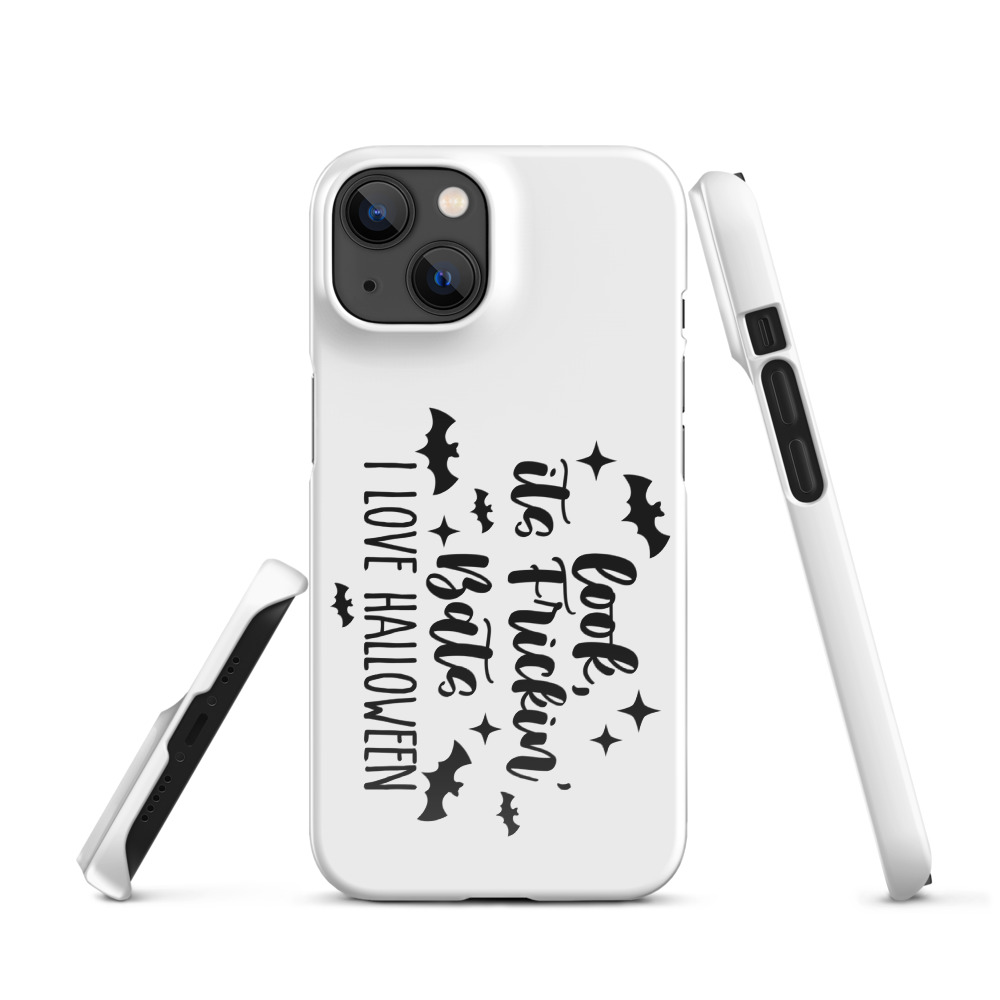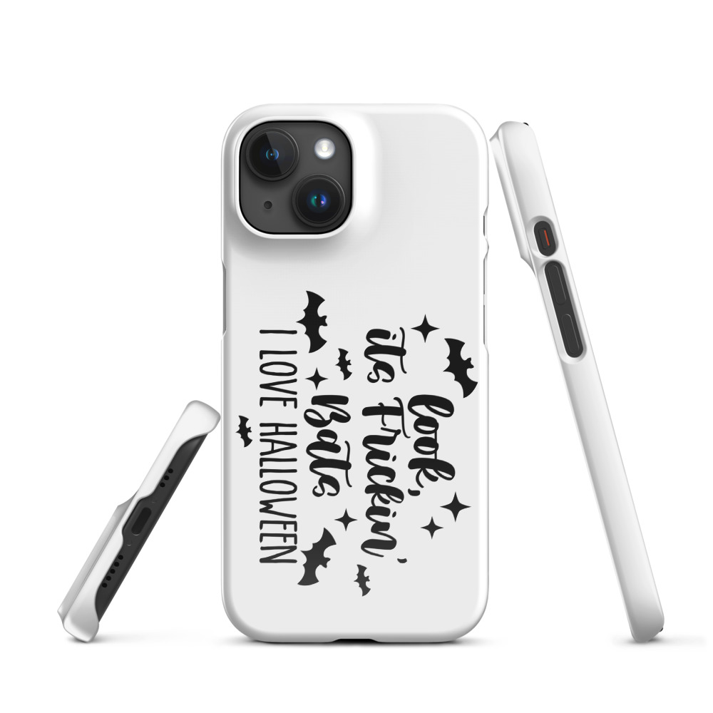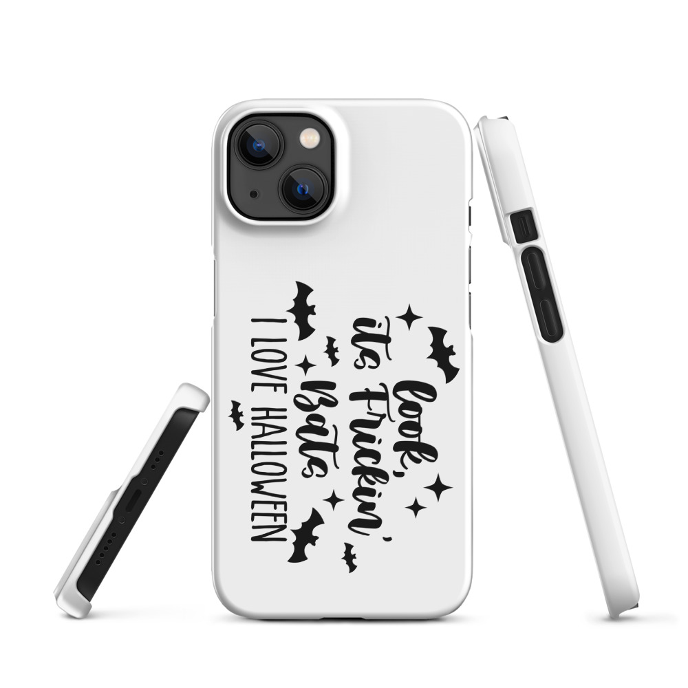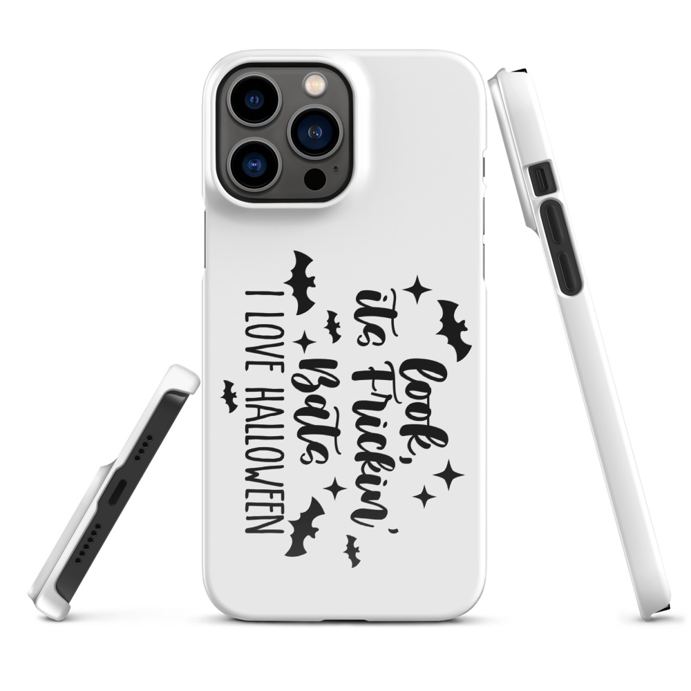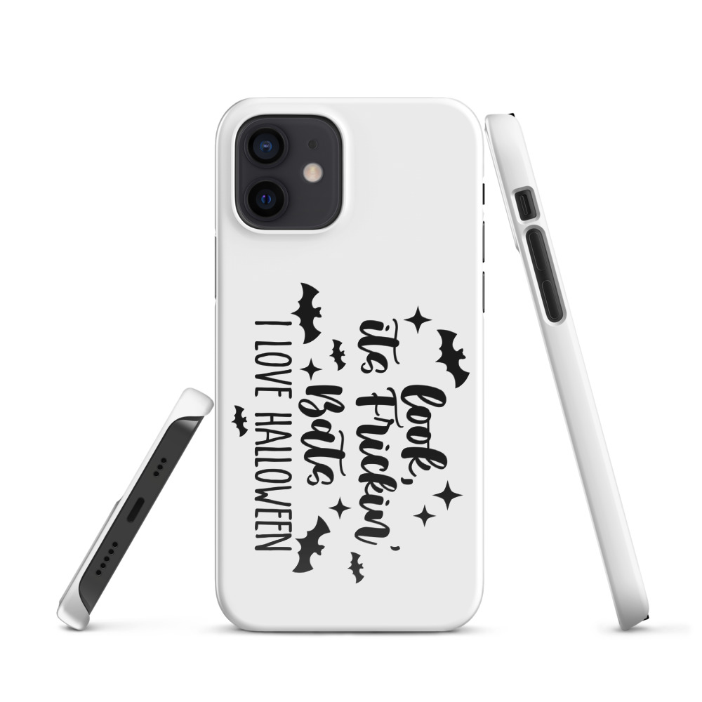 The Snap case for iPhone features the phrase "Its Frickin Bats, I love Halloween" boldly written in a playful, spooky font, dominating the foreground. Within the text, a congregation of silhouettes of bats flying, filling the rest of the image. The bats are depicted as silhoettes, showcasing their outstretched wings and unique, contorted postures as they soar through the night.