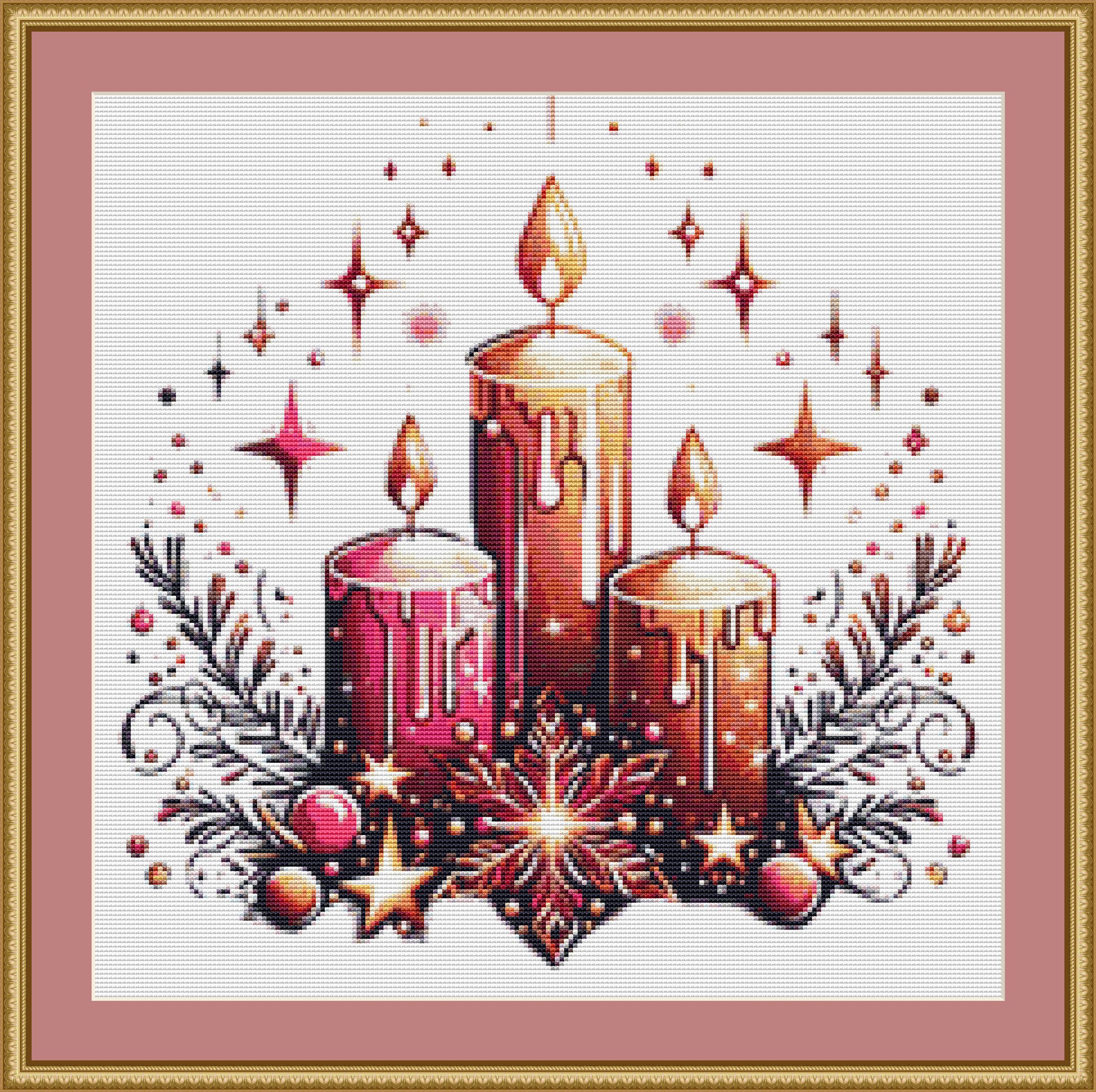 This cross stitch pattern depicts a picture of a some Christmas candles.