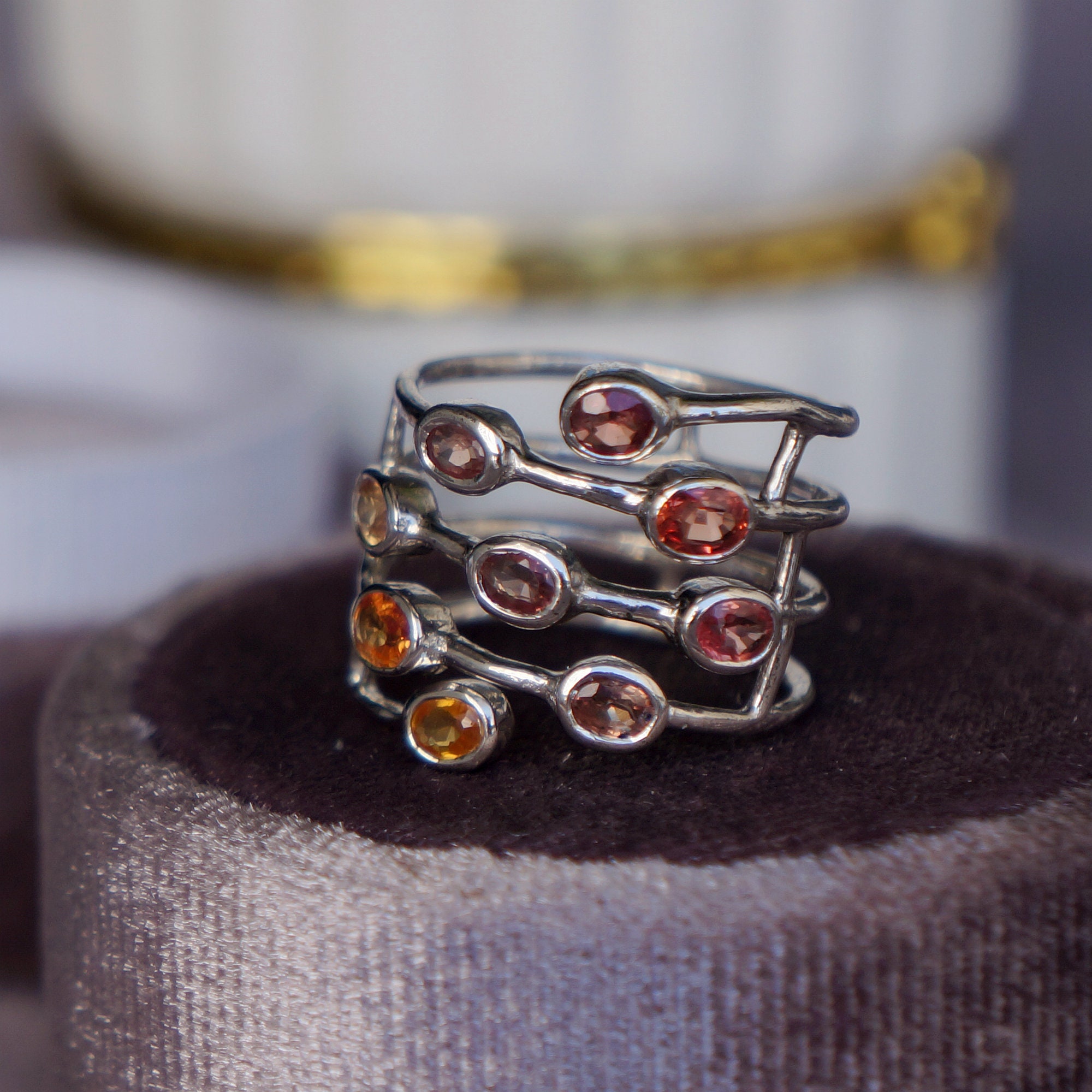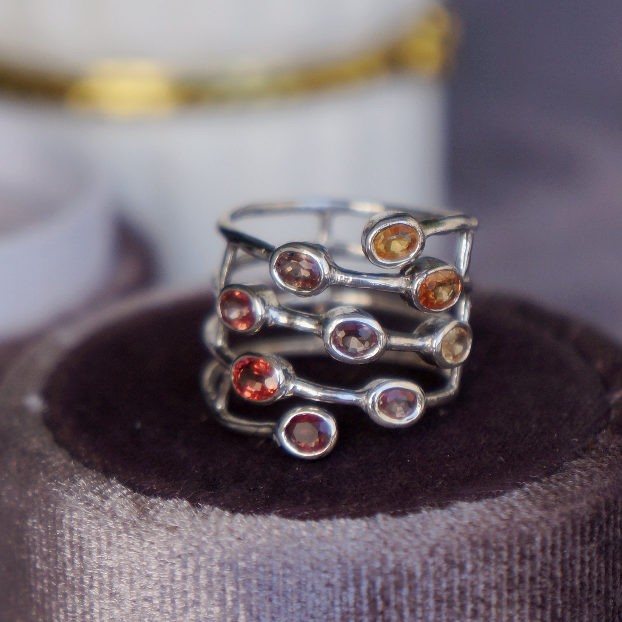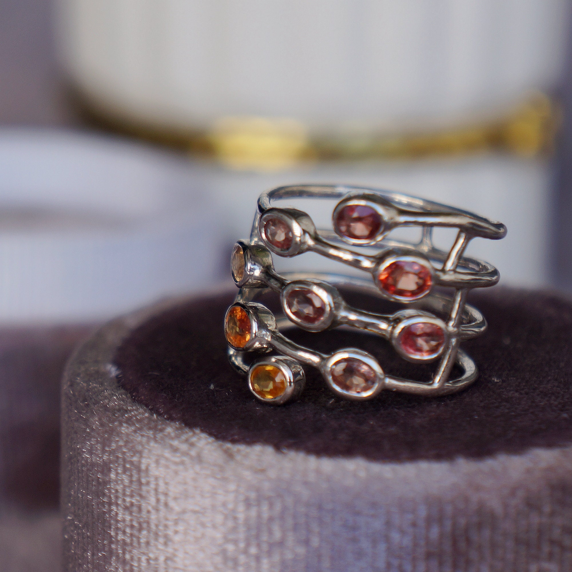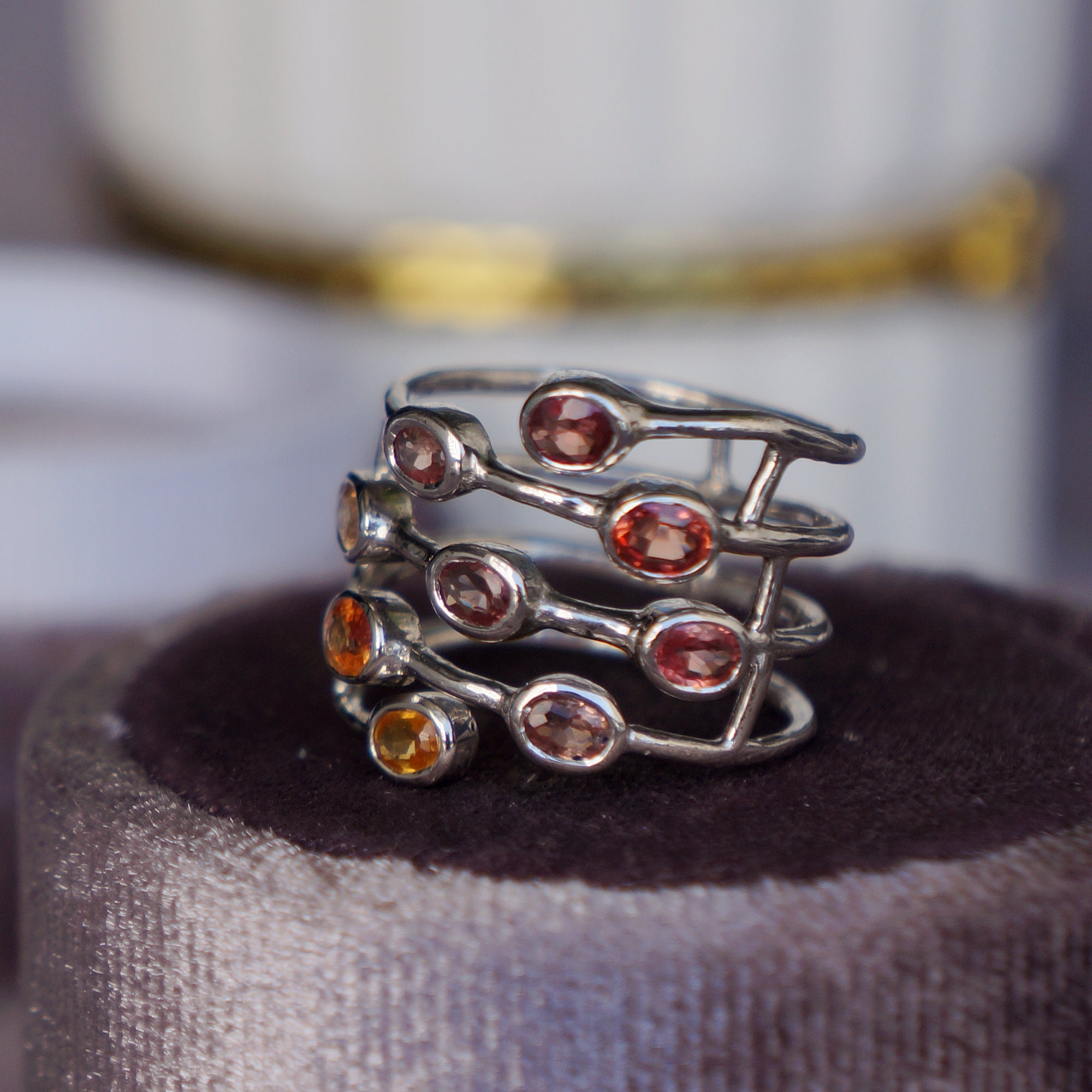 Stylish multi-color Sapphire Ring 925 Sterling Silver Rhodium Plated Yellow/Orange/Red/Purple Sapphire Sep. Birthstone US 5.5 Ring