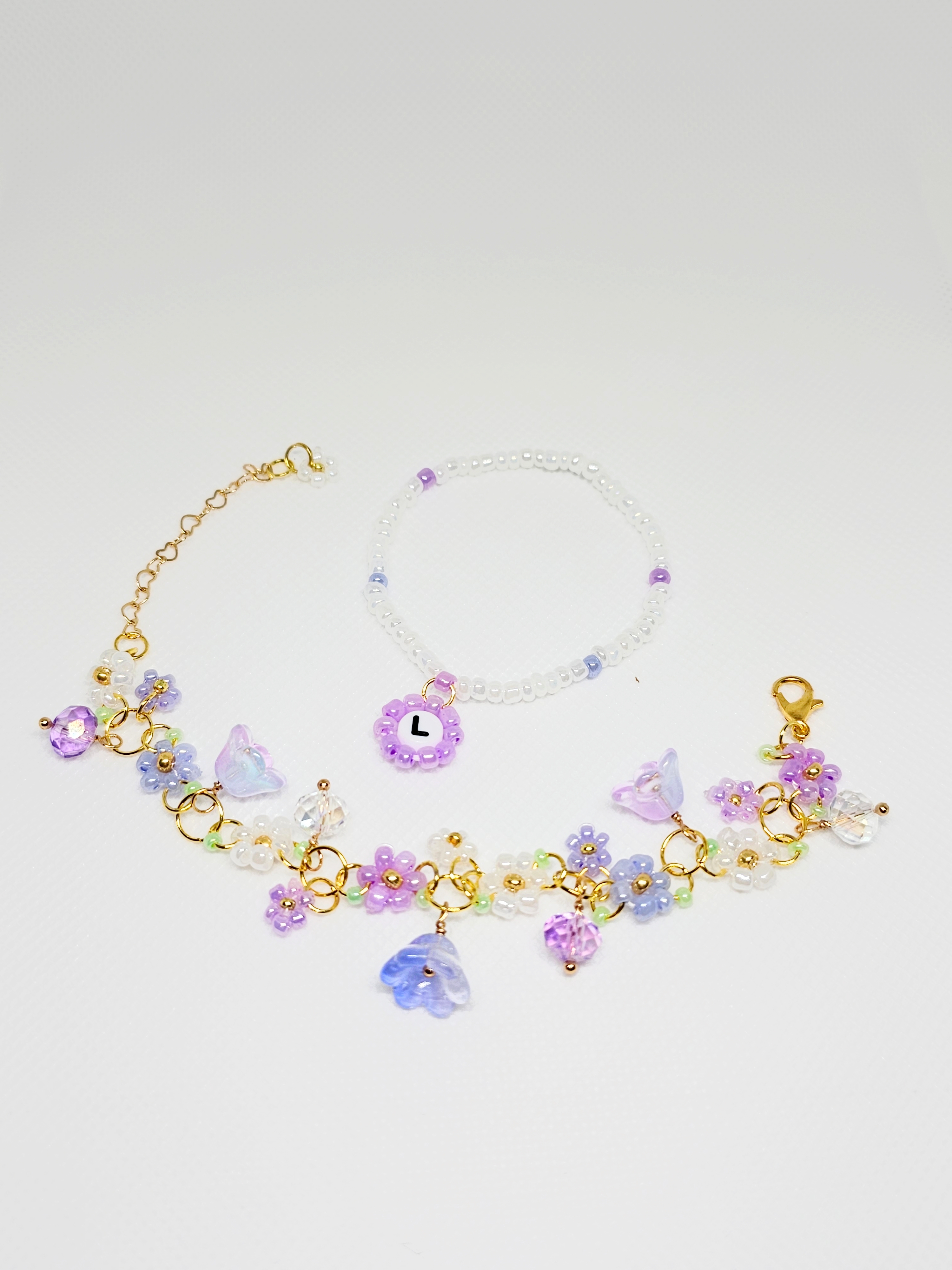 Purple Lily Bracelet Set with Glass beads, Gold Plated Wire and Clasp