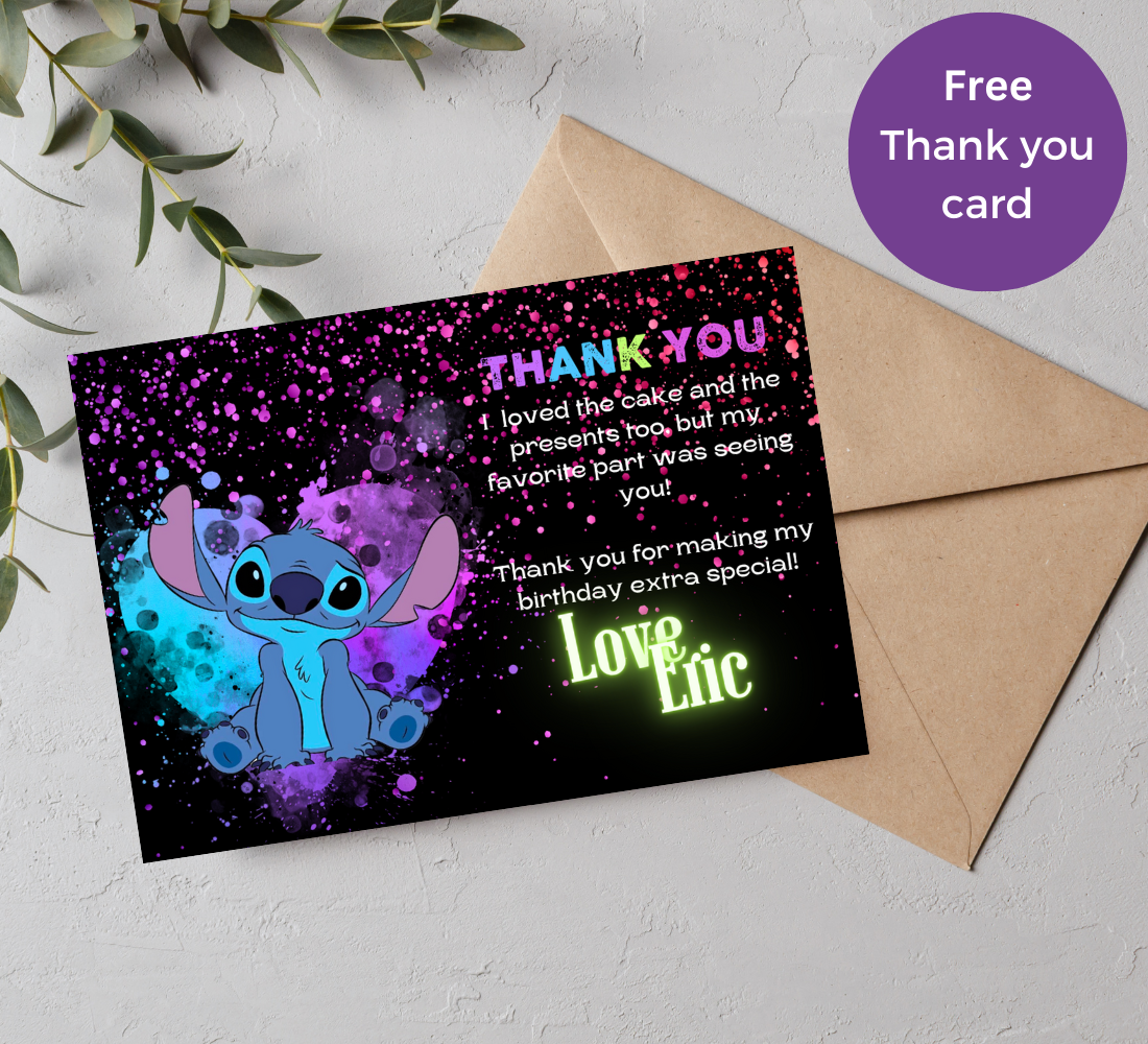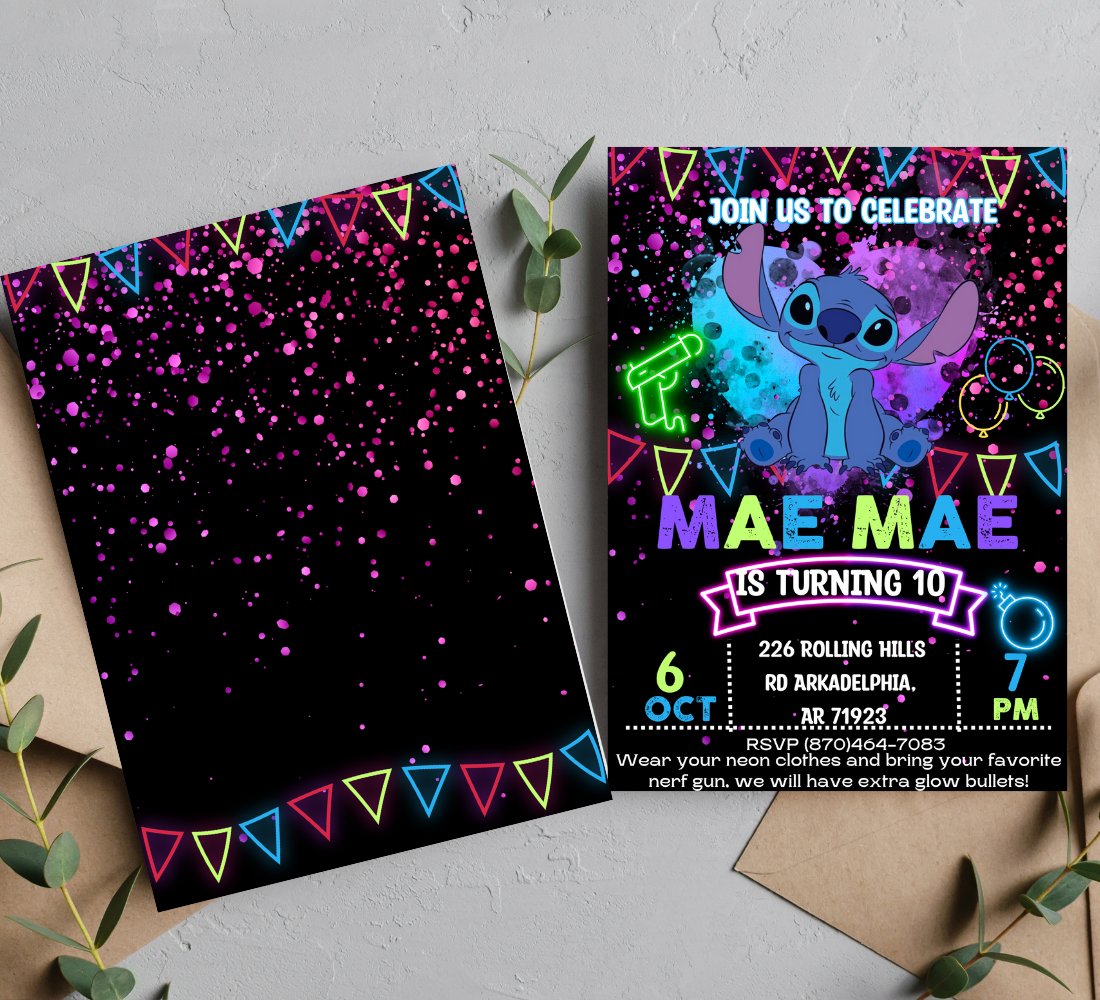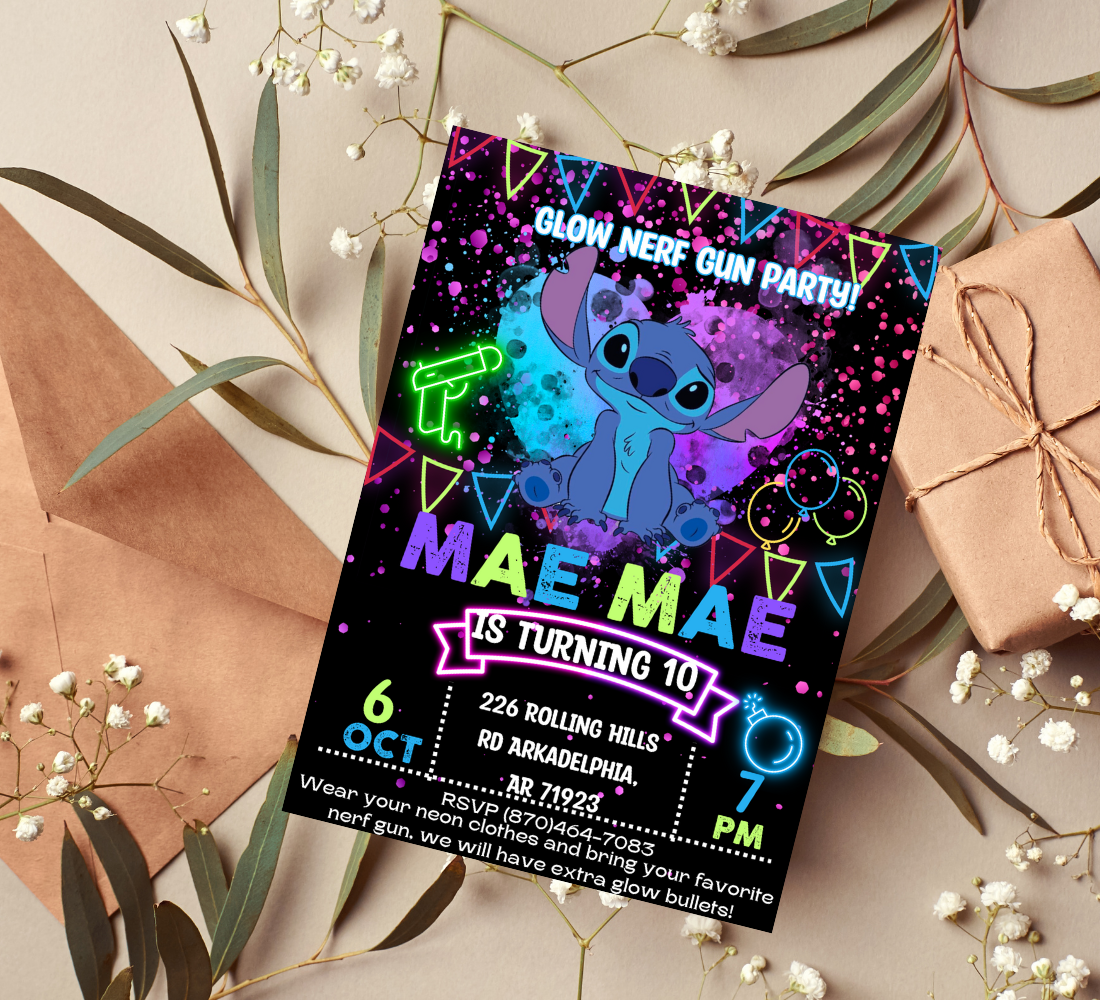 "Get ready for an action-packed celebration with our Stitch Neon Nerf Gun Birthday Invitation! This Lilo & Stitch-themed party invite brings a vibrant and fun Nerf Battle Theme to life, setting the stage for an unforgettable adventure. The customizable design ensures a personalized touch, making it perfect for your little sharpshooter's special day. Download now and let the Stitch magic infuse your celebration with excitement!