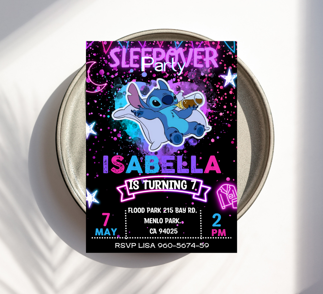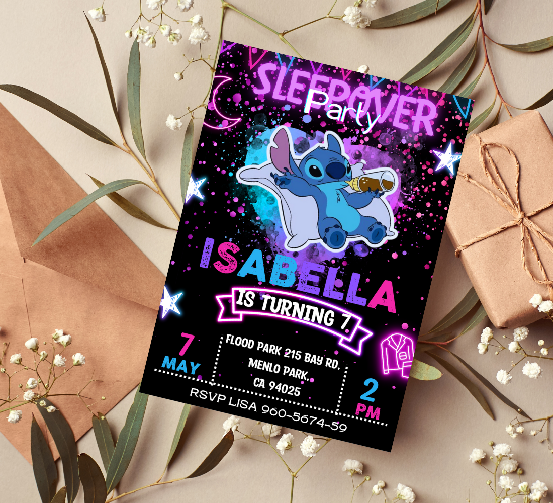 Plan an unforgettable sleepover celebration with our Stitch Neon Sleepover Birthday Invitation! This Lilo & Stitch-themed party invite adds a vibrant touch to your special night, creating an atmosphere of excitement and joy. The customizable design allows you to tailor the invitation to your unique event, ensuring a personalized and memorable touch. Download now for a seamless digital experience and let the Stitch magic infuse your sleepover with colorful charm! Perfect for a night filled with laughter, friendship, and the magic of Stitch. Make your celebration one to remember with our vibrant and customizable sleepover invitation.