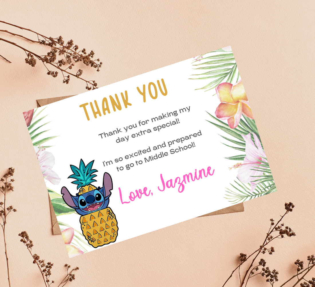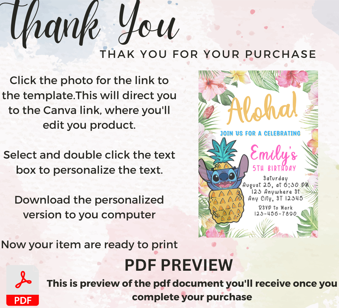 Bring the tropical vibes to your celebration with our Stitch Aloha Birthday Invitation and Thank You Card Set! πΊπ΄ This Hawaiian-themed duo, featuring the lovable Stitch, sets the stage for a festive and unforgettable birthday bash. The customizable invitation radiates the warmth of Aloha, while the matching thank you card adds the perfect finishing touch. Download now for a seamless digital experience and let the Hawaiian magic of Stitch make your celebration extra special! Ideal for a birthday filled with joy, laughter, and the enchanting spirit of Aloha. Express your gratitude in style with our personalized set.