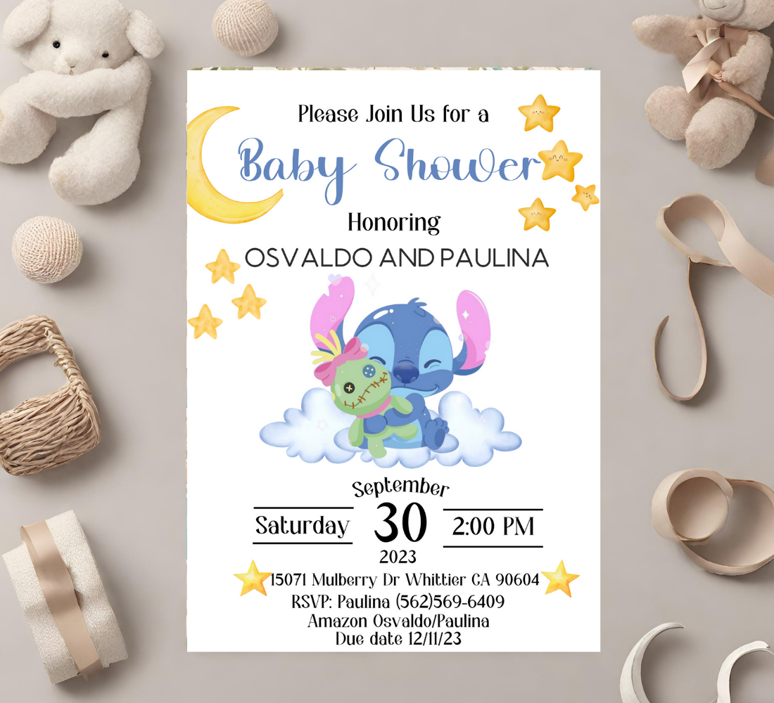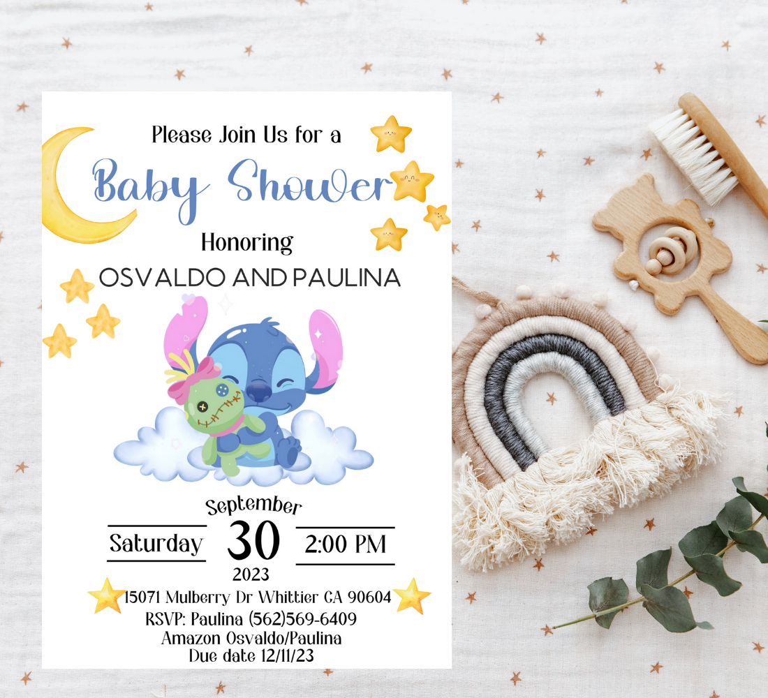 Embark on a whimsical journey with our Stitch Baby Shower Invitation, adorned with a Moon, Star, and Cloud theme! πββοΈ This enchanting celestial design sets the stage for a magical and joyous celebration in honor of the upcoming arrival. The playful Stitch character adds a touch of charm to this unique invitation, creating an atmosphere of wonder and delight. Download now for a seamless digital experience and let the celestial magic of Stitch make your baby shower extra special! Ideal for a celebration filled with love, laughter, and the enchanting beauty of the night sky. Make your baby shower truly memorable with our personalized celestial-themed invitation.