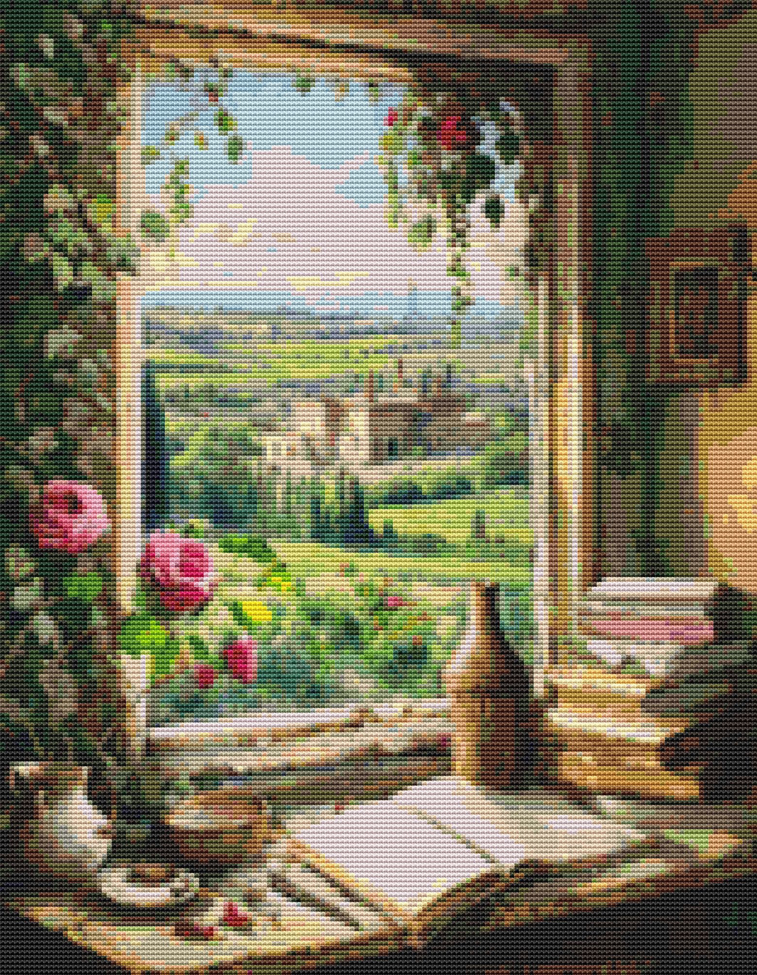 This cross stitch pattern depicts a picture of a window with a beautiful view.