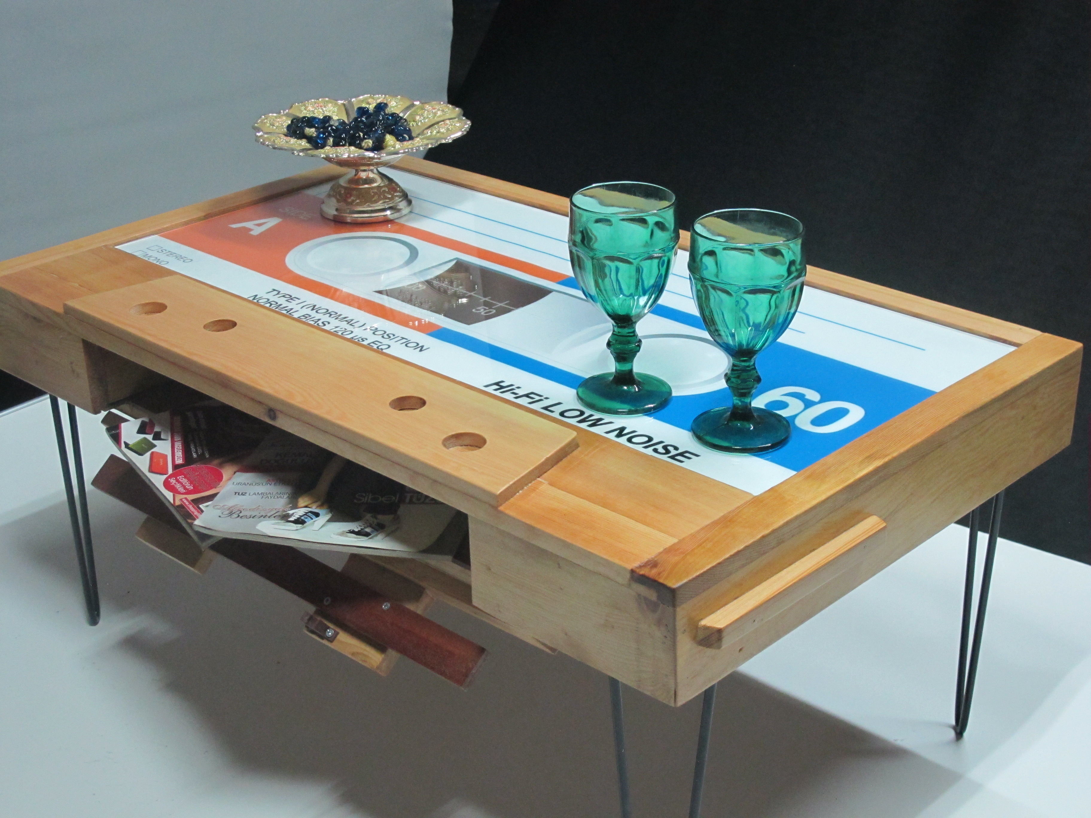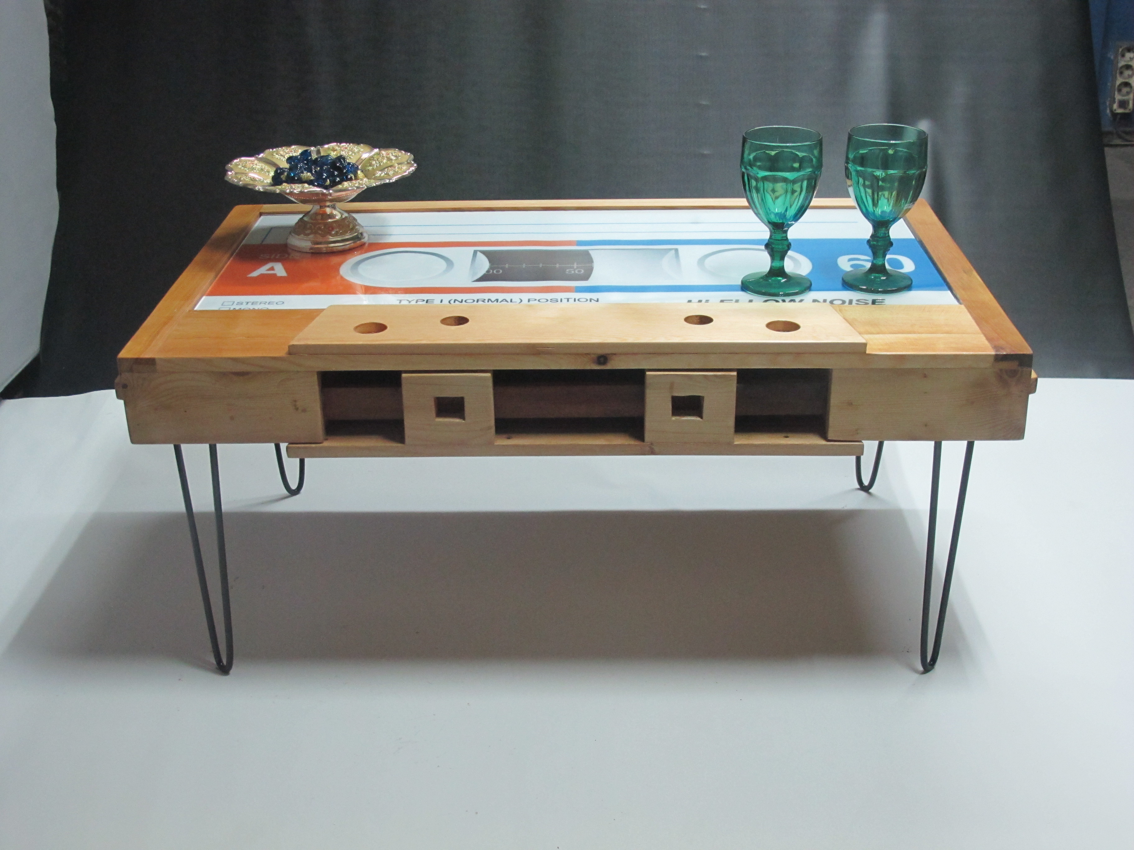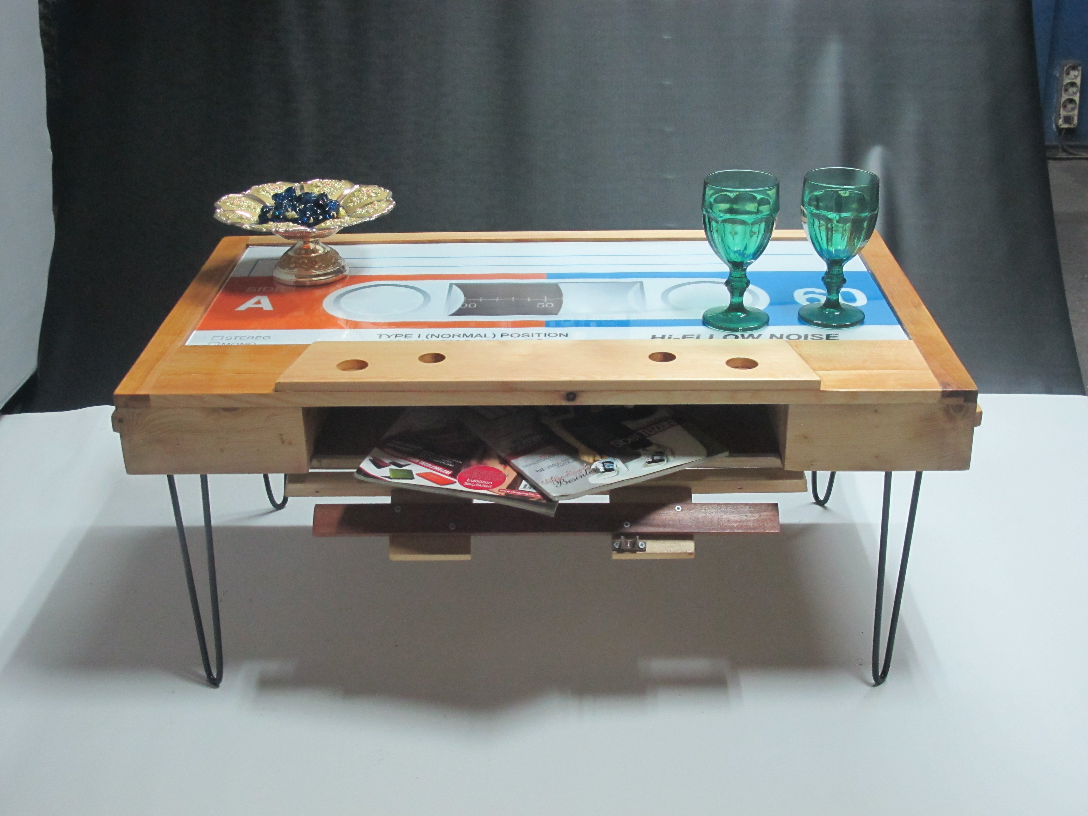 A perfect decor for music lovers or a music store. The design of this pine wood table features a gigantic cassette tape sticker on the surface along with a compartment. Add some extra decor to your living room with this 100% handmade Cassette Tape Coffee Table.