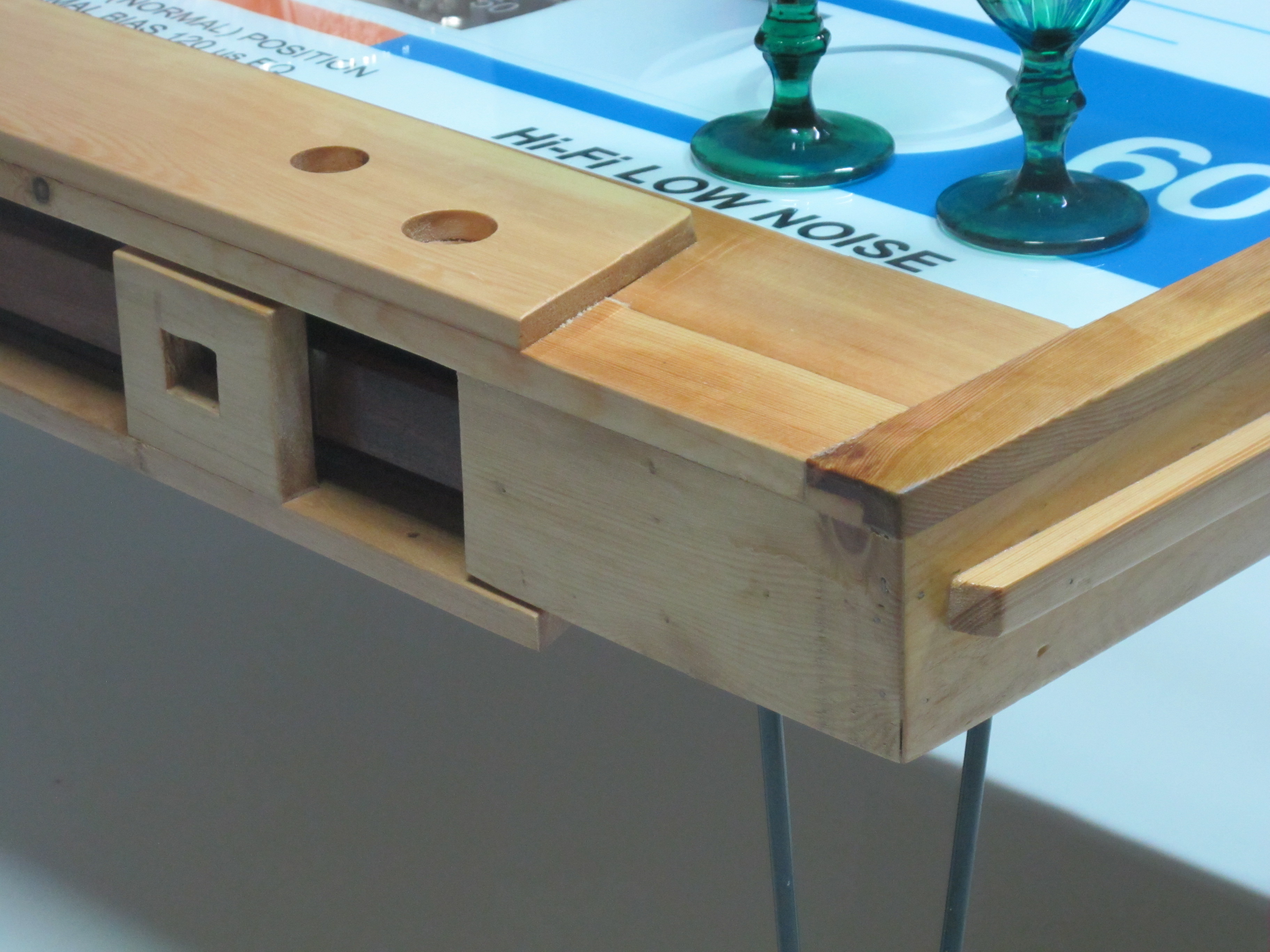 The cassette tape coffee table is a replica of an actual cassette tape, and features a hidden shelf inside the tape by pulling down on the side of it where a giant cassette player might read the magnetic strip. Plus, it only makes sense, that the shelf would be held in place using magnets. The side of the tape folds down to reveal a deep shelf.