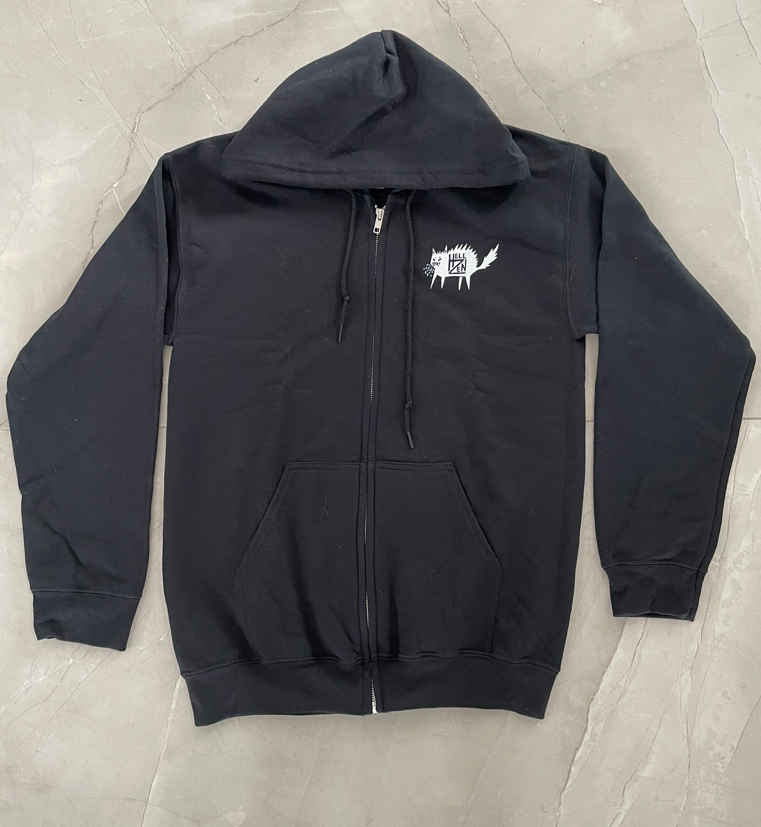 "A Cat's Life" zip-up hoodie, designed and screen-printed by Hellzen. Front and back print! Printed on black Gildan Heavy Blend zip-ups (50% cotton, 50% polyester)