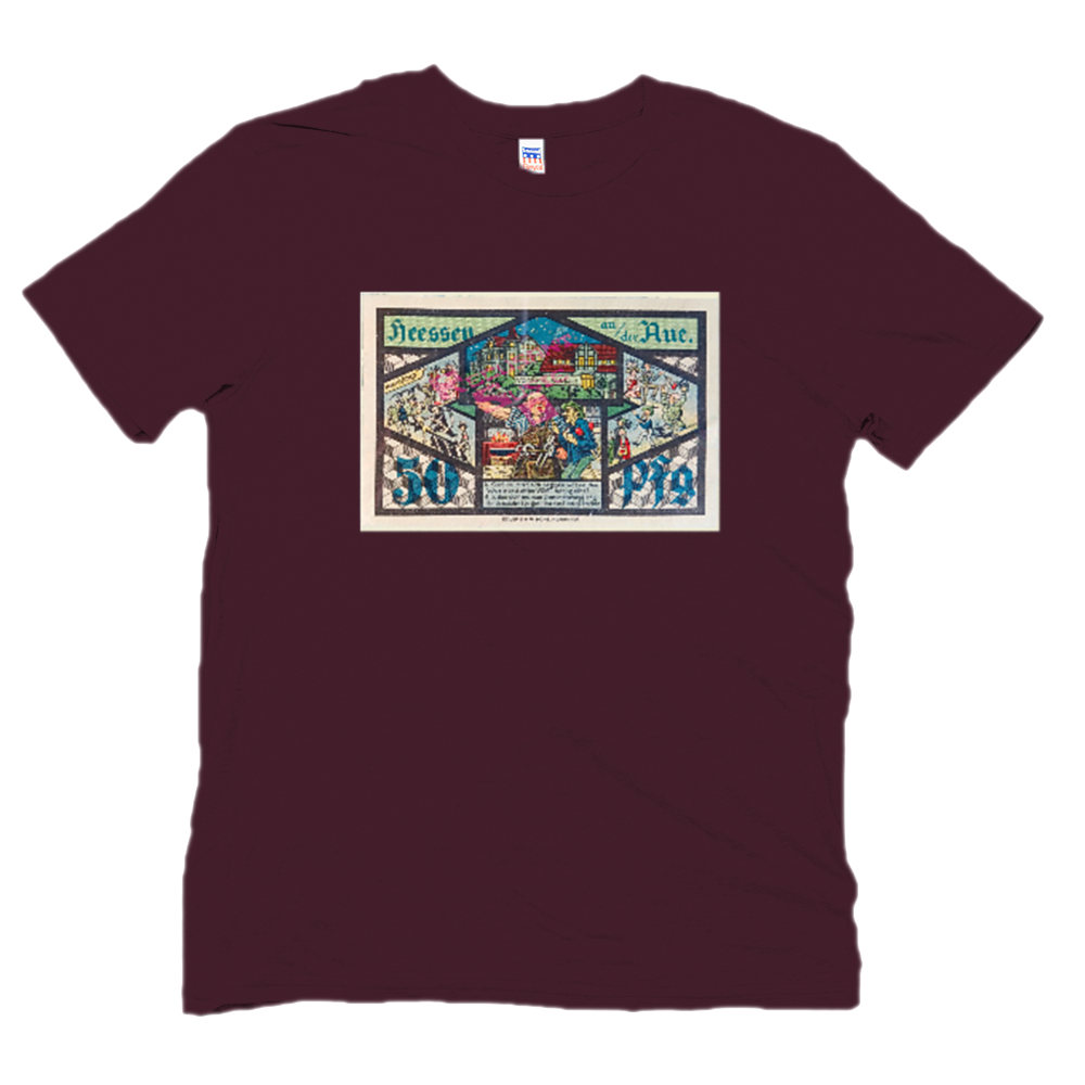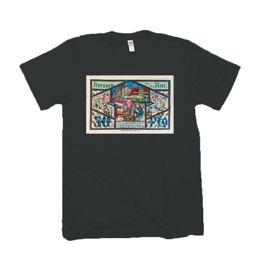 What I love about NotGeld is that they're little tiny works of limited edition art prints, smaller than a dollar bill. They're often whimsical, and culturally incomprehensible. This is a blacksmith, a 50 pfennig note, with a little parade of life and death around the borders. I take all the macro photos of bills from my son's private collection, then expand them up to 300dpi print size for the shirts and posters.