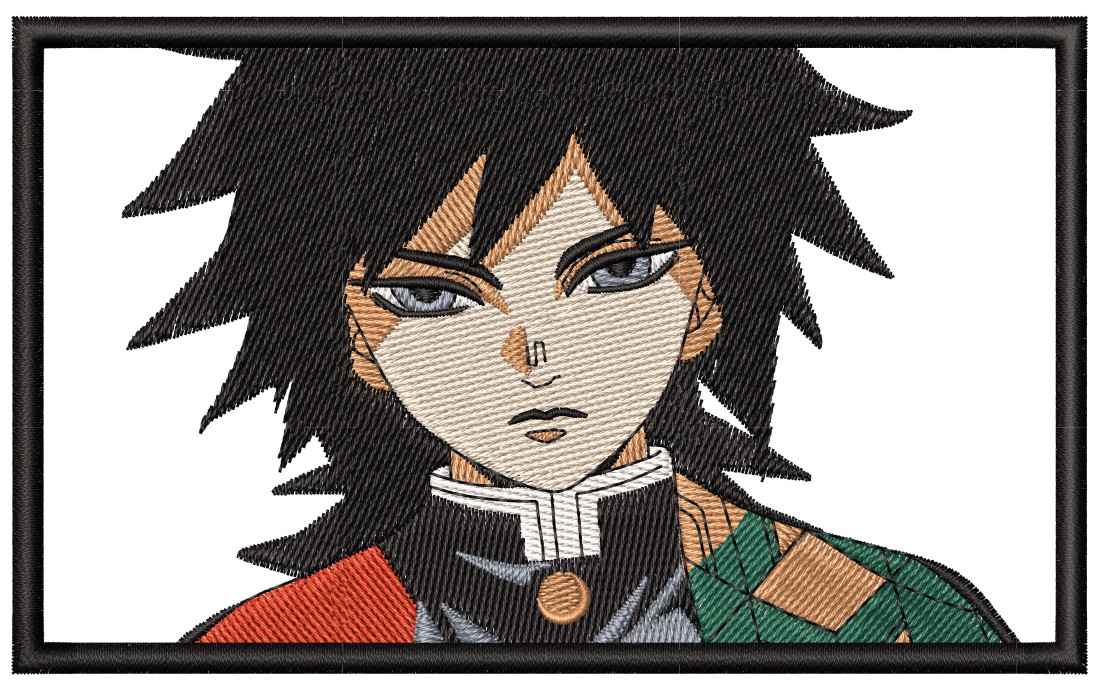 This custom anime machine embroidery design and pattern features the Demon Slayer character Giyu Tomioka bust framed.