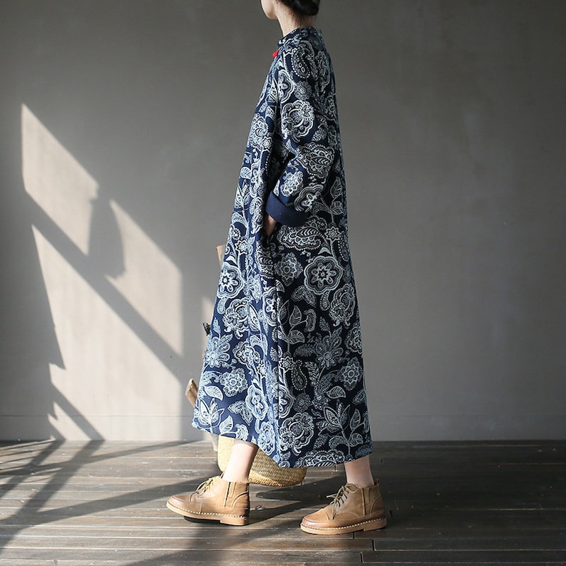 Loose Winter Dress, Linen and Cotton Dress, Blue floral, Chinese Frog Button, winter robe, winter long coat, women robe, women dress-1