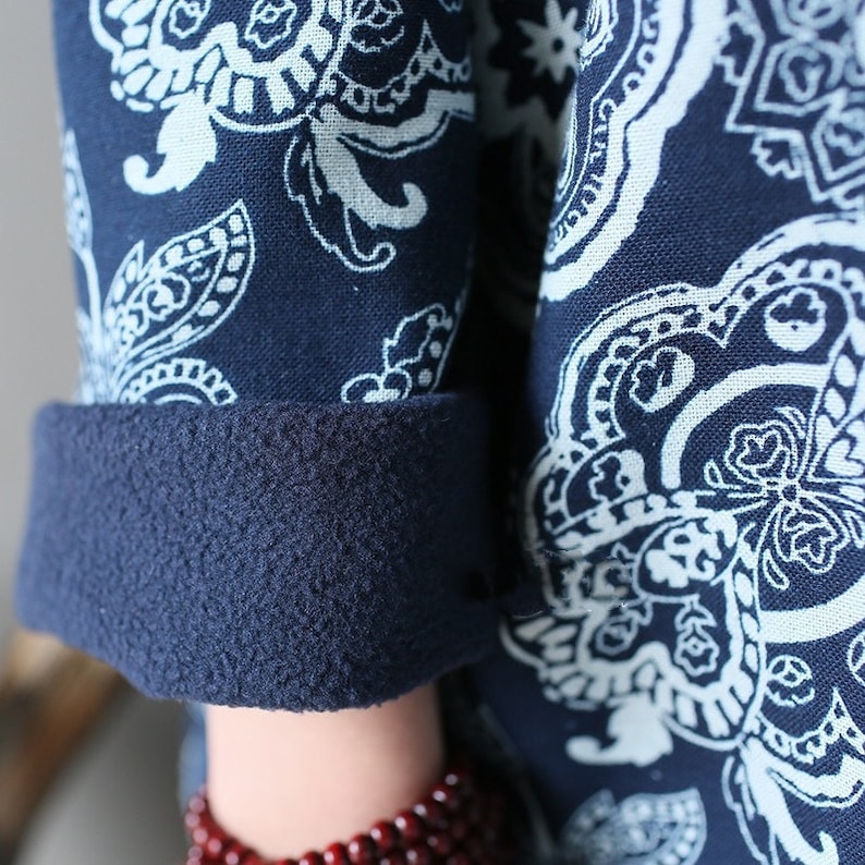 Loose Winter Dress, Linen and Cotton Dress, Blue floral, Chinese Frog Button, winter robe, winter long coat, women robe, women dress-2