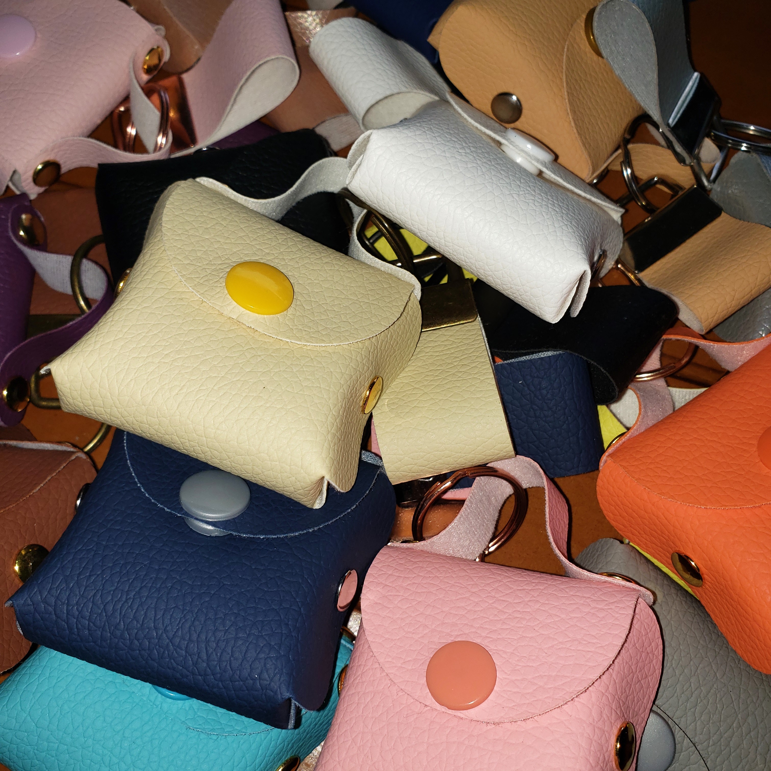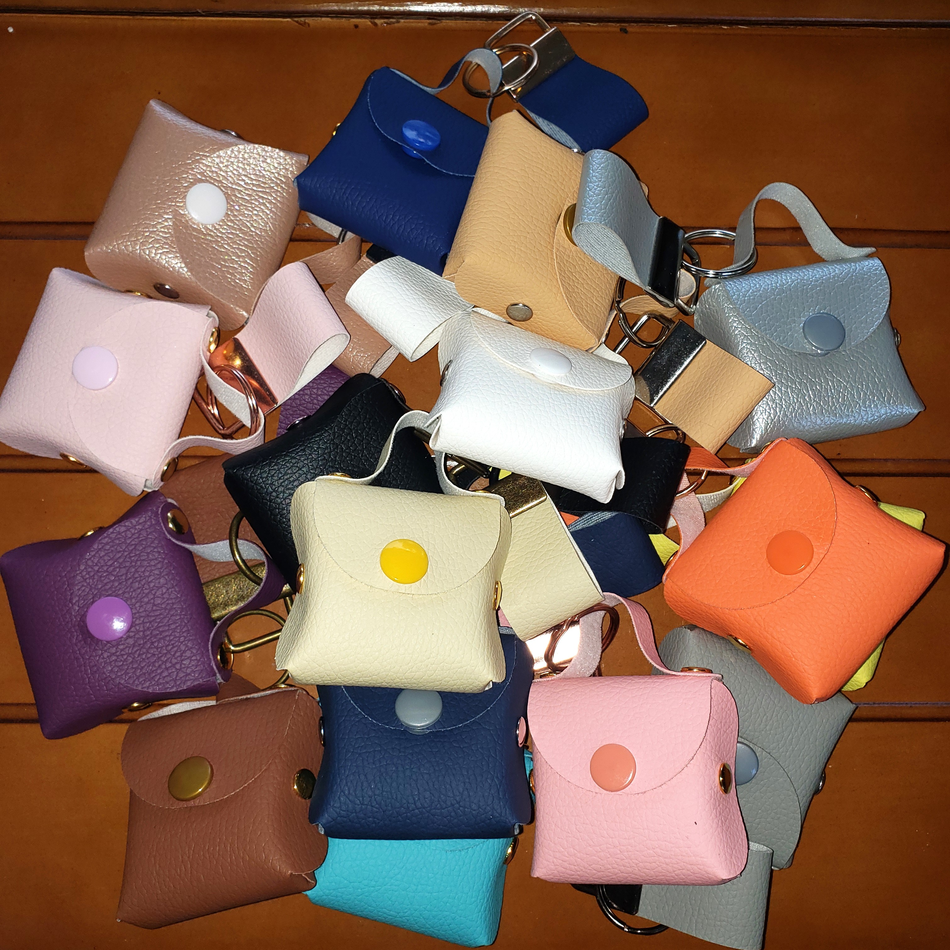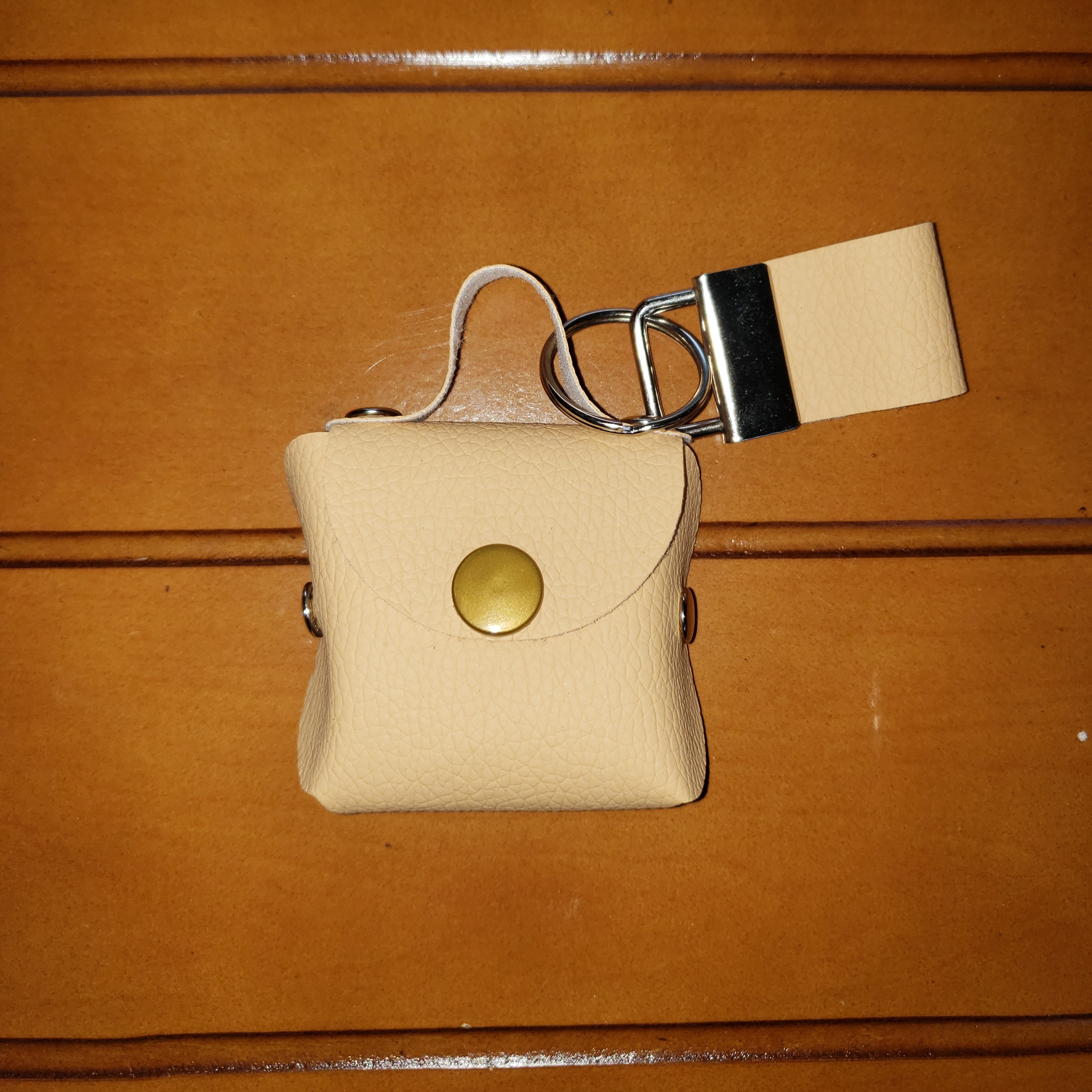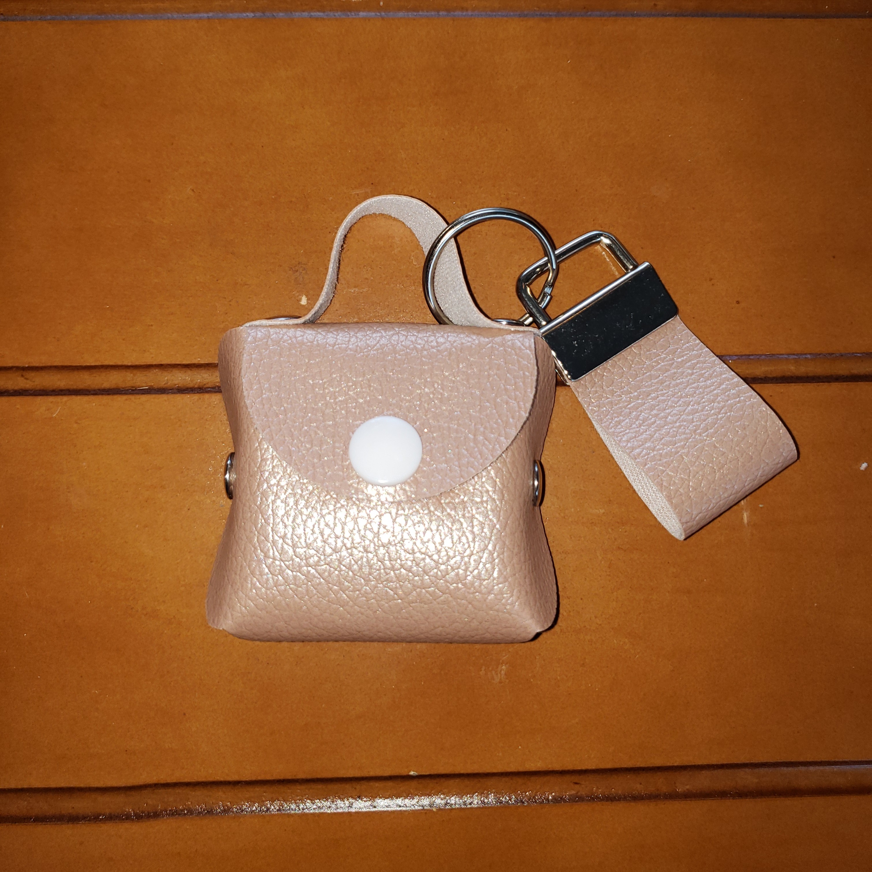Mini coin purse with top handle, snap closure, and matching key fob. Will hold wired headphones, airpods, cash, and change. Great for keeping change close by.