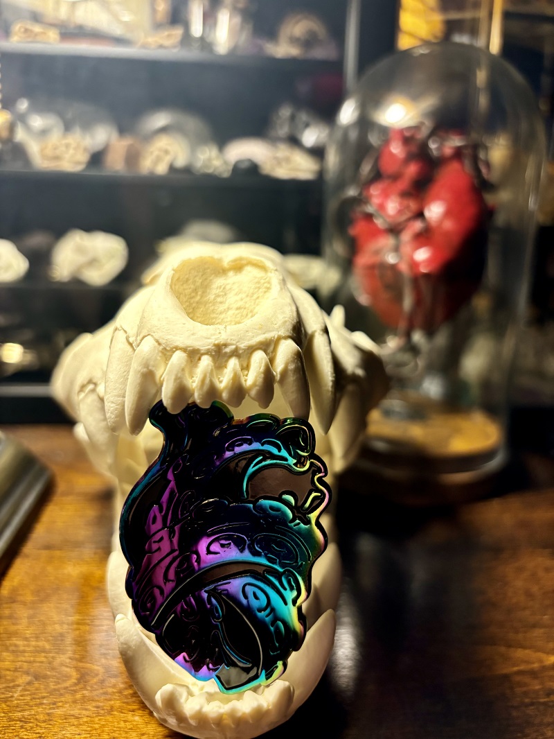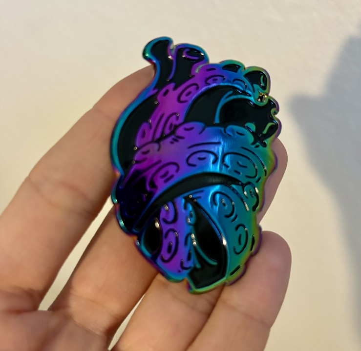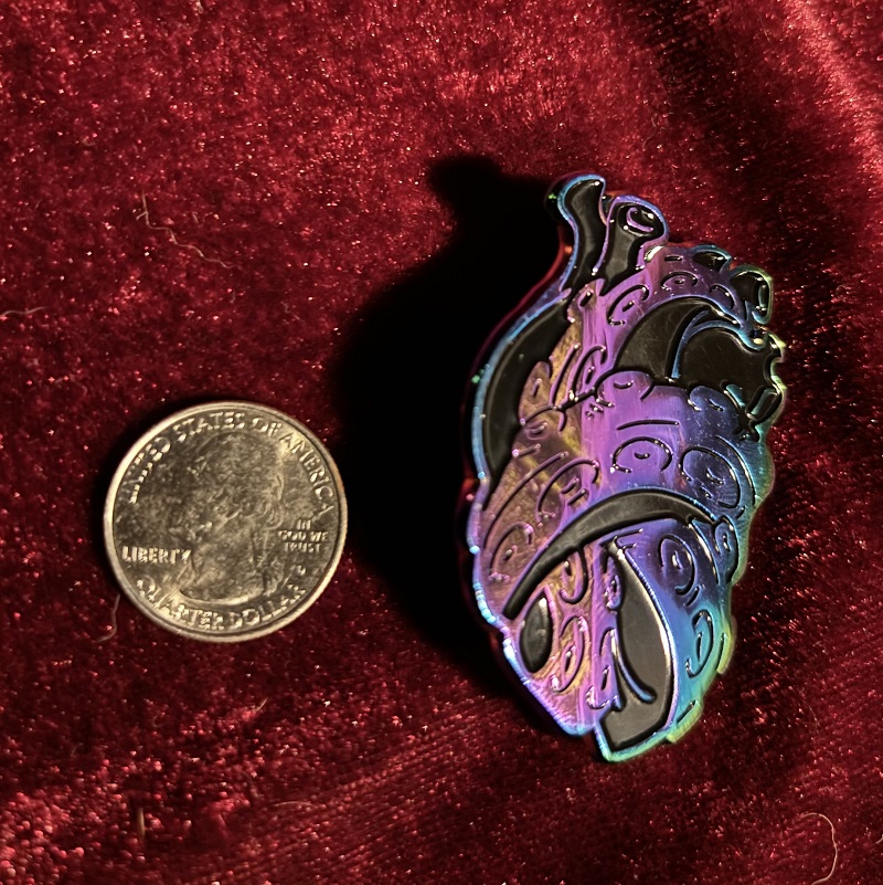 a soft enamel pin with anodized "rainbow" effect PLEASE NOTE: each pin has a unique coloration, so if you have a preference for color, please say so in the comment box at checkout (ex: "purple preference" or "I like green!") if not I will choose one at random for you