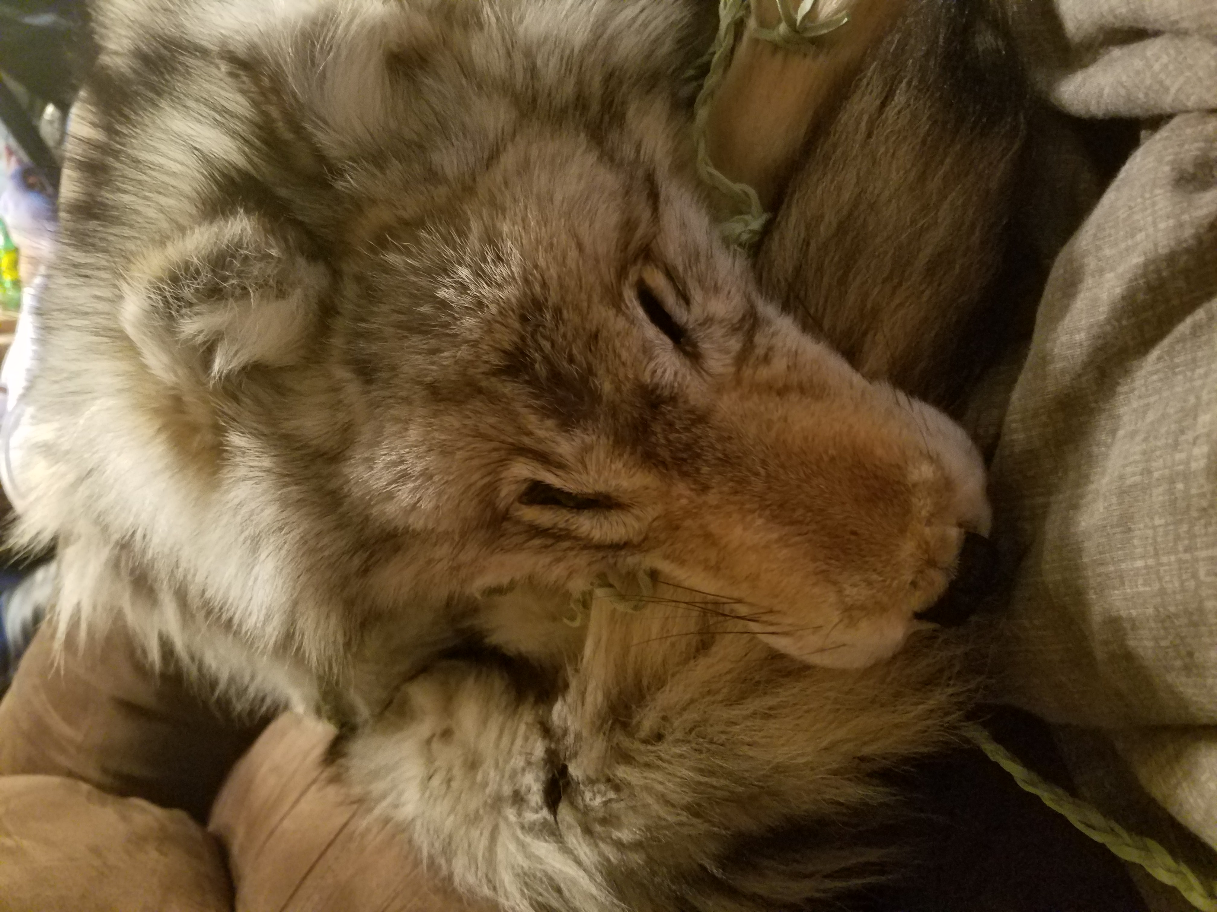 This is an absolutely gorgeous grey wolf headdress. The wolf pelt itself has fluffy fur with green dyed deer leather straps hand braided. The wolfs face is shaped nicely but does have one ear tip that is missing from being out in the wild. As an animal advocate all of my items are eco friendly meaning the animals passed of natural causes out in the wild. This pelt/headdress also does not come with any paws. Very beautiful guy to wear for any sort of festivals including rreinassance festivals or simply hung up as part of a spiritual altar. His energy is very calm and sweet. Thanks for stopping by! I really hope this guy finds someone who will love him as much as i have.