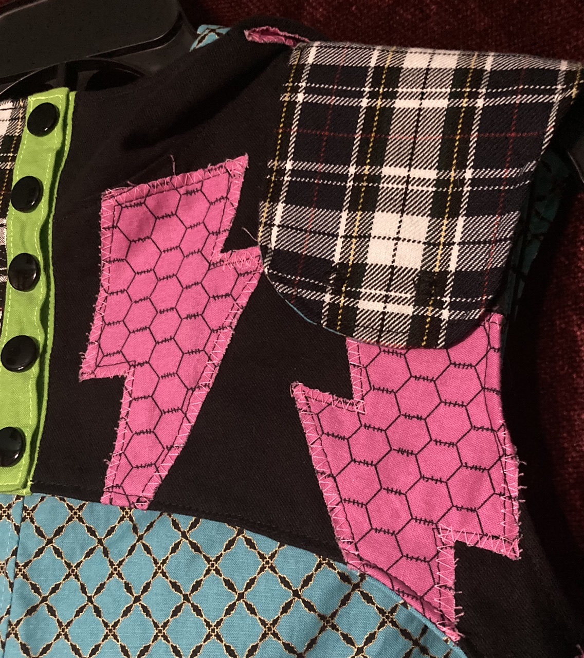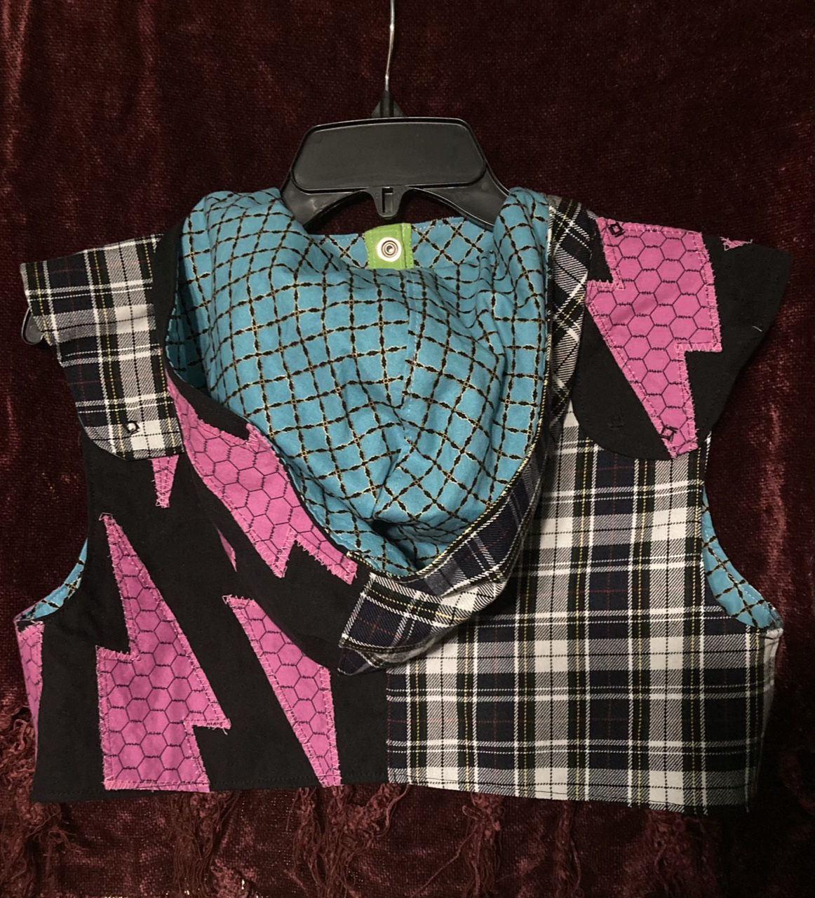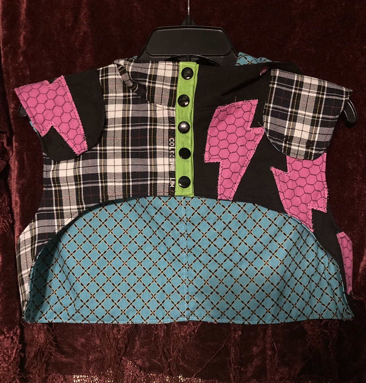 Inspired by G3 Frankie Stein from Monster High. Outer shell made from two denim-like fabrics, and lined with plain cotton. Sits just above the bust. Epaulettes are detatchable. Measurements (refer to last pictures for reference). These are the measurements of the garment laid out flat. 1. 15.75in 2. 18.25in 3. 3.75in 4. 11.5in 5. 6.5in