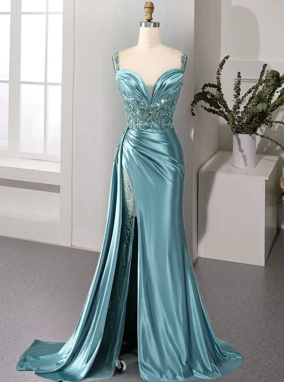 Luxury Mermaid V Neck Satin Slit Long Sequin Bead Tube Lace Sequin Ball Gown Party Dress Special Occasion Dress-1