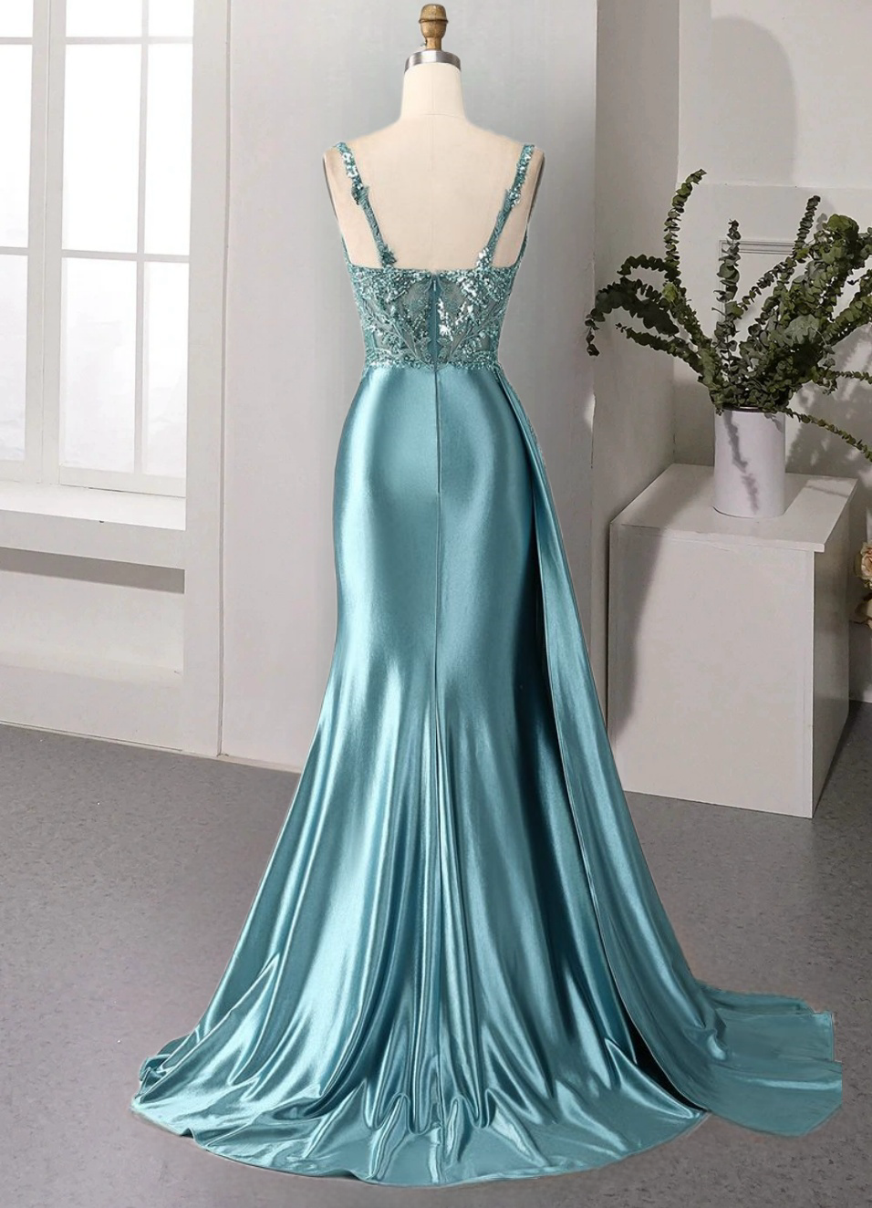 Luxury Mermaid V Neck Satin Slit Long Sequin Bead Tube Lace Sequin Ball Gown Party Dress Special Occasion Dress-4