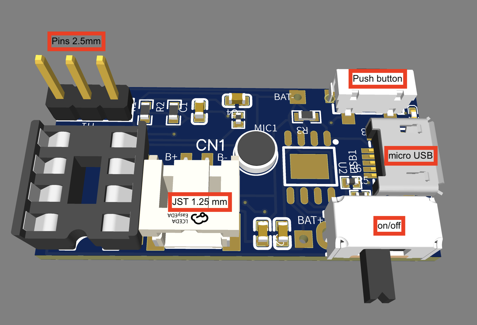 You can use the PCB without a battery but the audio input will get noise from the charger. Recommended is a 3.7V LiPo battery (min 250mAh) with BMS integrated and JST 1.25mm connector, but any other capacity will do. There are also separate solder pads for the battery in case of bare cables. For 1m LED strip use at least 2000mAh battery.
