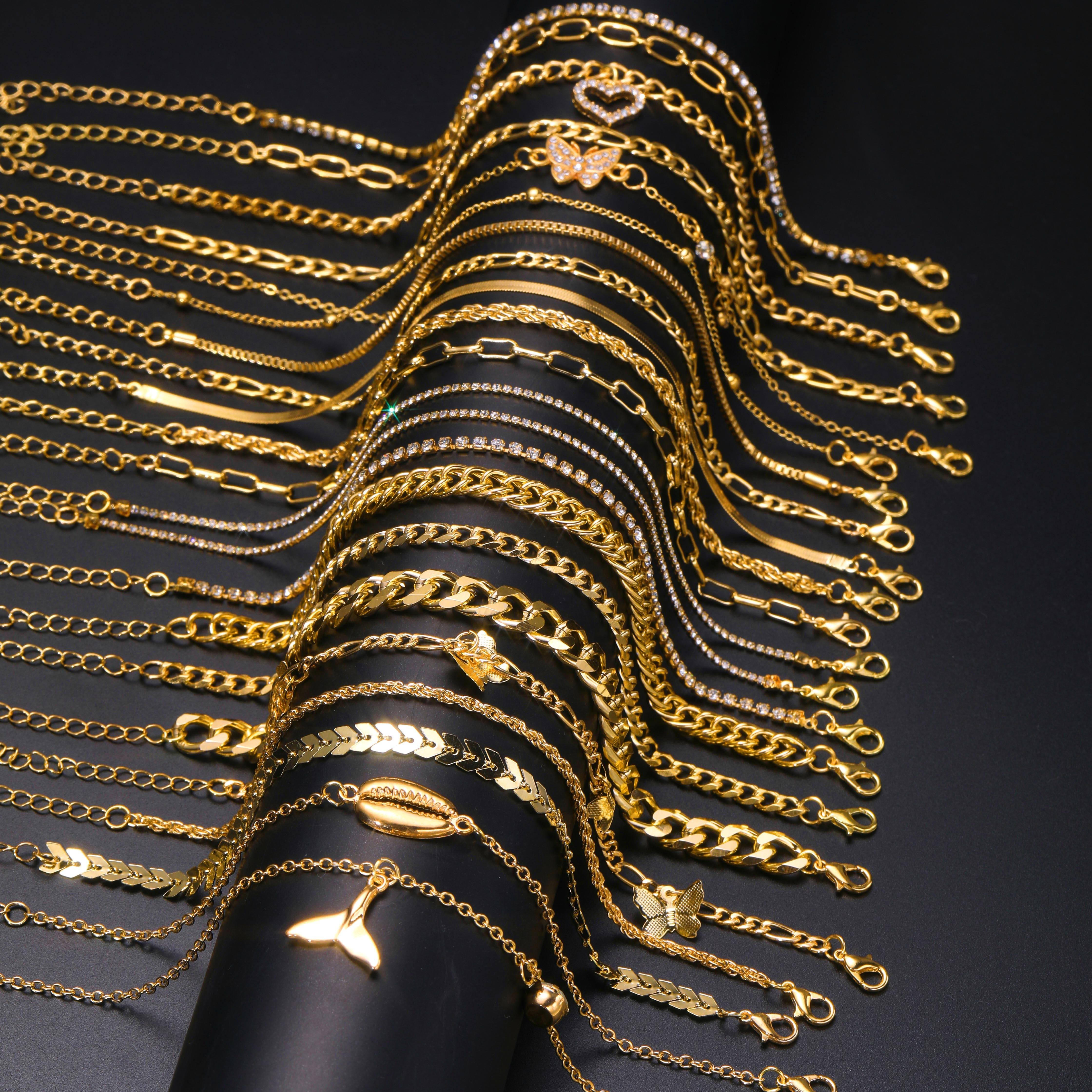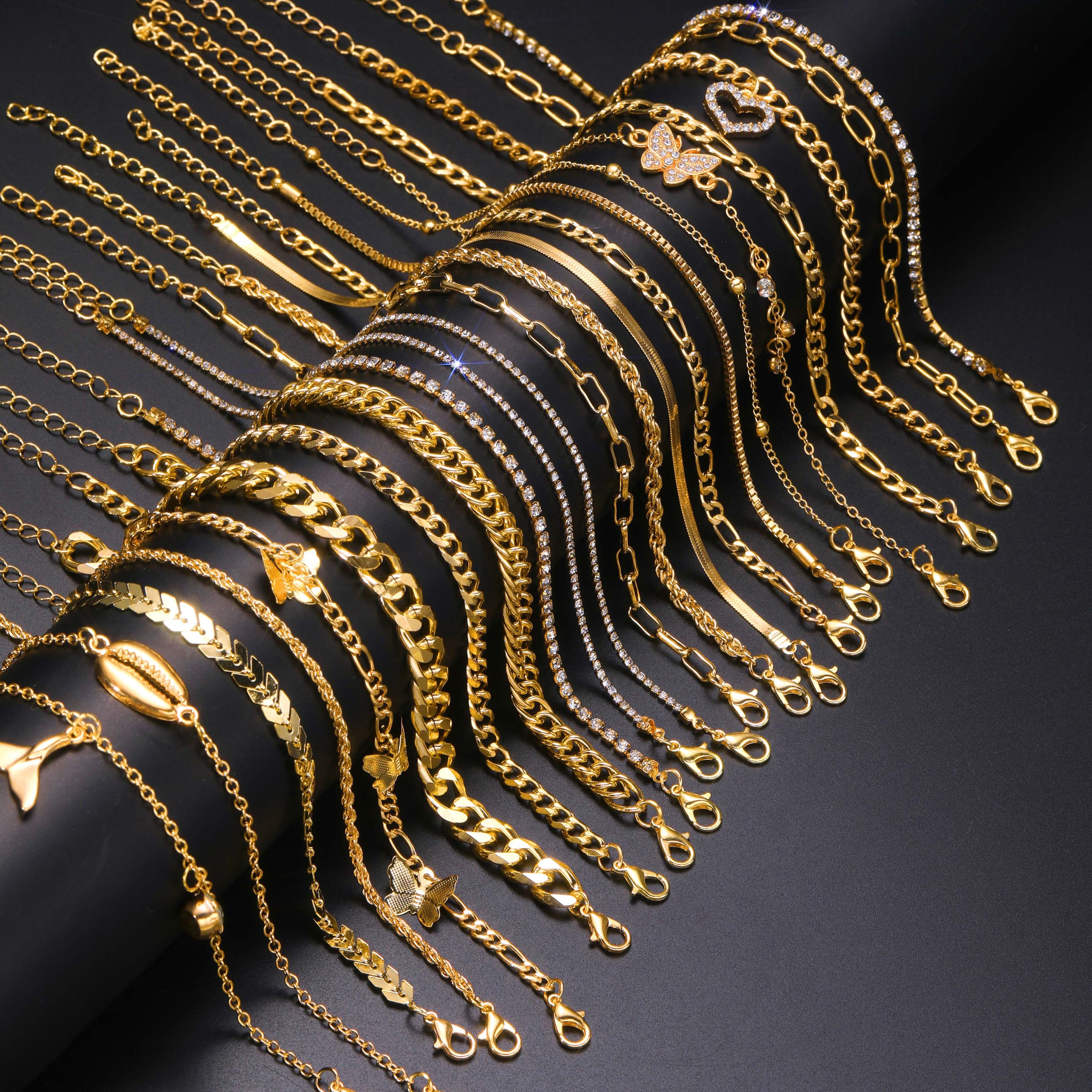 17-Piece Elegant Golden Tone Anklet Set Elevate your style with this stunning 17-piece anklet set, perfect for summer vacation and daily wear. Description: - Material: Zinc Alloy (main material), Rhinestones (mosaic) - Style: Vintage, Elegant - Occasion: Daily Wear, Party Occasion - Season: Summer - Holiday: Valentine's Day Features: - 17-piece set includes various charms: butterfly, hollow heart, shell, and more - Golden tone metal chain with rhinestone accents - Vintage-inspired design adds a touch of elegance - Perfect gift for women on Valentine's Day or any occasion