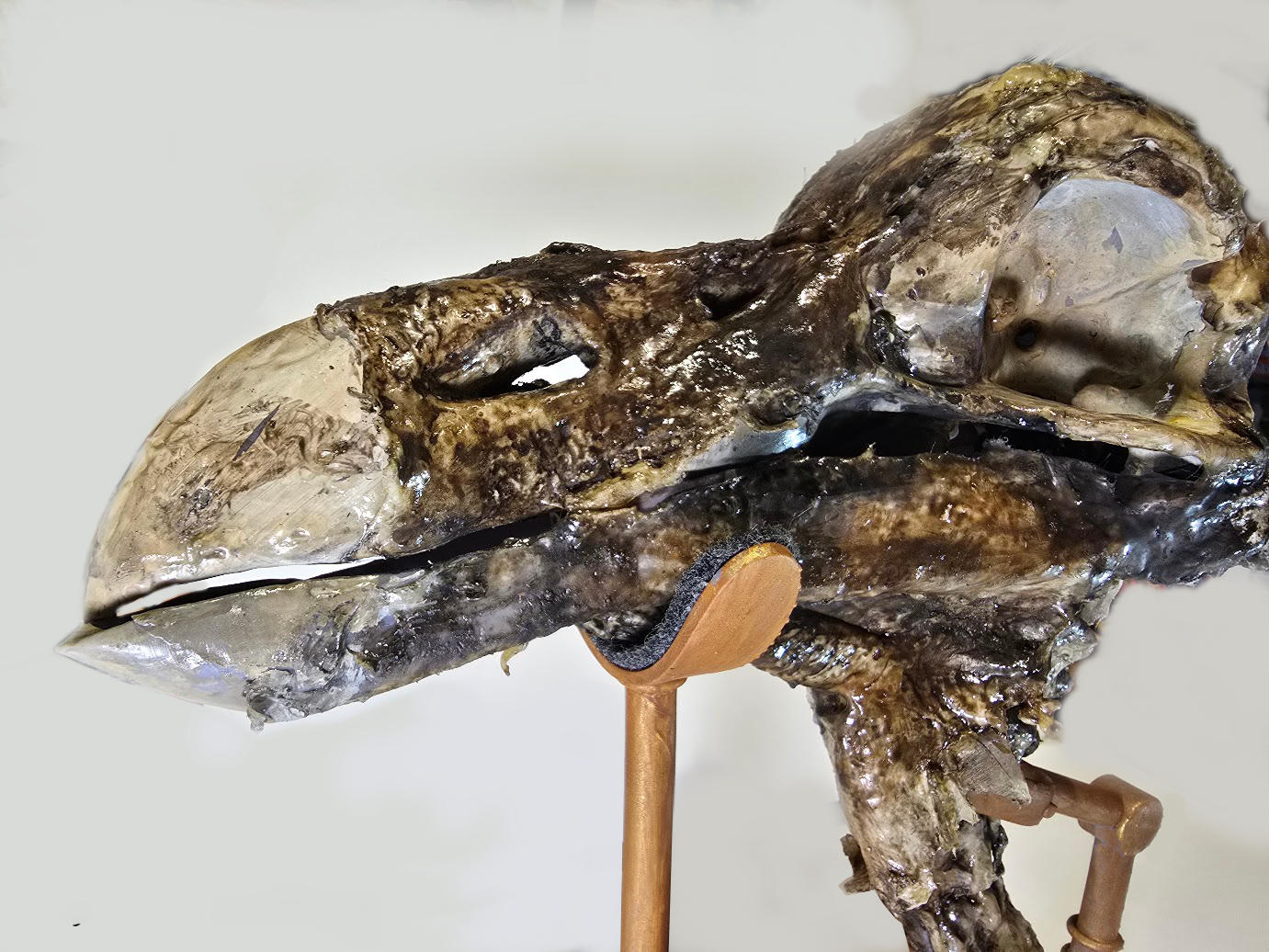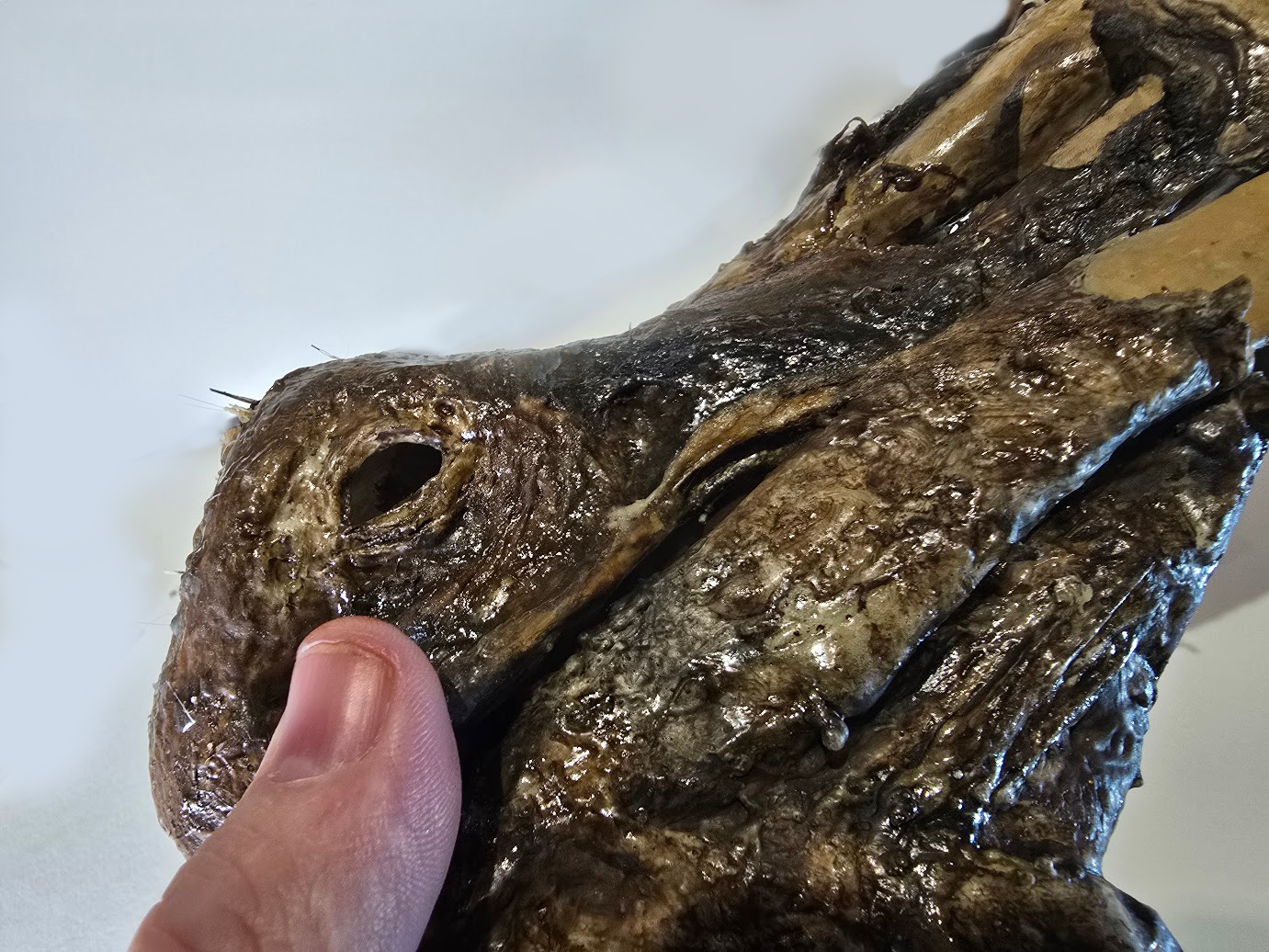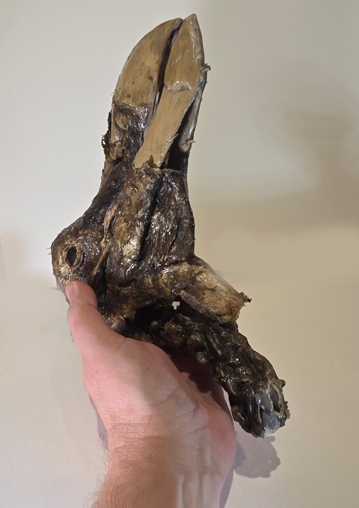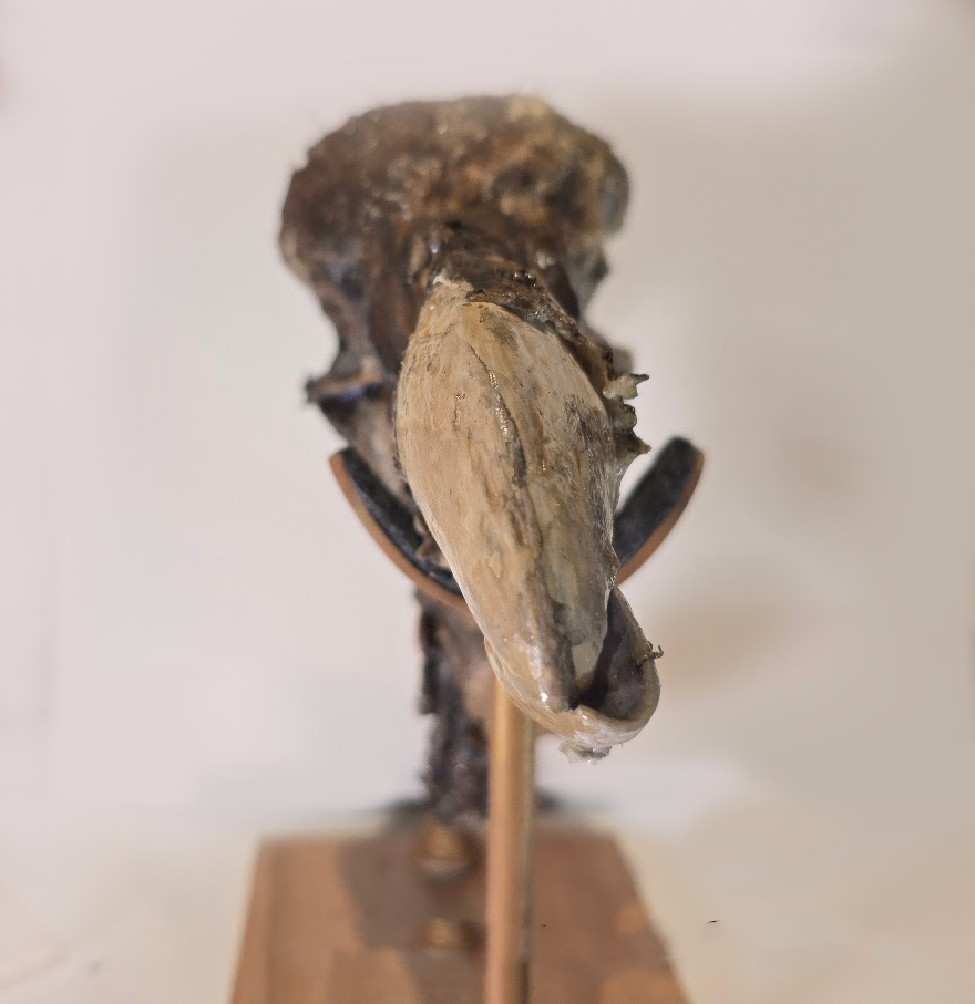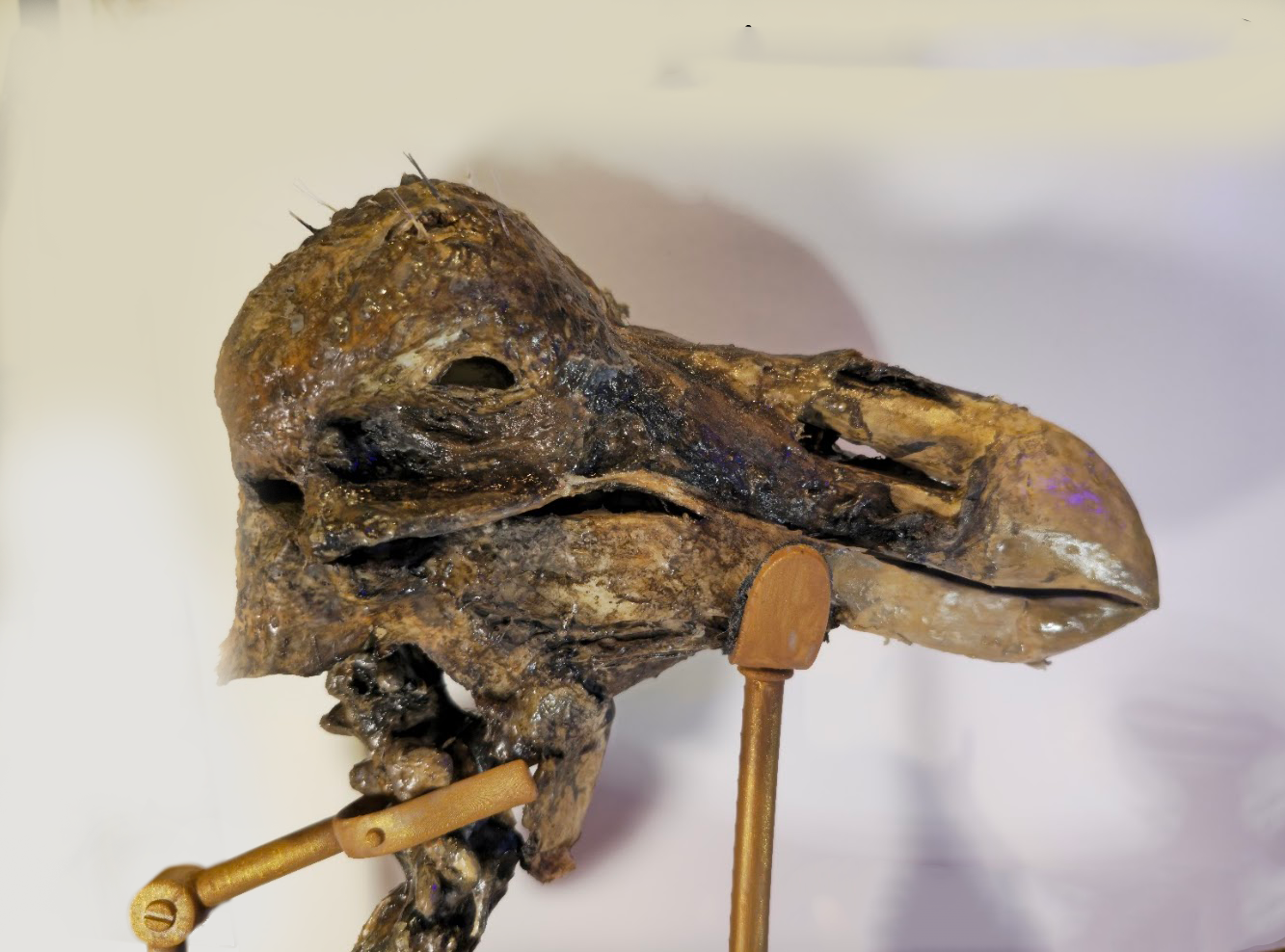 "Step right up, ladies and gentlemen, and feast your eyes upon a most extraordinary specimen—a mummified Dodo head, the very essence of a bygone age! This peculiar bird, a flightless marvel of nature, hails from the verdant isle of Mauritius, where it once strutted with regal aplomb before succumbing to the relentless tide of human progress. Behold its stout beak, an enigma of evolution, and the delicate remnants of plumage that tell tales of a time long lost. Gaze upon this curious treasure, a striking reminder of the fragility of life and the wonders of our natural world! Come, marvel at the Dodo—a symbol of both whimsy and woe, preserved for eternity in our grand display of nature's most fascinating curiosities!" - World Famous Dave Ensign