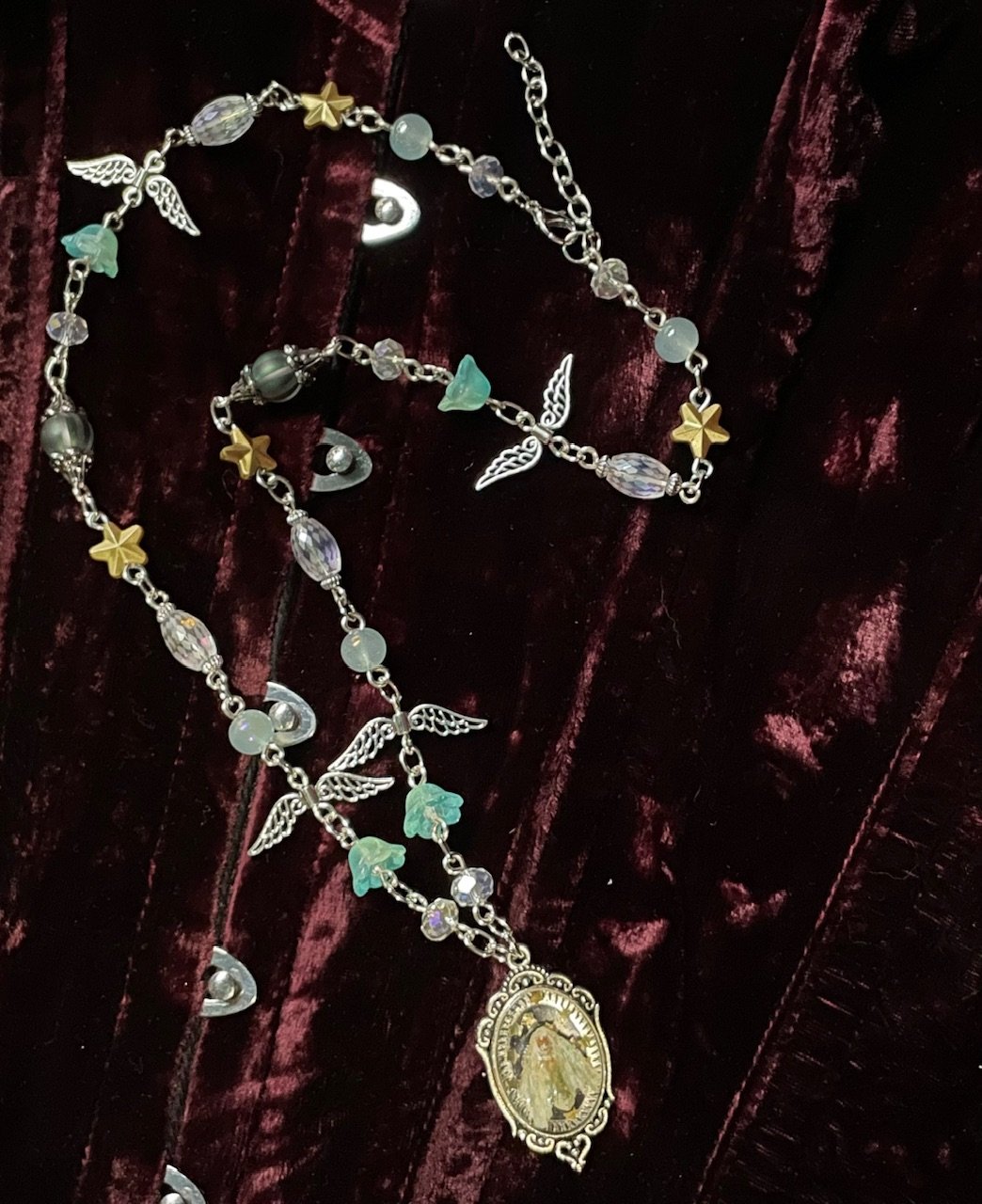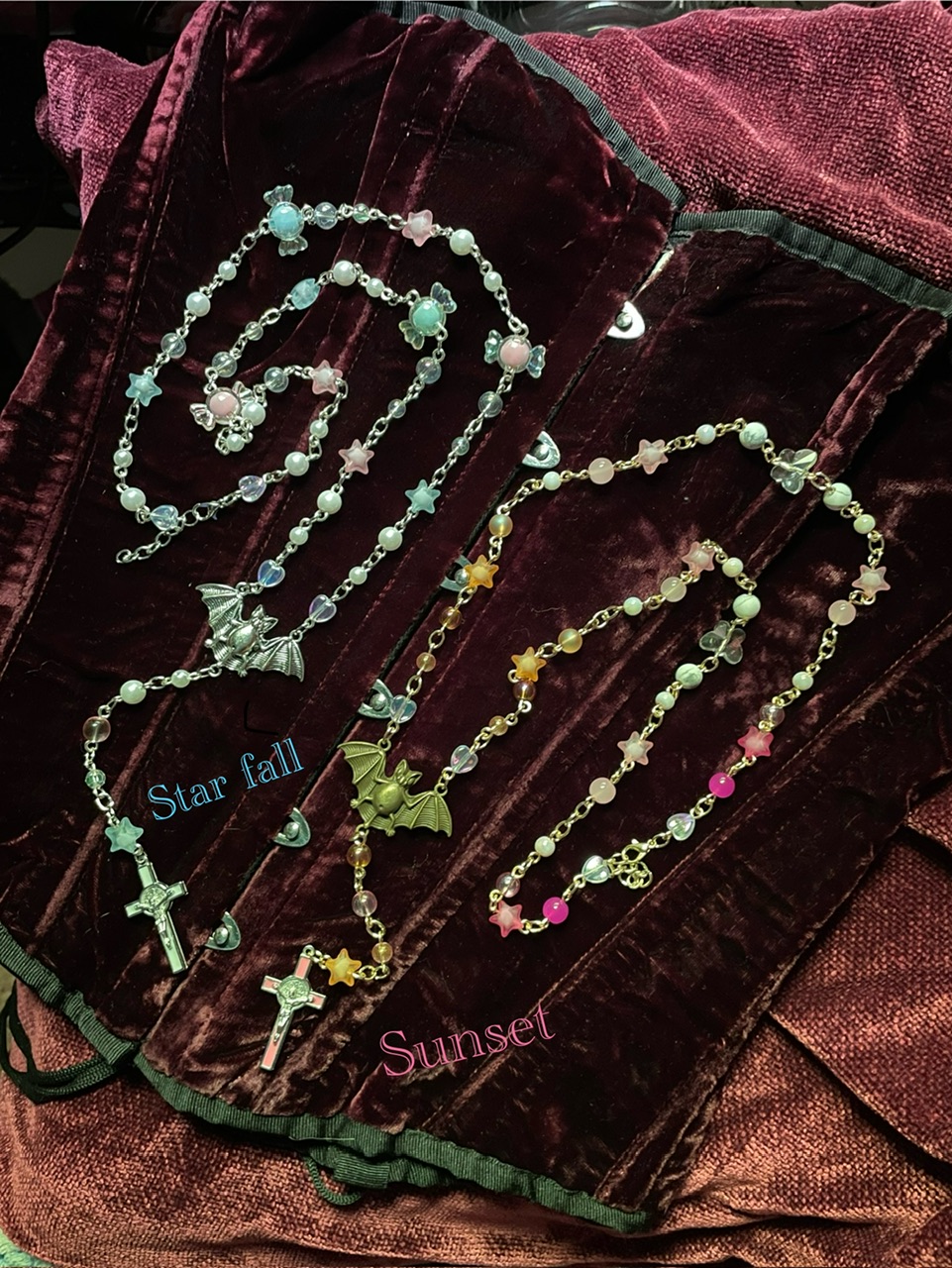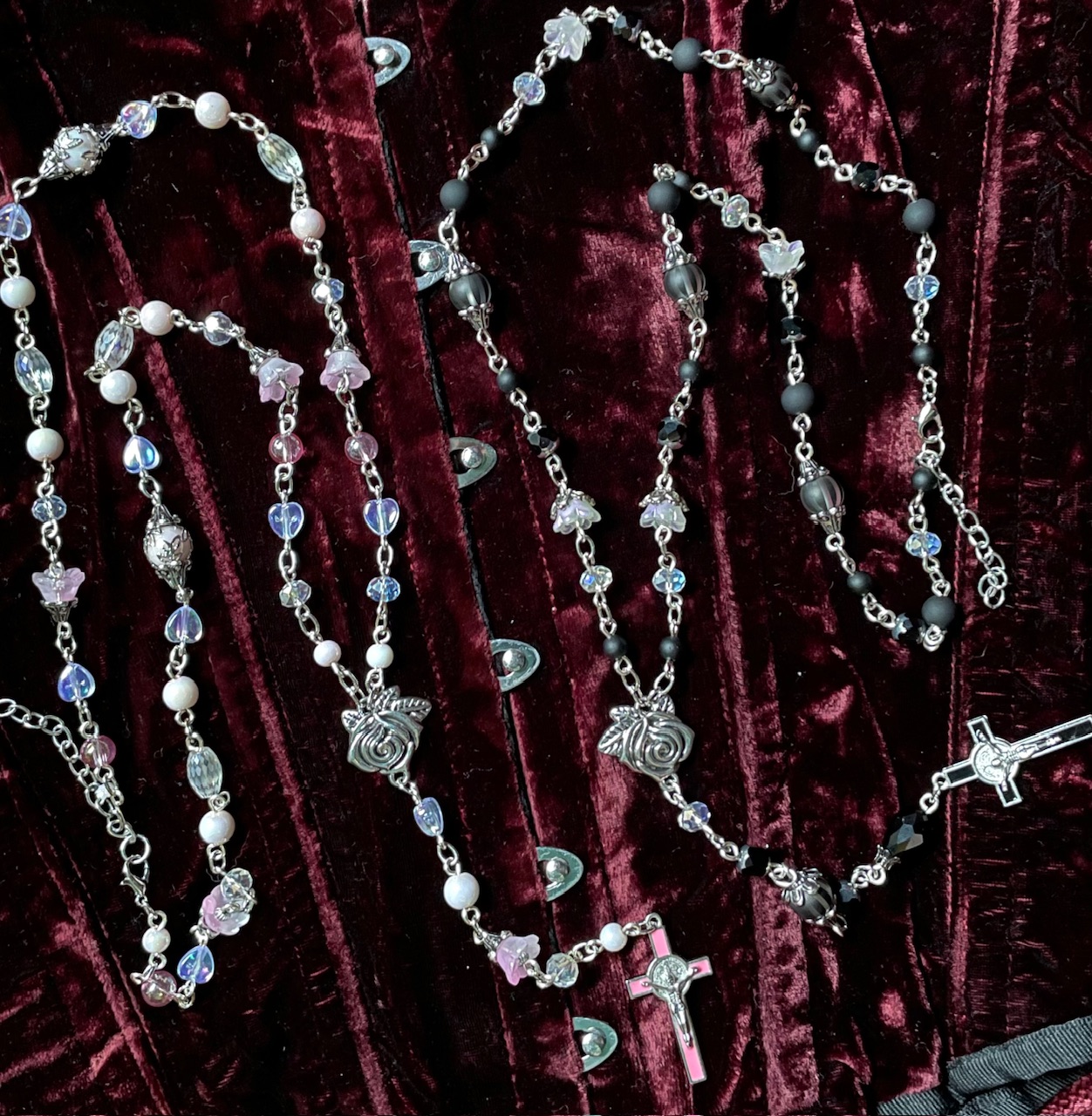 The handful of jewelry I made recently that I don't feel like categorizing in the other listings right now. 1: Double strand Valentine rosary-- 6.5 in. & 17.5in lengths 2: Pink Valentine Rosary-- 22in. length 3: "Mourning" rosary--20in. length 4: "Crystalized" necklace-- 11in. length StarFall Rosary— 22in length Sunset Rosary— 21.5in length Blue Lily of Valley earrings— 2in length White Lily of Valley earrings— 2in length Pink Lily of Valley earrings— 2in length