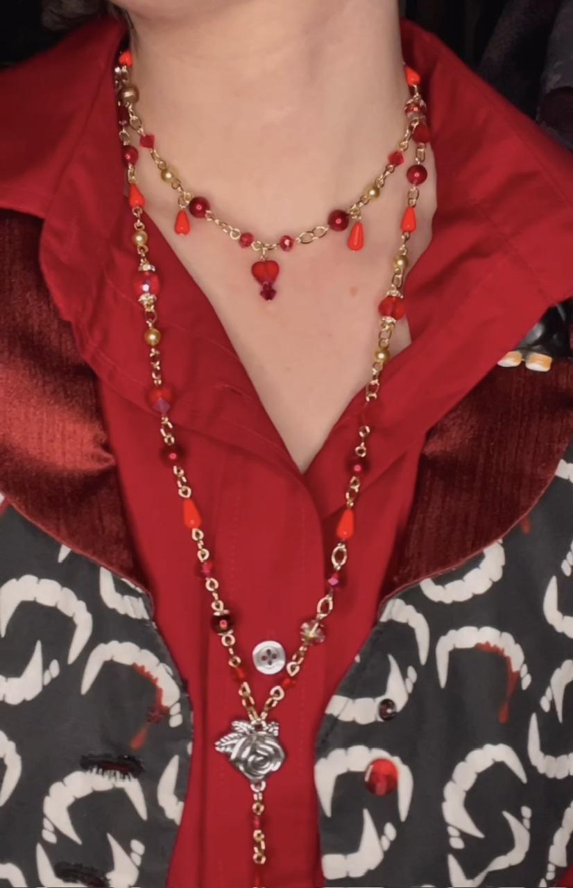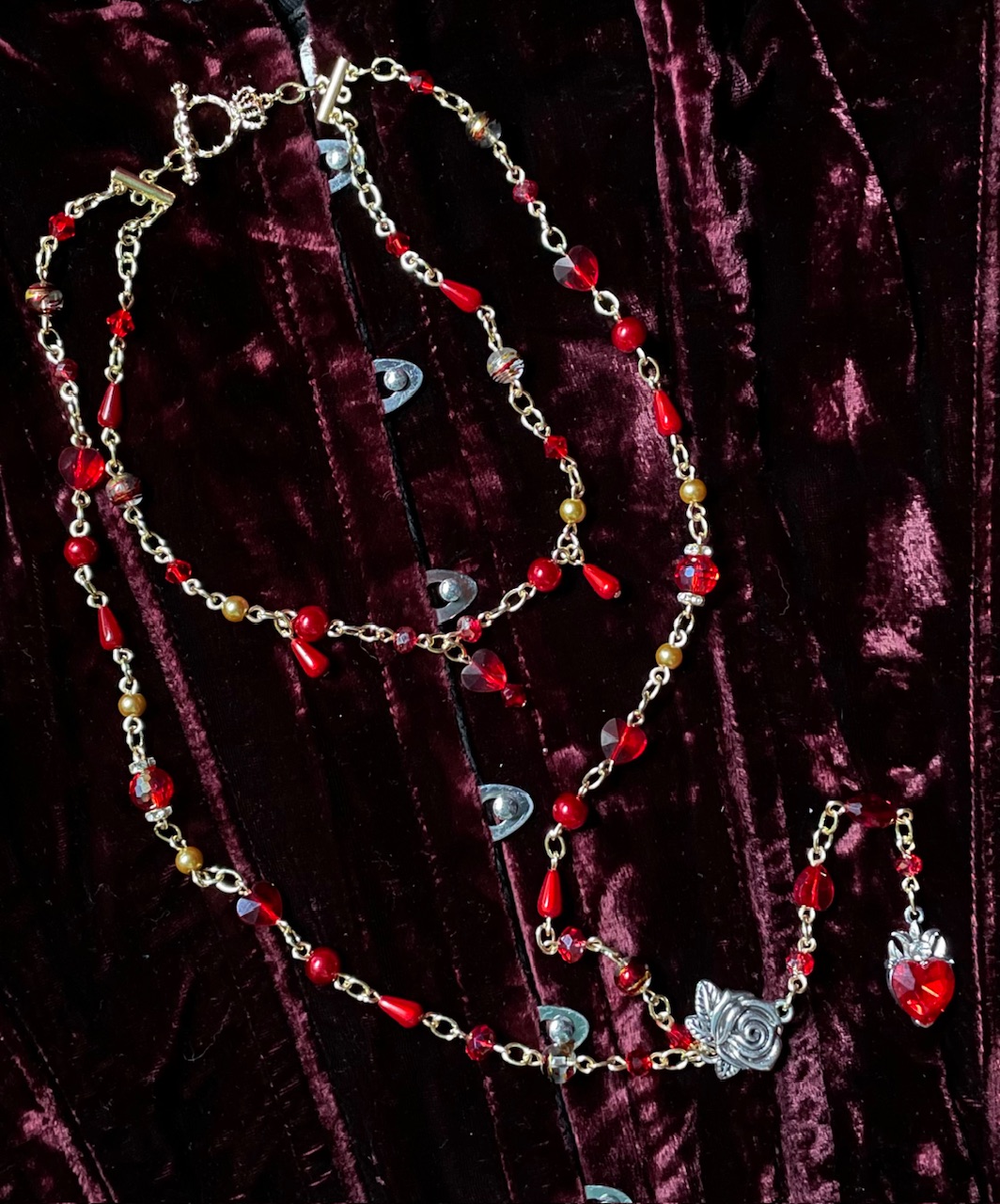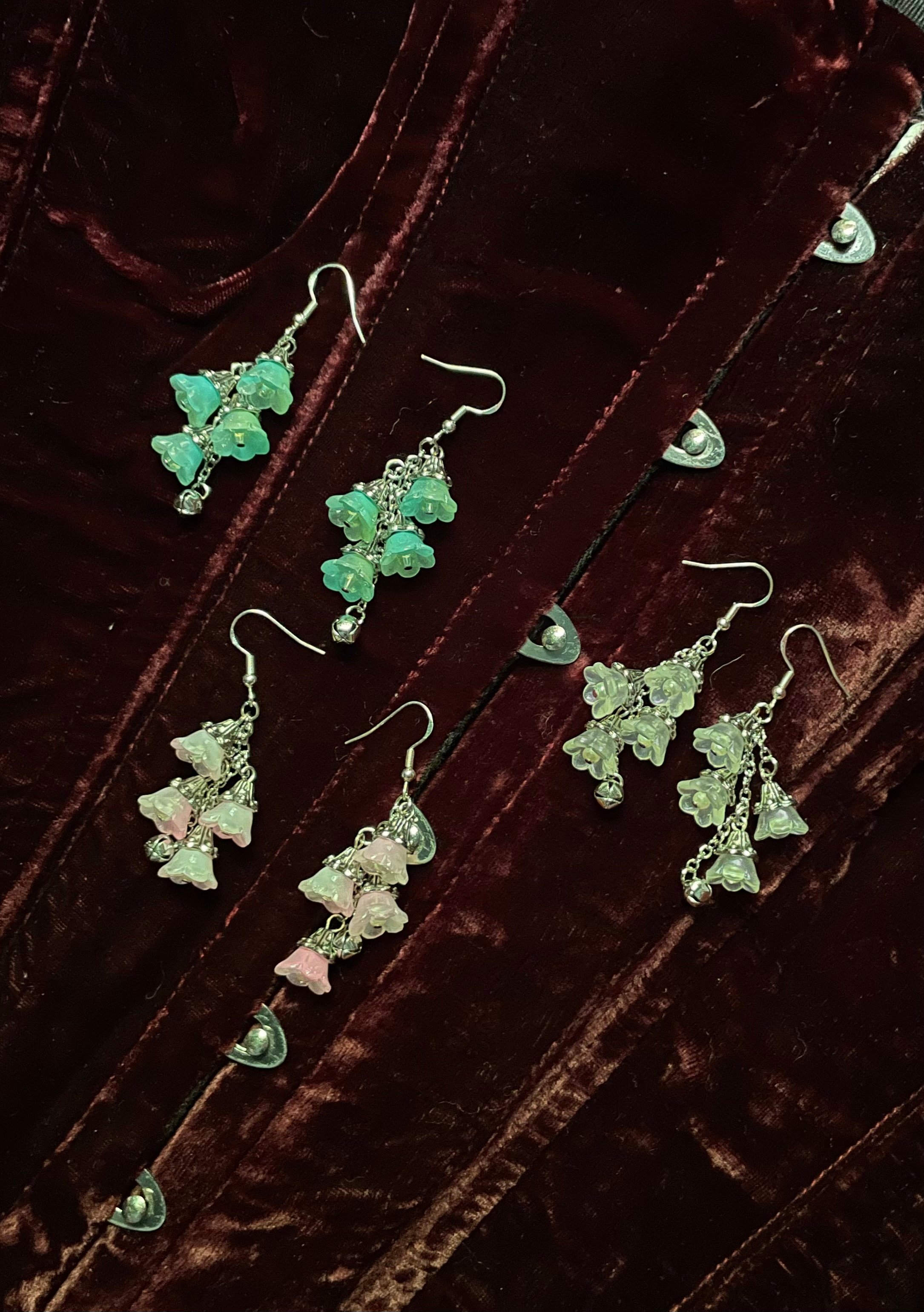The handful of jewelry I made recently that I don't feel like categorizing in the other listings right now. 1: Double strand Valentine rosary-- 6.5 in. & 17.5in lengths 2: Pink Valentine Rosary-- 22in. length 3: "Mourning" rosary--20in. length 4: "Crystalized" necklace-- 11in. length StarFall Rosary— 22in length Sunset Rosary— 21.5in length Blue Lily of Valley earrings— 2in length White Lily of Valley earrings— 2in length Pink Lily of Valley earrings— 2in length