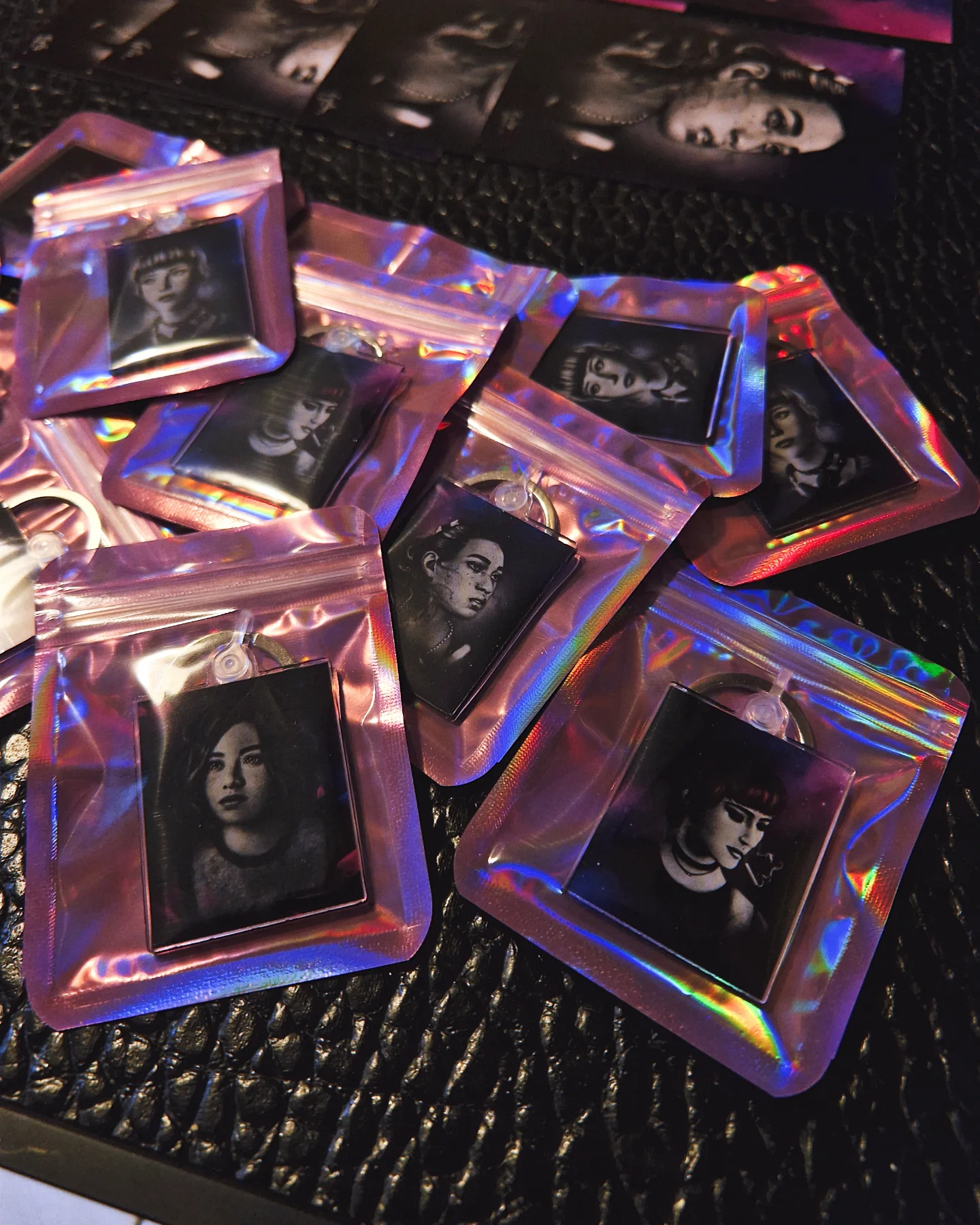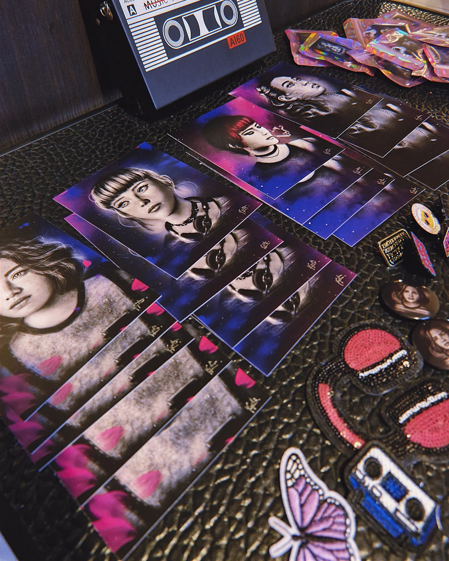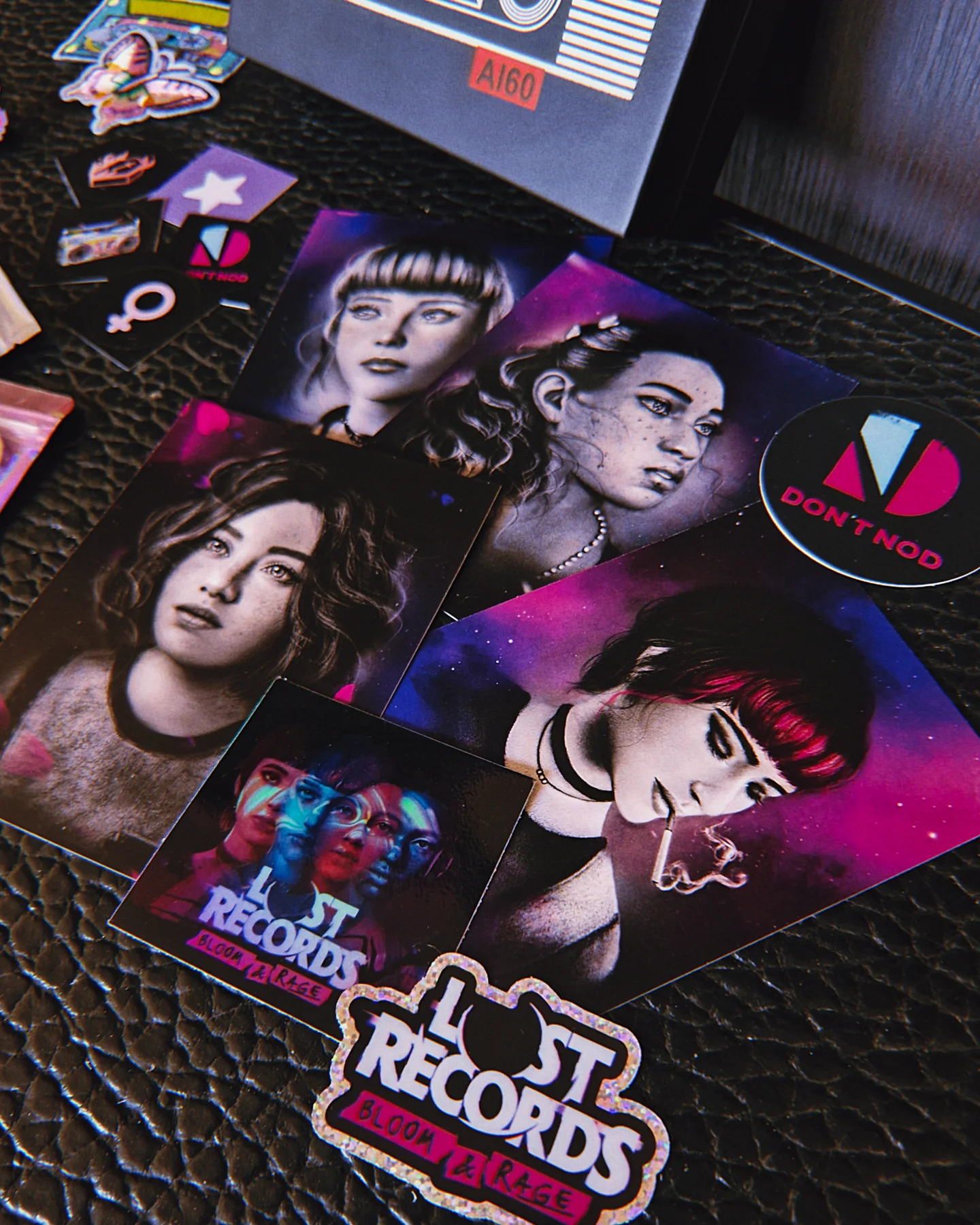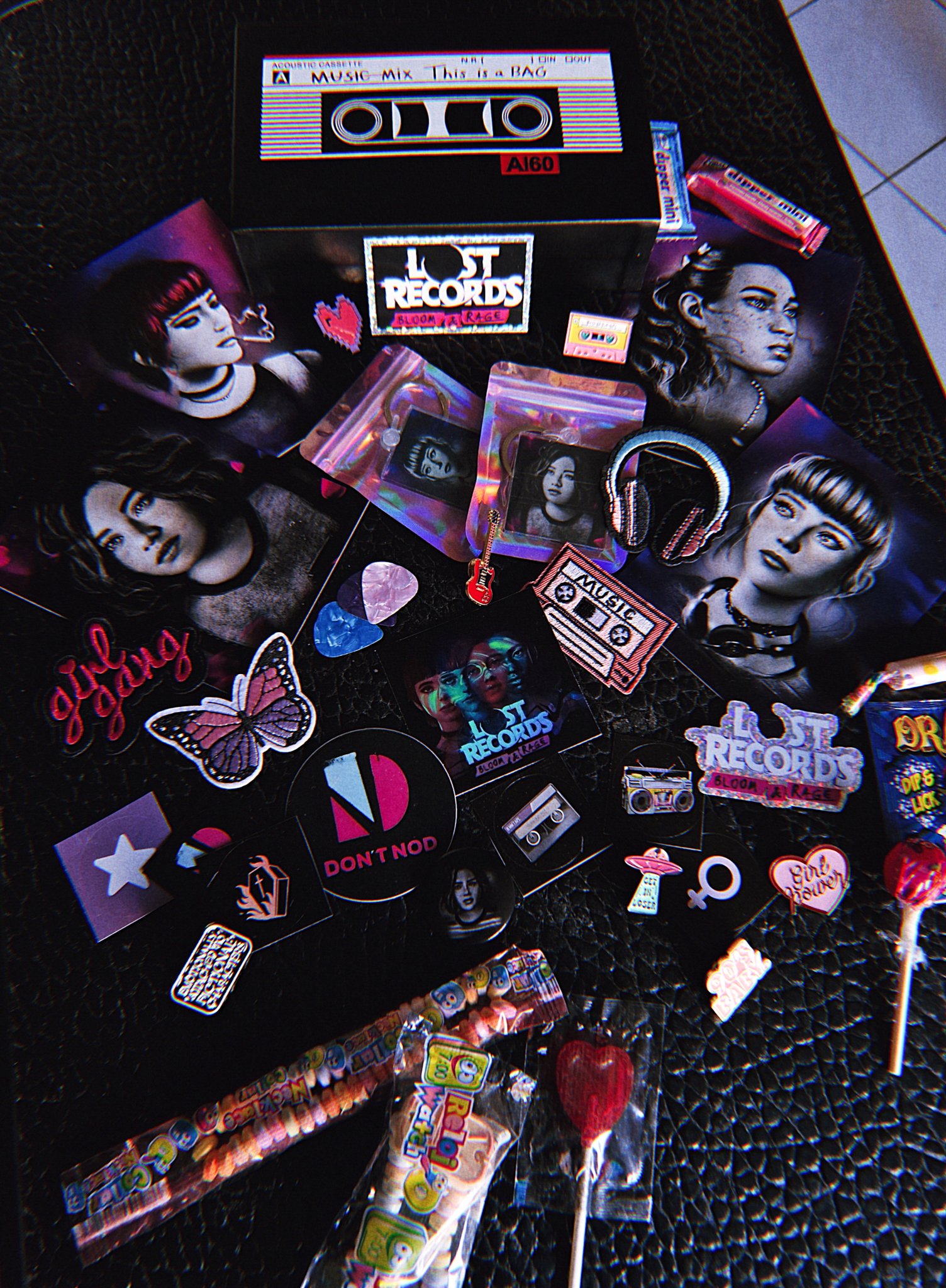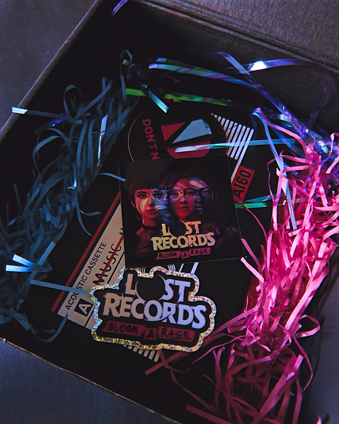 Pre-order your Lost Records: Bloom & Rage Art Box: 2 Handmade keychains, 1 holographic sticker, 1 glitter sticker, 6 mat stickers, 1 badge, 4 printed and signed Artworks. 6 x 90's Pin's, 3 custom clothes patches, 3 guitar pick, retro candies & a beautiful cassette VHS as bag!