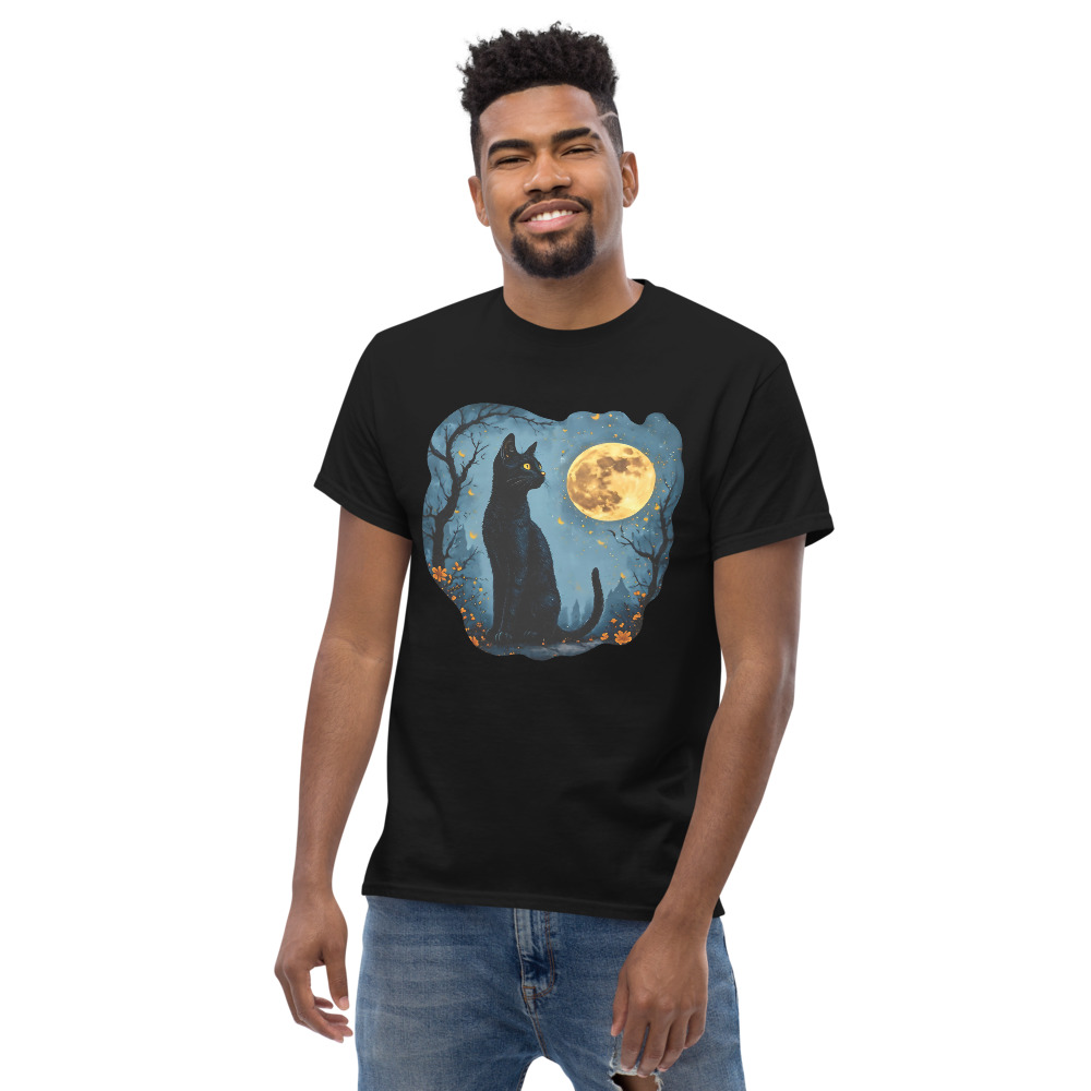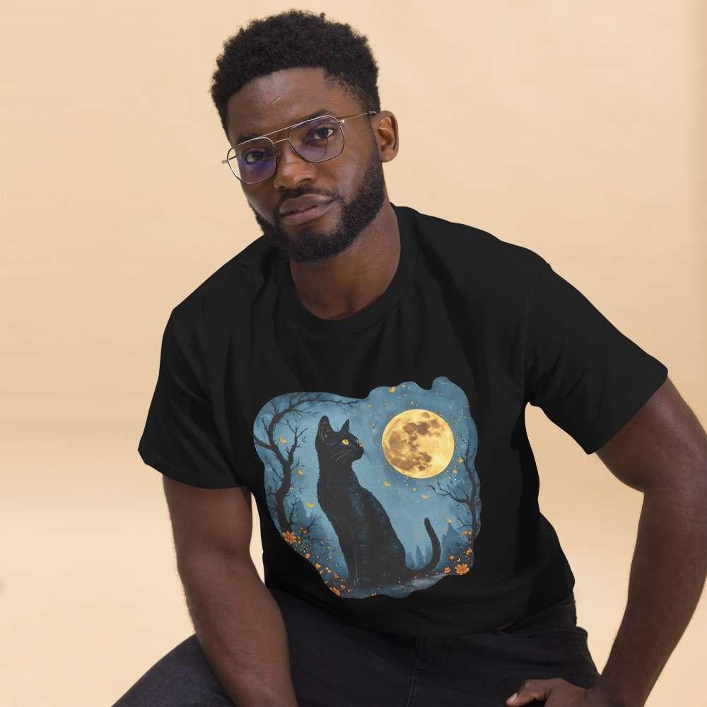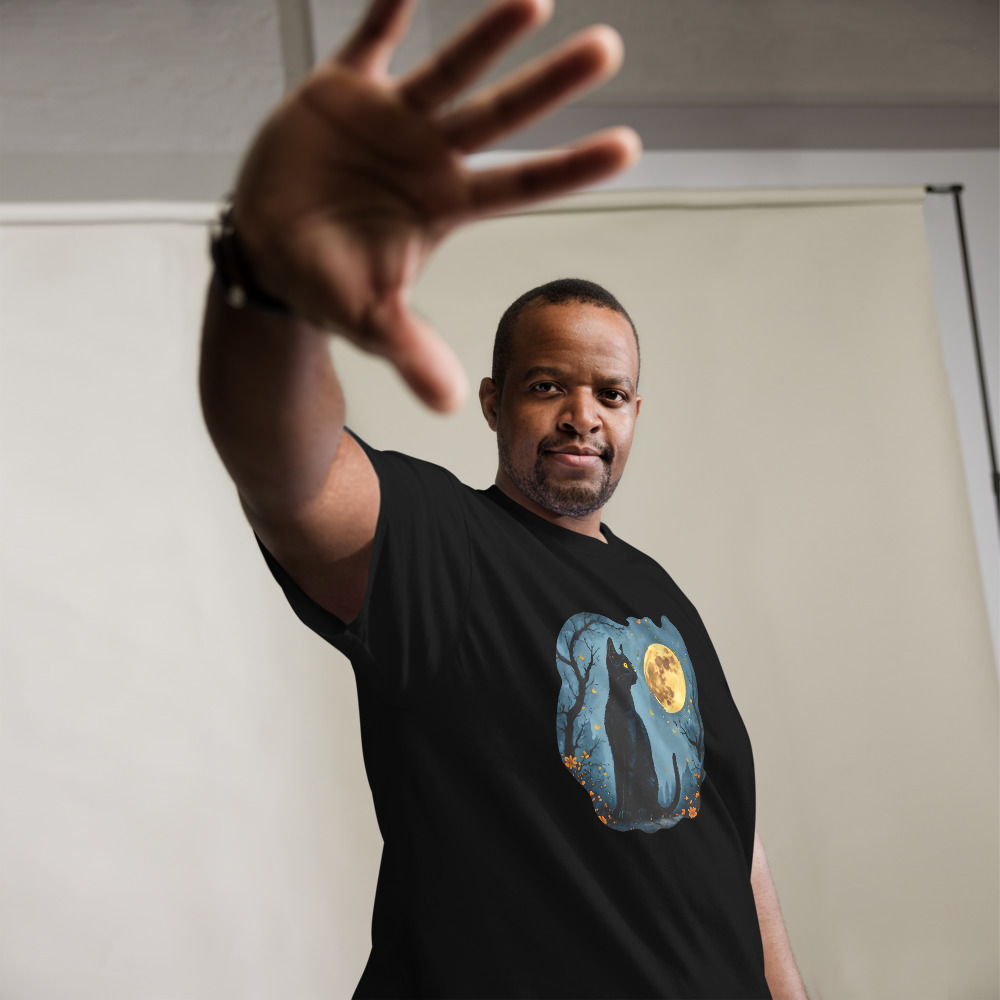 Before you lies an image that transports us into the mystical atmosphere of an enchanted forest. In the illustration, a black cat with bright yellow eyes sits at the center of attention.